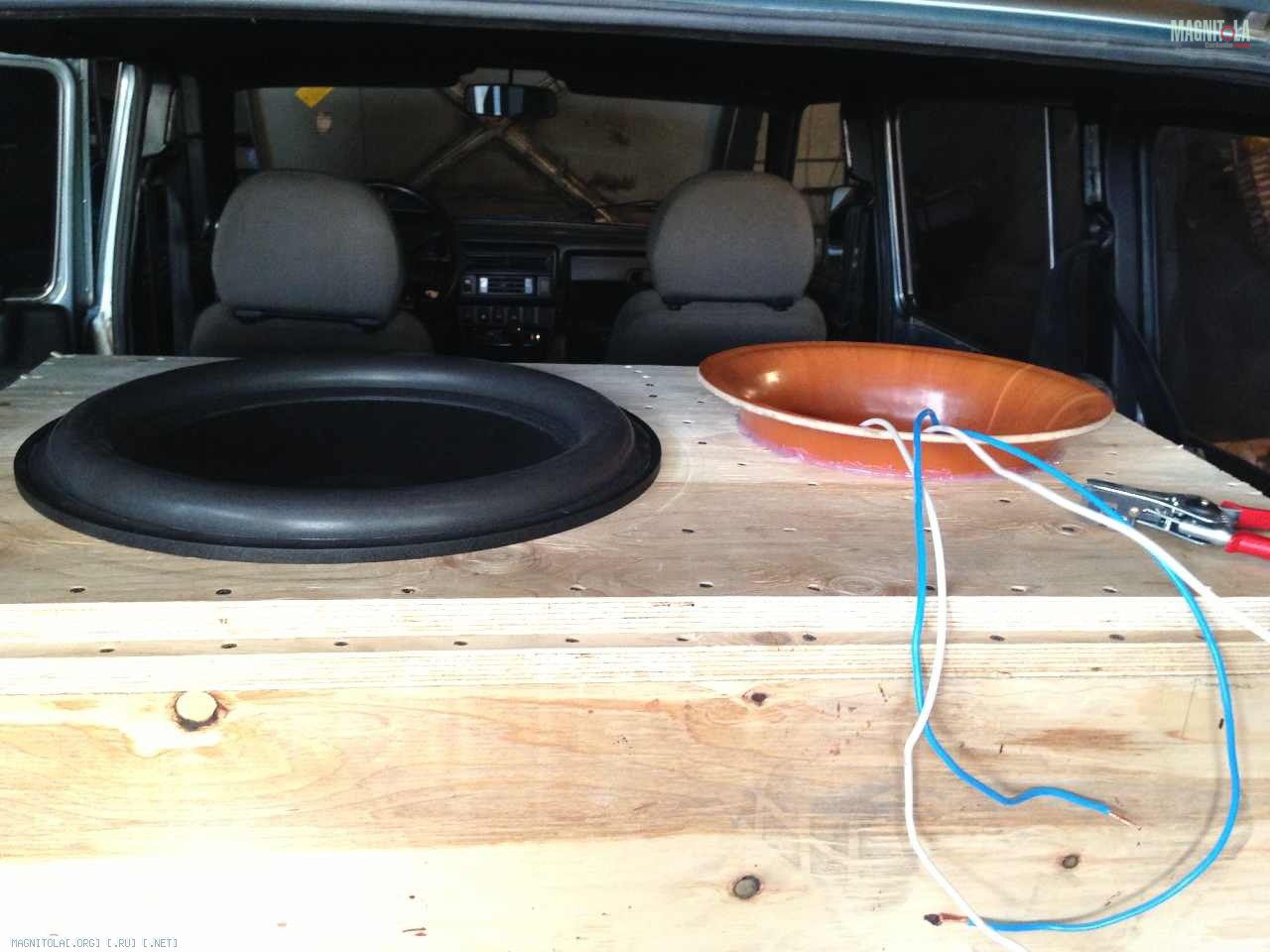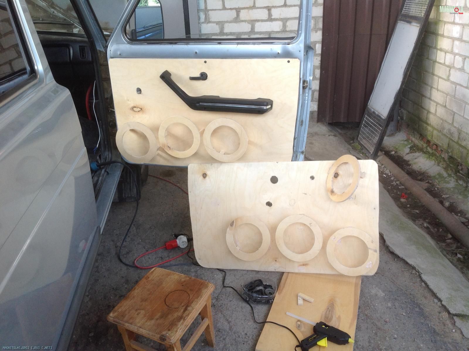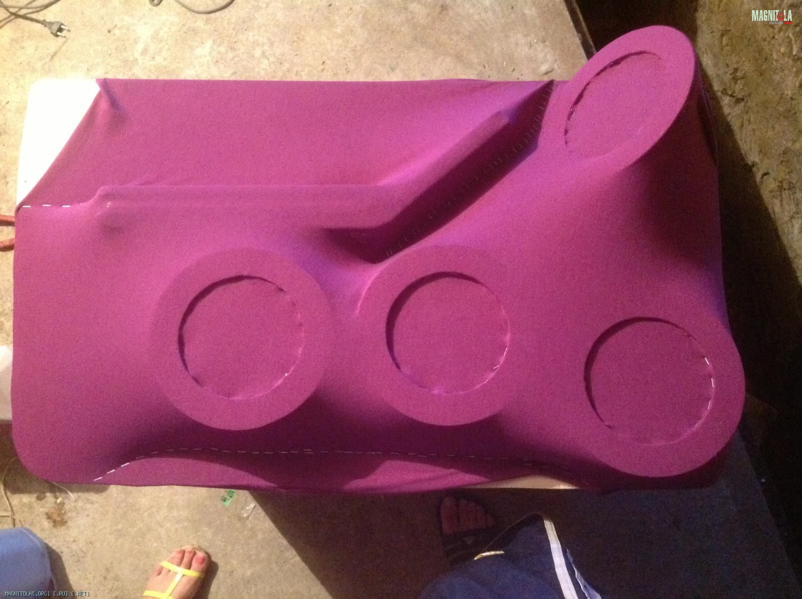 Пожалуй,начну с более Sqшной составляющей своей системы-это,безусловно,фронт. Для изготовления обшивок за основу была взята фанера 8 мм и стекловолокно.По форме двери(а сказать,что она идиотская-ничего не сказать) было вырезано основание,на которое,в последствии,были примерены и выставлены кольца из той же фанеры,которые прикрепились к основанию с помощью брусков и термоклея. Хочу заострить внимание на довороте динамиков( а конкретно,на каждой двери по одной),а именно,для чего все это было сделано. Ноэма-великолепнейший динамик за смешные деньги с двумя минусами:первый это вес(об этом чуть позже),второй-узкая диаграмма направленности.У данной модели,как и у всех широкополосников, добиться максимально качественного звучания возможно ТОЛЬКО при довороте прямо в ухи.Даже незначительное отклонение от оси,направленной на ухо))),приводит,как к снижению верхней границы частотного диапазона,так и смещению сцены.Идеального направления мне,к сожалению,добиться так и не удалось т.к. данный тип работ выполнялся мною впервые,со всеми вытекающими.На фото обшивки в процессе разработки.Далее,после того,как все кольца были выставлены,все обтянулось тканью,по своим свойствам более-менее похожей на лайкру. После,на внешнюю часть обшивки был нанесен один слой полиэфирной смолы для придания жесткости конструкции и,в последствии, вся конструкция была усилена тремя слоями 450 стекломата. Как итог,думаю,на получившейся обшивке можно стоять двумя ногами,но я побоялся пробовать:)