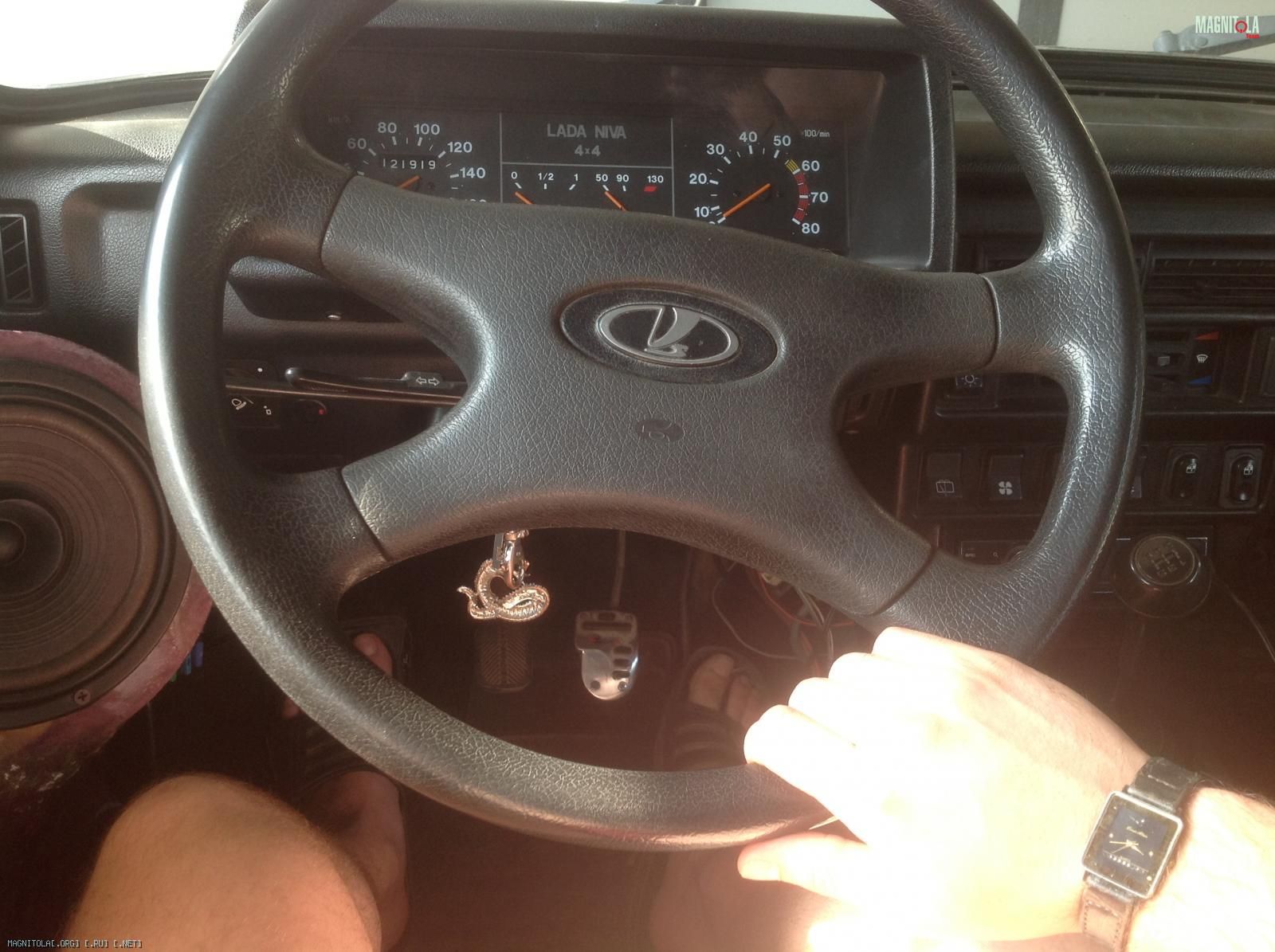 Внешний вид обшивок не доведен до конца за отсутствием желания его дорабатывать после запуска системы))) Итогово хочу просто покрыть чем-нибудь вроде антигравия черного цвета с большой шероховатостью(нива,все же,алькантара и прочие нам ни к чему))) ) Вопрос с шпатлевкой для выведения формы обшивки остается открыт т.к. боюсь,что шпатля просто отвалится от вибраций. Нашел в компе пару фото с уже установленными обшивками.На фото где я за рулем просьба не обращать внимания на конченые часы и спортивную педаль(фото делалось с целью подкола,но и для того,чтобы показать,как дин смотрит на водителя подойдет :) ) Правое фото неудачно сделано: дин на самом деле довернут на водителя сильнее,чем кажется.