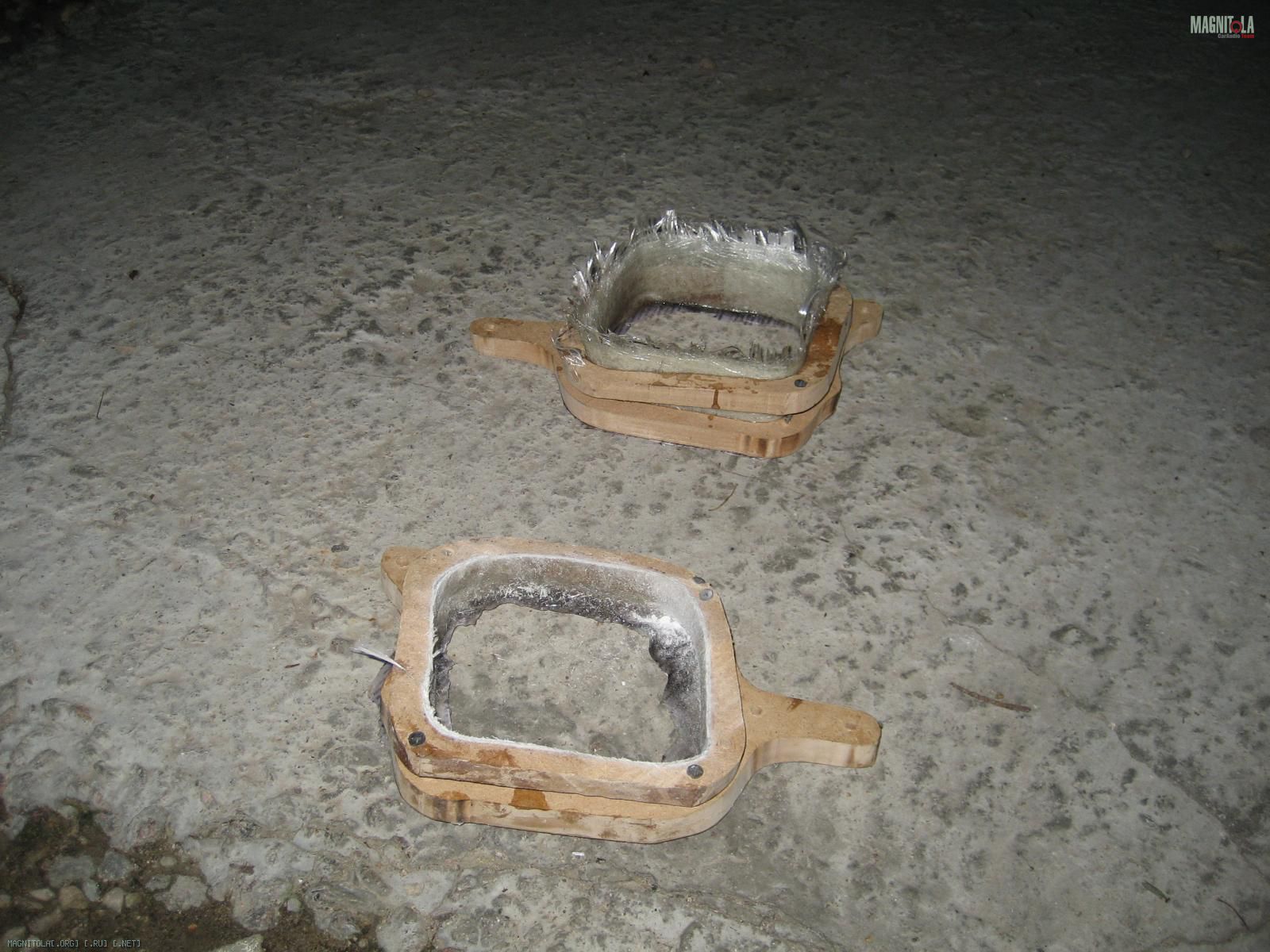 Тем временем работа продолжается. Делаем внутренние подиумы. В погоне за низким весом основа из МДФ получилась довольно субтильной. Собрал основу на саморезах, подгонял болгаркой. Внутренную поверхность, где будет идти звуковая волна от задней поверхности динамика, оклеил несколькими слоями стеклоткани и стекломата, было непросто. Края, лишнюю волосню обрезал болгаркой. Результат впечатлил - подиум вышел очень прочным и на удивление лёгким.