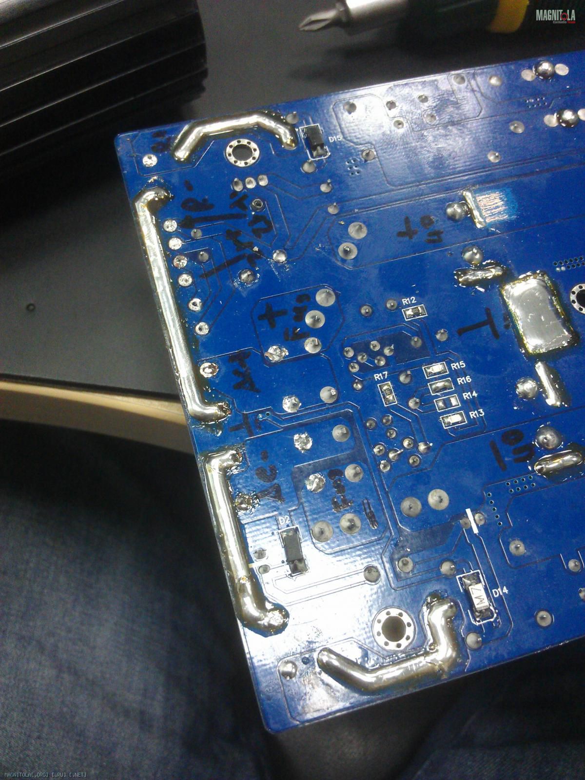 Места пайки для питающих проводов выбираем как можно ближе к потребителям - красивые колбочки-предохранители я нафик обошёл. На кой они нужны тут, если дядь Федин БП далеко не максимально возможное для TA3020 напряжение выдаёт и обладает собственным предом? Только лишние потери будут.
