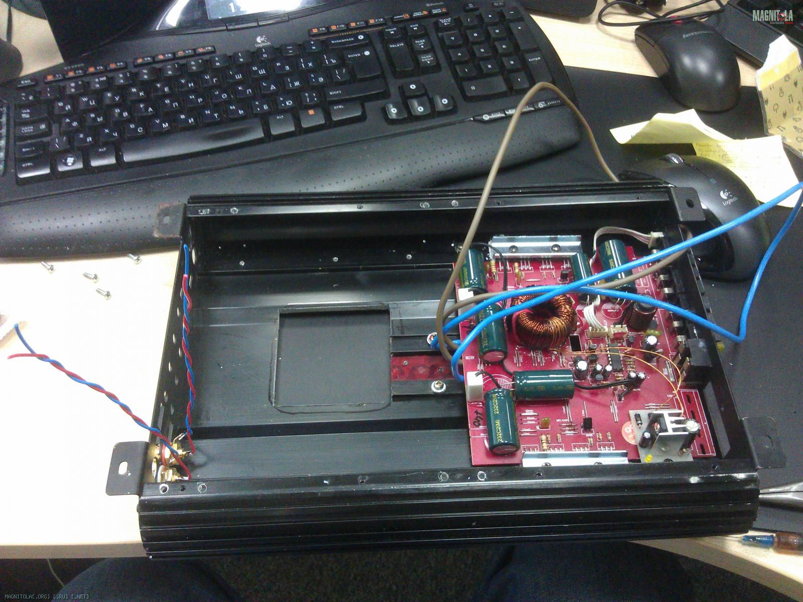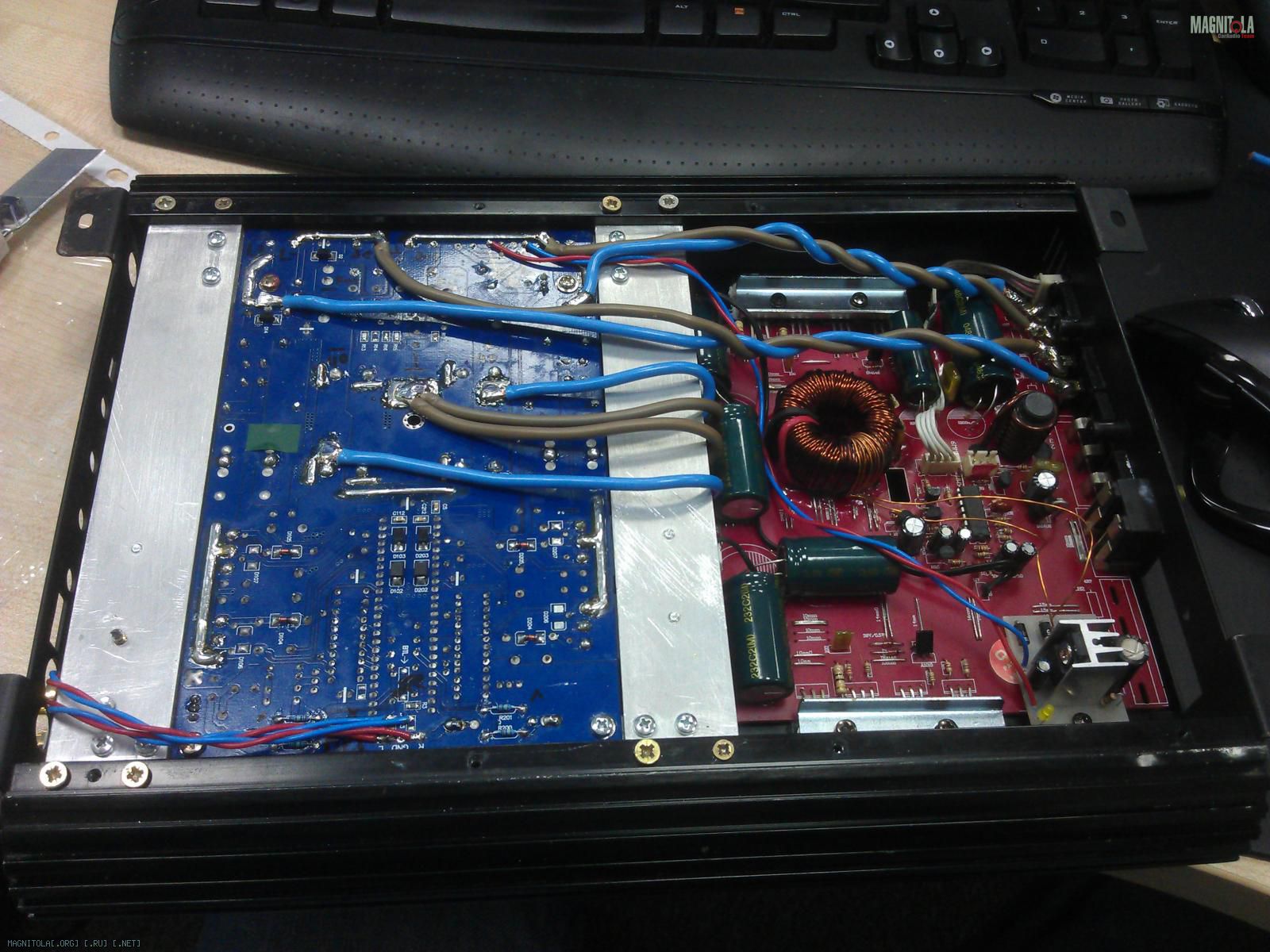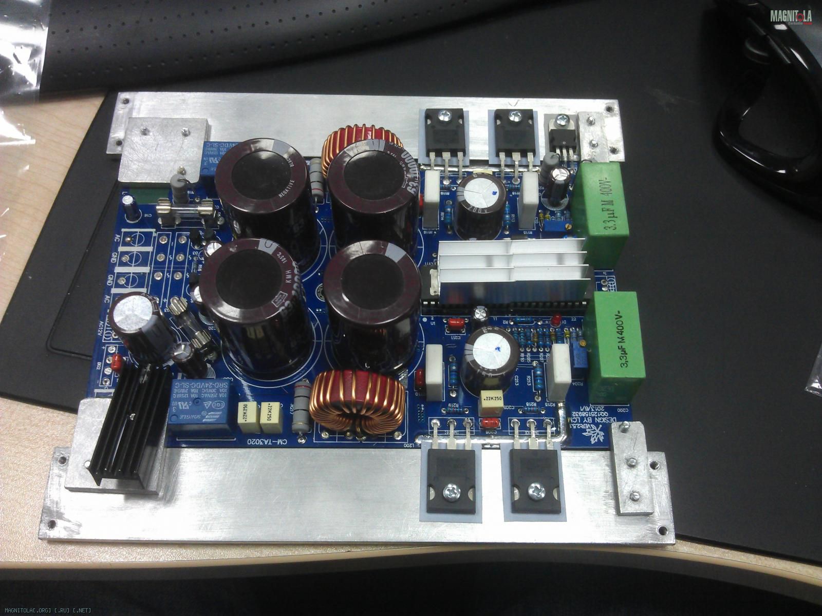 Модуль собран на чипе Tripath TA3020, который импульсно "дёргает" четыре мосфета IRFP4227. На выходе мосфетов - фильтр в виде индуктивности, и пары кондёров, которые играничивают сигнал сверху где-то далеко за границами звукового диапазона. В общем, почти обычный цифровой усилок, только с особым корейским алгоритмом выбора частоты дискретизации (наверное правильно обозвать это по-другому, но я не знаю как:)), когда частота не постоянна, как, у, скажем, Дкласса от альпайна или пиванера, а плавающая.