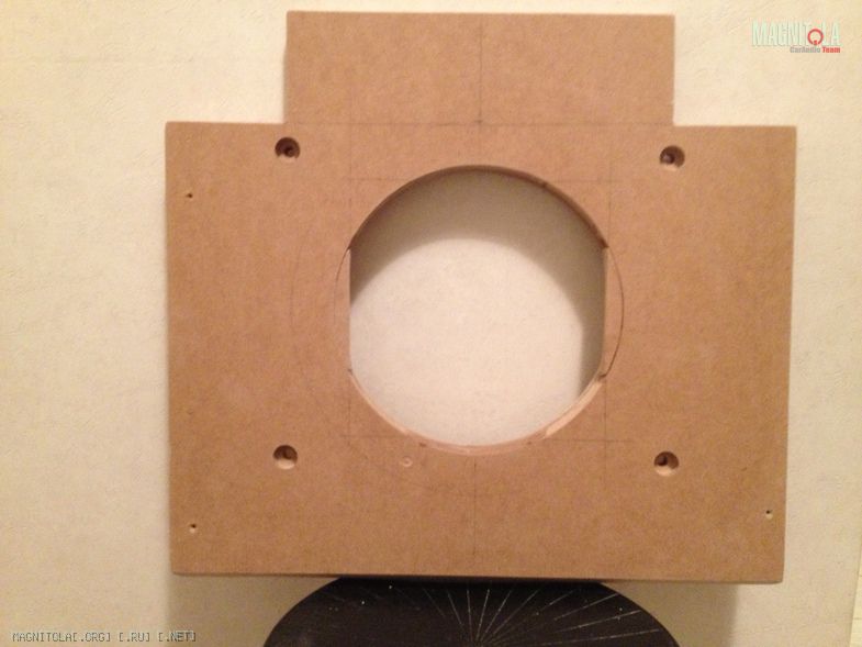 В итоге, стенка эта получилась съёмной, с внутренним диаметром по внешнему диаметру подвеса динамика. И крепится она к лицевой стенке корпуса саба четырьмя болтами М8 в закладные усовые гайки, забитые во второй, внешний слой лицевой стенки корпуса.