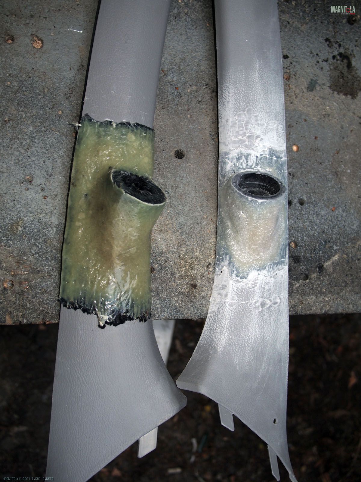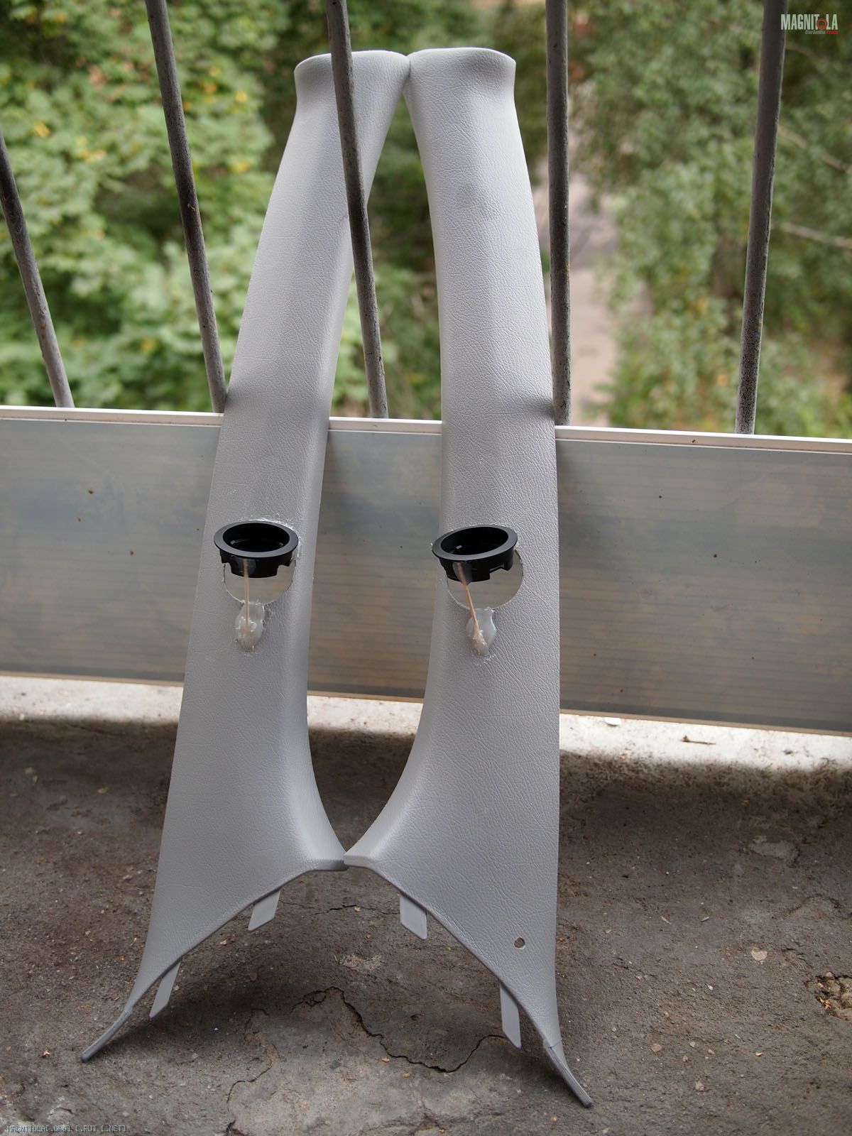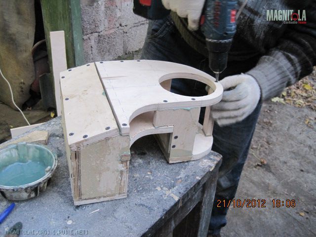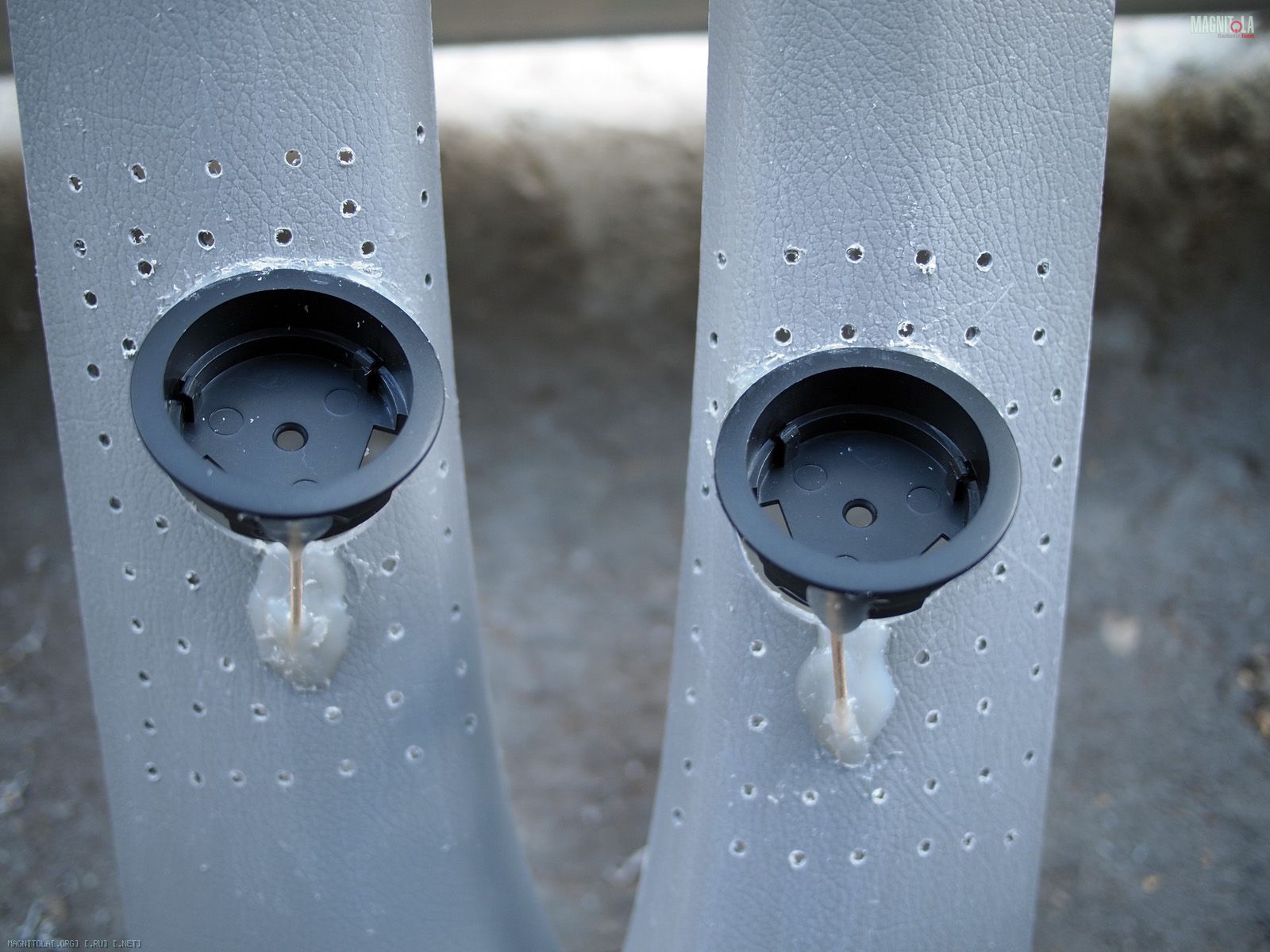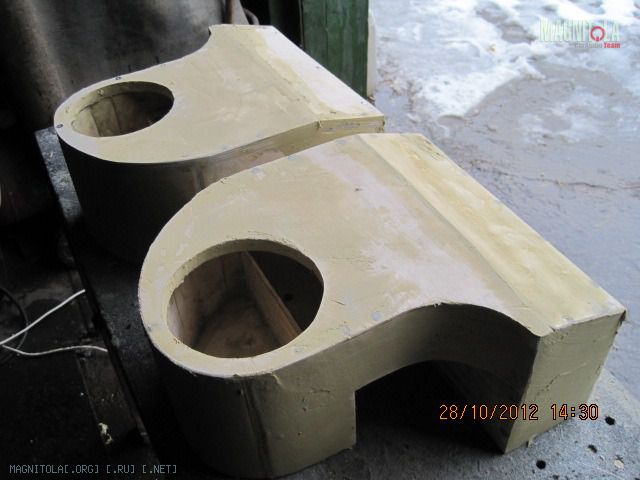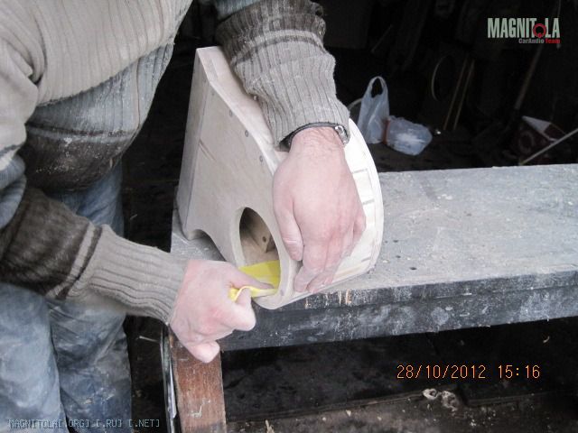 Вложение 321604 Первое что делаем - выбираем положение и направление твитеров. Мне понравилось расположение немного ниже середины и на 2 пальца выше козырька торпедо. Направлены между подголовниками передними, не в морду. Сделано отверстие коронкой 51мм в диаметре и термоклеем закреплена чашка на выбранном направлении. Потом добавилась подпорка из зубочистки на всякий случай, чтоб не изменилось направление при натяжение колготок. Вложение 321606 Далее сверлим отверстия по периметру для лучшей так сказать сращиваемости и задания той формы стойкам, которая мне хочется. Если есть Праймер - обрабатываем им чистую и обезжиренную поверхность. У меня под рукой не оказалось случайно. Вложение 321608 Идем к жене и требуем выдачи в расход 1 пару зимних толстых колгот и можно даже с рисунком. Получить можно не сразу, но т.к. у меня жена привыкла уже к виду стоек и знает что и как - отдала без сожаления. Рекомендуется использовать лайкру - теже треники http://matizclub.net/public/style_em..._smiles/ok.gif . Или купить отдельно ткань. Хомячка он же карпет не советую натягивать - работать по нему не ахти. Режим колготы на 2 части и натягиваем не сильно на стойки. Смотрим - не нравится, т.к. получается весьма широкий от края до края стойки подиум. Мне захотелось, чтоб ровненько как труба выходил подиум из стойки. Поэтому - пришиваем капроновыми нитками через имеющиеся отверстия. далее по центру чашки натягиваем сильно, чтобы было как можно ровнее. Накручиваем лишнее и фиксируем хомутом пластиковым одноразовым накрученное. Вложение 321610 Т.к. будем использовать полиэфирку и стекломат, то уезжаем из дома к дяде Славе в гараж. Кстати все сделано на базе его гаража, за что ему отдельный респект и спасибо. Итак берем голубую корабельную полиэфирку, разводим с отвердителем и пропитываем колготы немного выше нашитого. Оставляем и готовим стеклоткань к работе. Стекломат взят 600 и его нарезаем кусочками в длину 5-7 см и ширину 2-5 см. Выкладываем на поддон и пропитываем полиэфиркой густо. Пропитали - укладываем поверх уже пропитанного слоя колгот и кисточкой щательно, очень щательно томпонируем. Иногда добавляем полиэфирки. Чтобы не образовывались воздушные пузыри. Так было наложено 2 слоя стекломата 600 сразу. Далее фен, 300-350 градусов и ускоряем процесс полимеризации. Но тоже с головой - не перегревая. Как только появятся пузырики, то все перестарались. Потом их зашкуривать будет муторно и может подняться слой стекломата. Оставляем на пол часа или немногим более и не трогаем пока не встанет камнем. Ничего не срезаем и не трогаем. Иначе можно получить отхождение от пластика. Пластик - обычный ПП. Вложение 321612 Встало камнем - срезаем аккуратно остатки колгот и ниток не поддевая за края. Далее идем на точило, запускаем и выполняем предварительную огранку - стачиваем. На фото видно стойку до и после. Если всетаки подиум отошел от пластика, то не стоит огорчаться. Берем супер-клей (мне больше нравится гель) и в отошедшие места по самое далеко заполняем. Ждем минуту две и в принципе ликвидируется сие огорчение. После предварительной грубой огранки можно еще Дремелем или крупной шкуркой довести до ума. Шпаклюем. Я взял полиэфирную шпаклевку по пластику - для бамперов. Работать также в удовольствие ей. Сделано было 3 слоя, чтобы прийти к требуемым превышениям не более плюс-минус 0,25 мм. Последний слой выведен шк