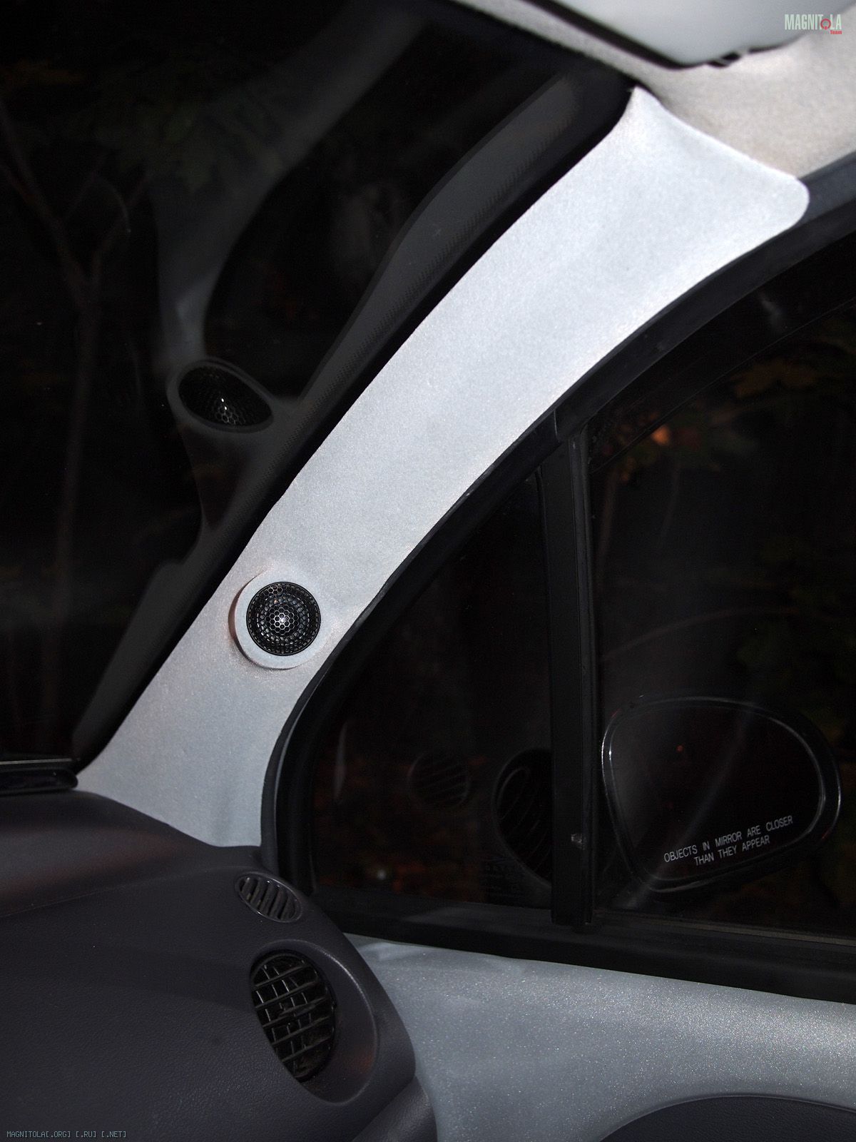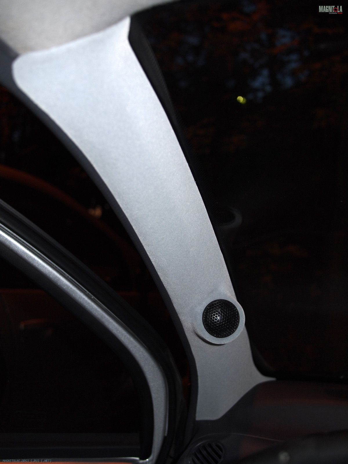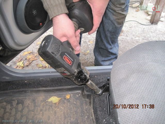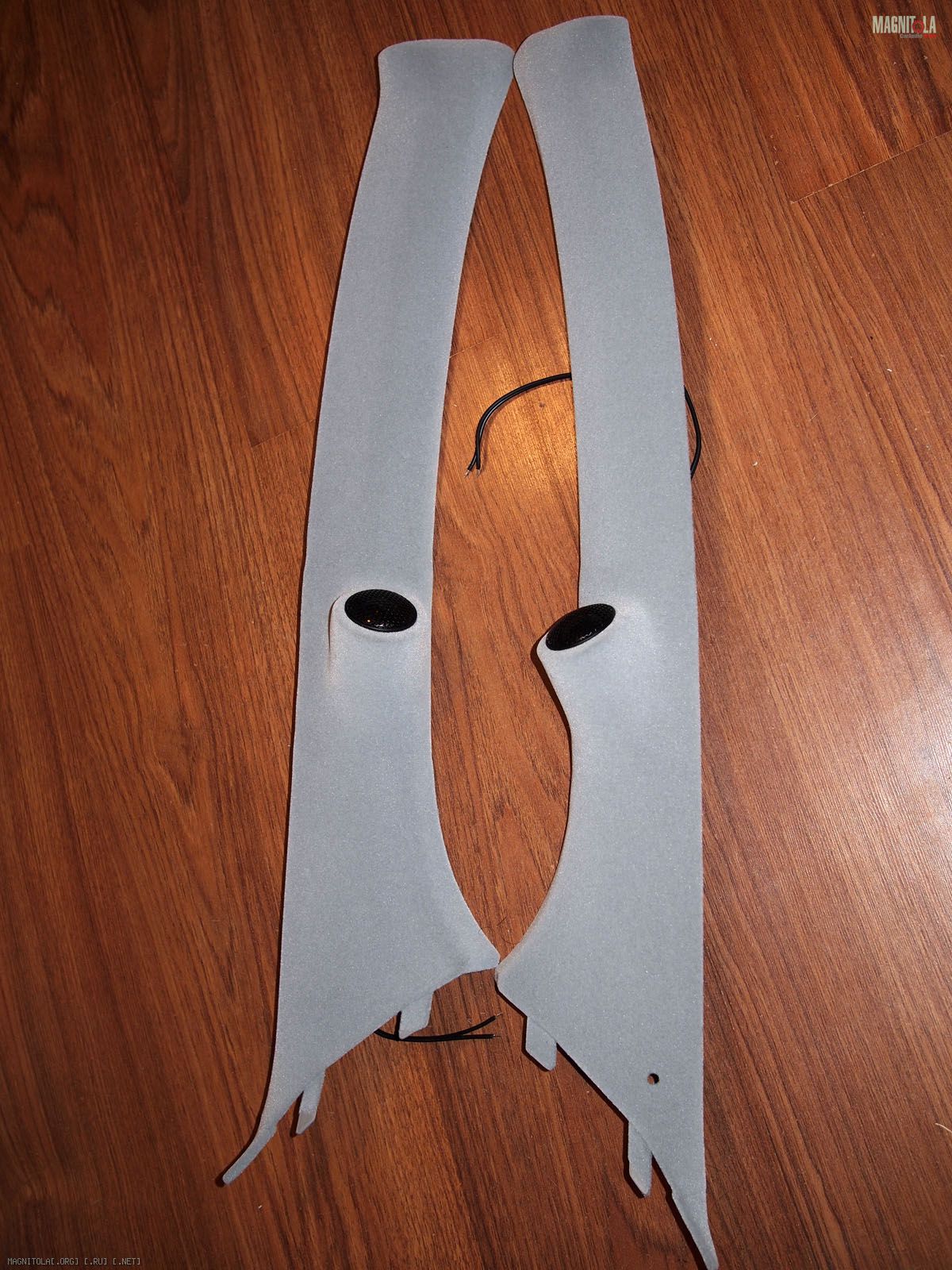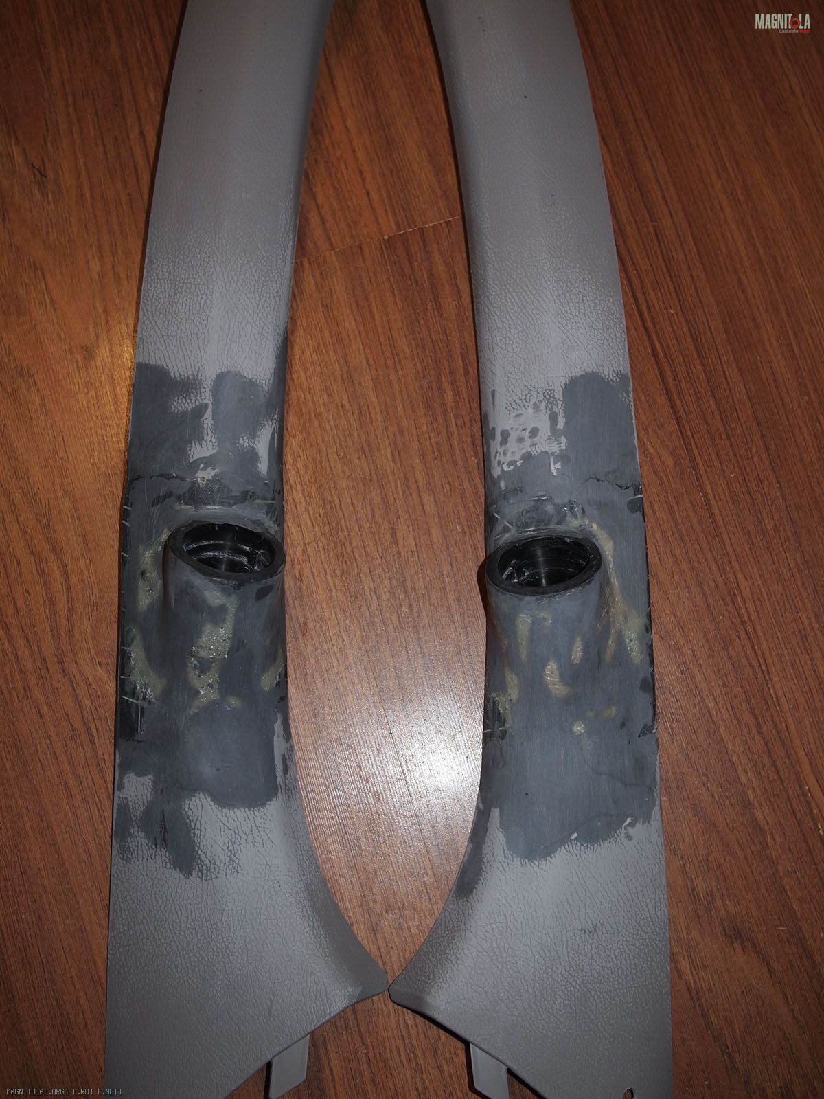 Вложение 321604 Первое что делаем - выбираем положение и направление твитеров. Мне понравилось расположение немного ниже середины и на 2 пальца выше козырька торпедо. Направлены между подголовниками передними, не в морду. Сделано отверстие коронкой 51мм в диаметре и термоклеем закреплена чашка на выбранном направлении. Потом добавилась подпорка из зубочистки на всякий случай, чтоб не изменилось направление при натяжение колготок. Вложение 321606 Далее сверлим отверстия по периметру для лучшей так сказать сращиваемости и задания той формы стойкам, которая мне хочется. Если есть Праймер - обрабатываем им чистую и обезжиренную поверхность. У меня под рукой не оказалось случайно. Вложение 321608 Идем к жене и требуем выдачи в расход 1 пару зимних толстых колгот и можно даже с рисунком. Получить можно не сразу, но т.к. у меня жена привыкла уже к виду стоек и знает что и как - отдала без сожаления. Рекомендуется использовать лайкру - теже треники http://matizclub.net/public/style_em..._smiles/ok.gif . Или купить отдельно ткань. Хомячка он же карпет не советую натягивать - работать по нему не ахти. Режим колготы на 2 части и натягиваем не сильно на стойки. Смотрим - не нравится, т.к. получается весьма широкий от края до края стойки подиум. Мне захотелось, чтоб ровненько как труба выходил подиум из стойки. Поэтому - пришиваем капроновыми нитками через имеющиеся отверстия. далее по центру чашки натягиваем сильно, чтобы было как можно ровнее. Накручиваем лишнее и фиксируем хомутом пластиковым одноразовым накрученное. Вложение 321610 Т.к. будем использовать полиэфирку и стекломат, то уезжаем из дома к дяде Славе в гараж. Кстати все сделано на базе его гаража, за что ему отдельный респект и спасибо. Итак берем голубую корабельную полиэфирку, разводим с отвердителем и пропитываем колготы немного выше нашитого. Оставляем и готовим стеклоткань к работе. Стекломат взят 600 и его нарезаем кусочками в длину 5-7 см и ширину 2-5 см. Выкладываем на поддон и пропитываем полиэфиркой густо. Пропитали - укладываем поверх уже пропитанного слоя колгот и кисточкой щательно, очень щательно томпонируем. Иногда добавляем полиэфирки. Чтобы не образовывались воздушные пузыри. Так было наложено 2 слоя стекломата 600 сразу. Далее фен, 300-350 градусов и ускоряем процесс полимеризации. Но тоже с головой - не перегревая. Как только появятся пузырики, то все перестарались. Потом их зашкуривать будет муторно и может подняться слой стекломата. Оставляем на пол часа или немногим более и не трогаем пока не встанет камнем. Ничего не срезаем и не трогаем. Иначе можно получить отхождение от пластика. Пластик - обычный ПП. Вложение 321612 Встало камнем - срезаем аккуратно остатки колгот и ниток не поддевая за края. Далее идем на точило, запускаем и выполняем предварительную огранку - стачиваем. На фото видно стойку до и после. Если всетаки подиум отошел от пластика, то не стоит огорчаться. Берем супер-клей (мне больше нравится гель) и в отошедшие места по самое далеко заполняем. Ждем минуту две и в принципе ликвидируется сие огорчение. После предварительной грубой огранки можно еще Дремелем или крупной шкуркой довести до ума. Шпаклюем. Я взял полиэфирную шпаклевку по пластику - для бамперов. Работать также в удовольствие ей. Сделано было 3 слоя, чтобы прийти к требуемым превышениям не более плюс-минус 0,25 мм. Последний слой выведен шк
