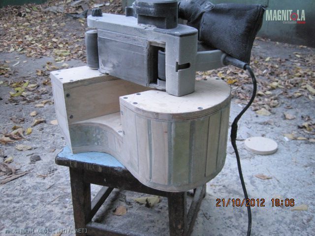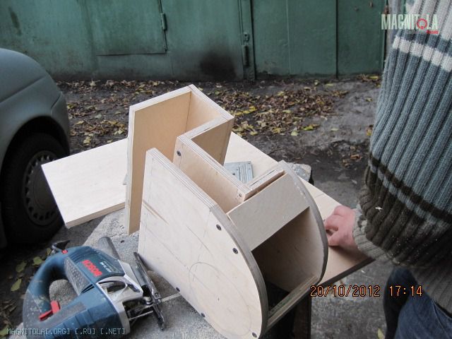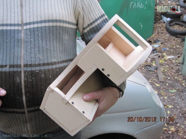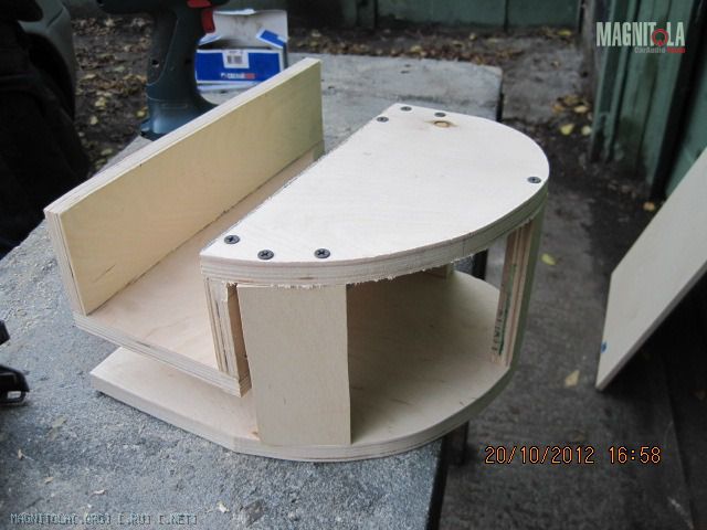 Здоровый гад и в текущий ящик именно по высоте не входил - ложился на ребро нижнее. Необходимо отметить и размер магнита, фанера 15мм - надо дать ему дышать в ящике. Поэтому был сделан такой переходник из 7-8 мм фанеры. И посадочное очко в ящике было выпилено под него также. Вложение 322250