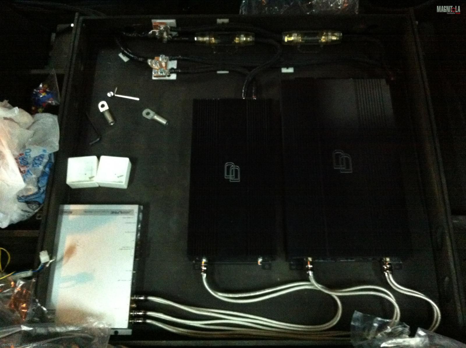 3. Соответственно, установка и подключение компонентов. Очень долго играл в "тетрис" с усилителями и процем, выбирал оптимальное расположение. После шел тяжелый процесс подключения проводов питания, т.к. КГ-35 сложно сгибается в маленьких отрезках. Провод "rem" для усилителей взят с процессора и подключен пока без силового реле. Позже добавится третий усилитель и кулеры охлаждения, вот тогда использую релюшку. Оба саба подключены параллельно и играют в 1Ом. На моноблоке имеется выносной регулятор с лампочкой клиппа, поэтому все под контролем. Сабы не греются, усилитель в защиту не уходит. Играет все замечательно, на мой слух. Осталось только немного поднастроить эквалайзер и выставить временные задержки. ГУ с процем соединены по шине Ai-Net (наводки ловит в районе соединения с ГУ), но уже есть в наличии оптический кабель. Вот только выскочила небольшая проблемка с IVA-W502R, стал плохо работать CD-привод. Диски считывает медленно, на Audio CD вообще заикается на 1-3 секунды. Попробую разобрать, посмотреть, может головка загрязнилась.