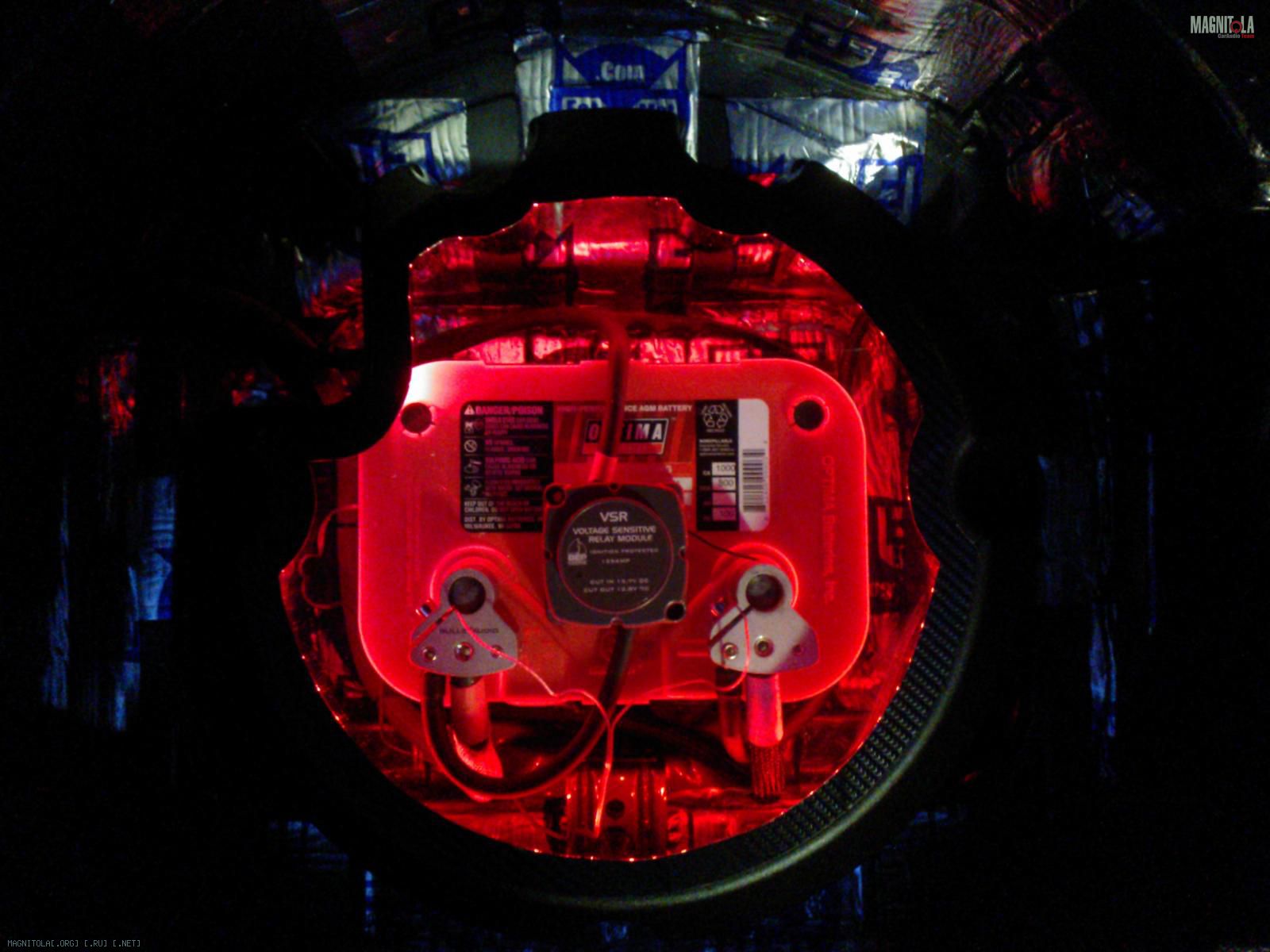 Доделал уже вторую АКБ.Тот ящик в котором стоял родной усь и саб расколол на две части,вырезал верх ящика и поставил оргстекло.Батарею обмостил бортиком из МДФ и прикрутил к металу дна,проклеил немного вибры,на верх батареи поставил реле и все ето дело подсветил красным светом.