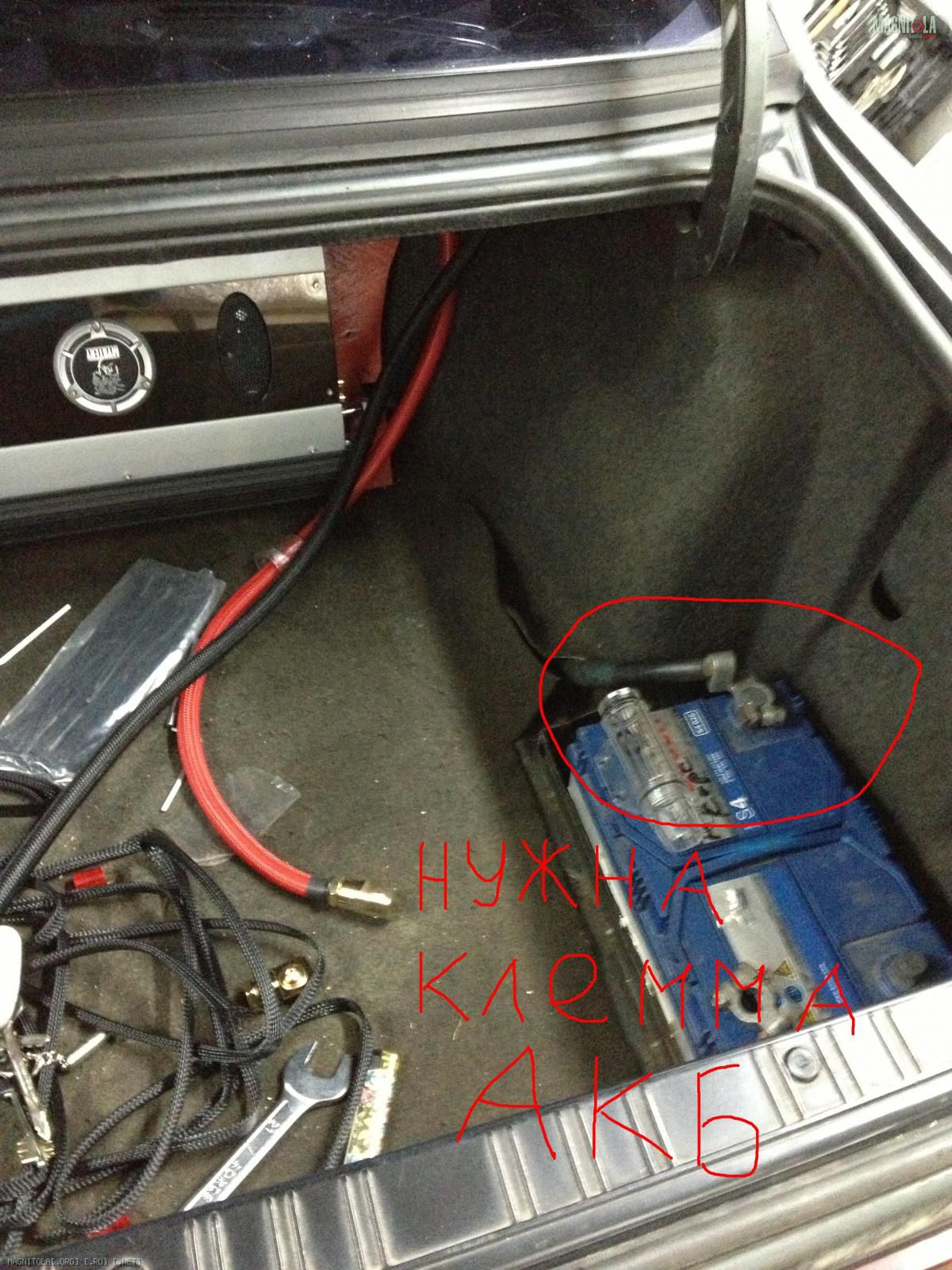 Акб в багажнике,до акб идет провод родной бмвшный 0га + мой силовой на усилки 0га. Короче не хочу колхоза. Нужна клемма акб чтоб было 2 входа Ога. Дахх смотрел-ничего не нашел. Помогите!