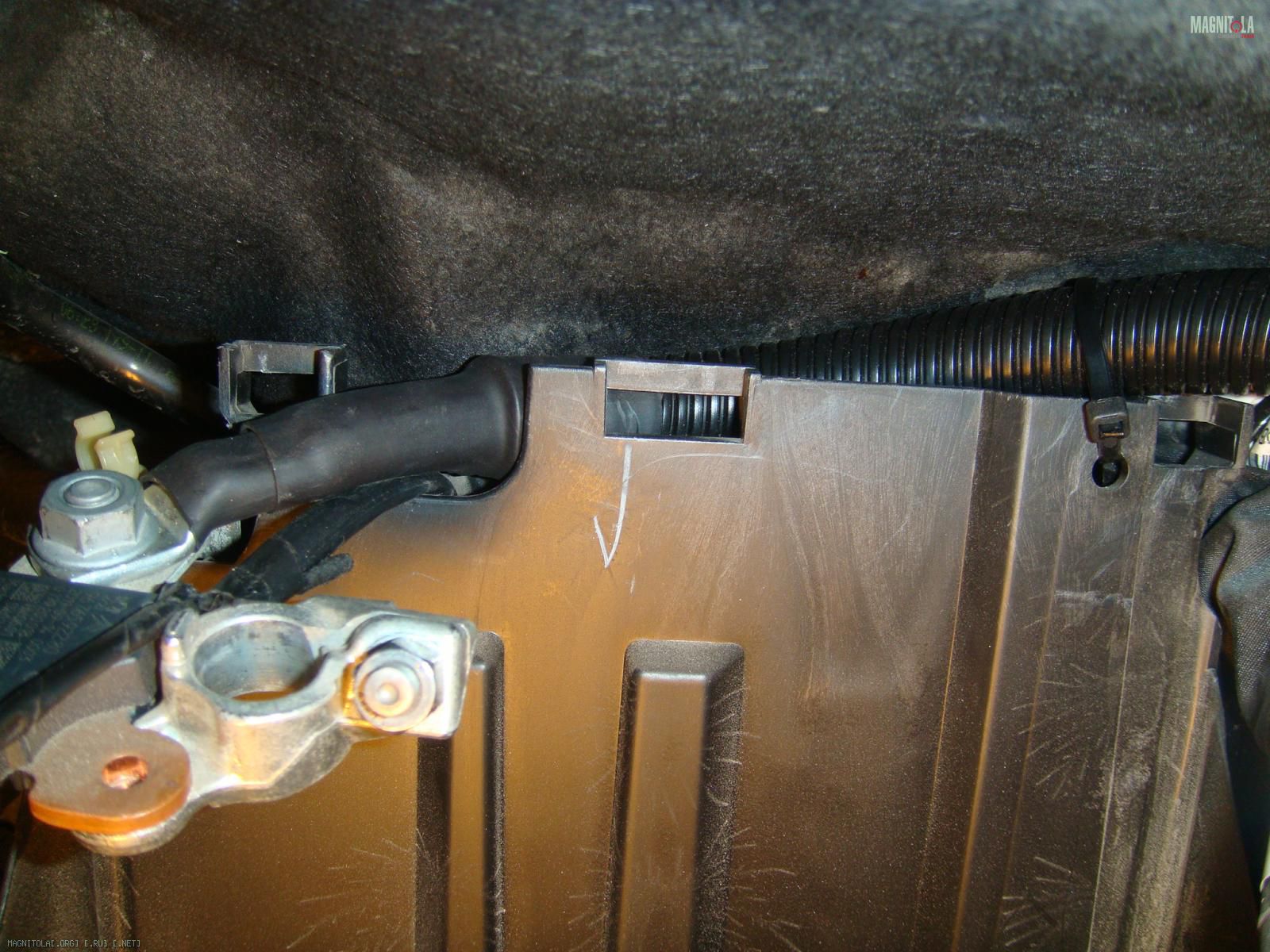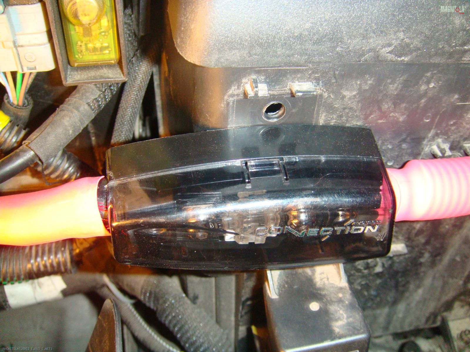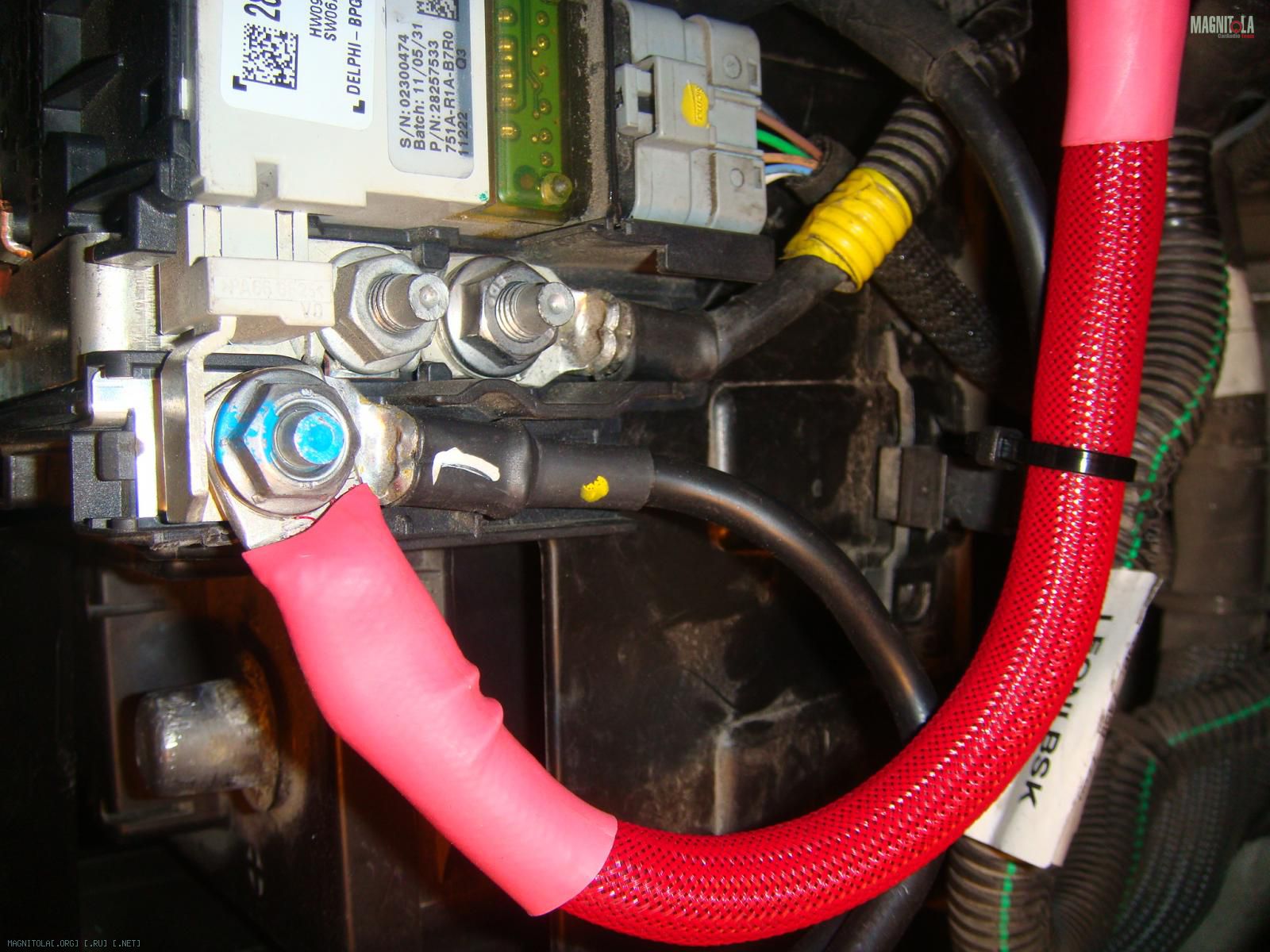 нашлось местечко и для подключения АКБ, (-) на клеме с болтовым зажимом. (+) для магнитолы на свободном предохранителе (к сожалению установлен 30А) продублирован 10амперным, (-) на клеме.