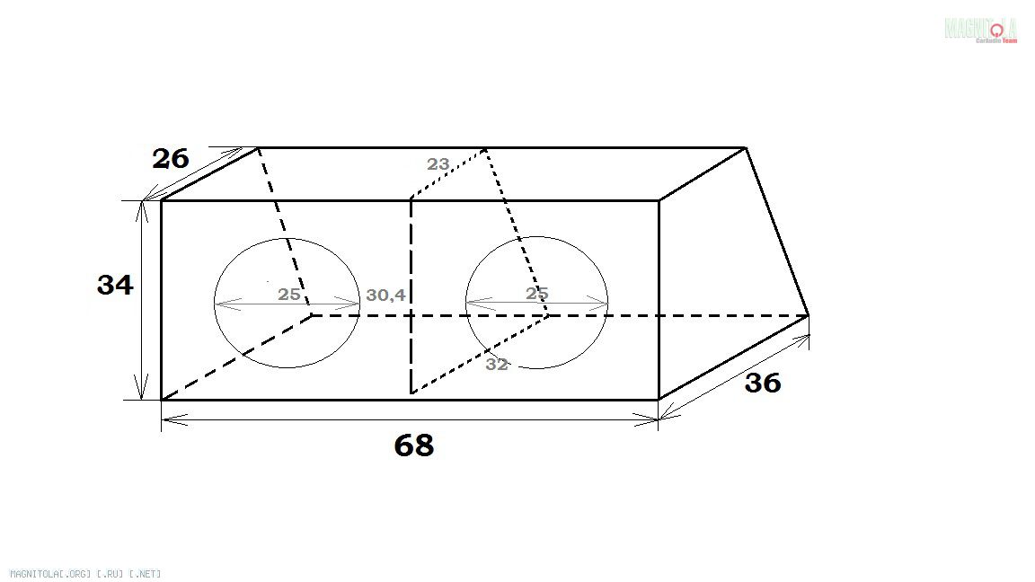 0,06265 (куб. метра) = 62,65 литра - это мы рассчитали корпус саба который полностью прямоугольный. Но у нас то задняя стенка наклонная. Если смотреть на саб с боку, то сама наклонная часть (прямоугольник) занимает 2/7 боковины. Она равняется 17,9 литрам, ... делим на пополам - 8,95 литра.