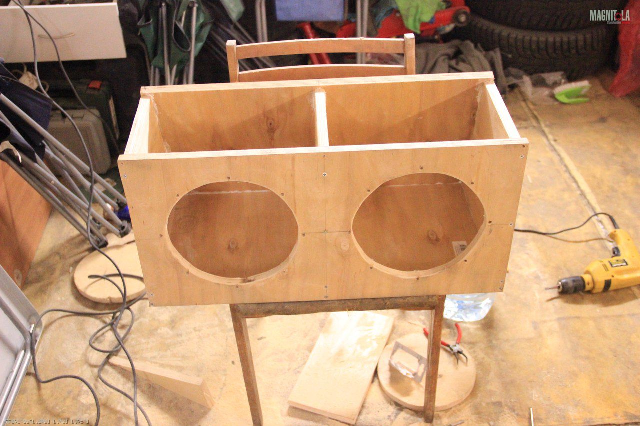 Осталось теперь загнать в ящик около 200 саморезов, усилить переднюю стенку, отшпаклевать местами и обшить красиво карпетом.