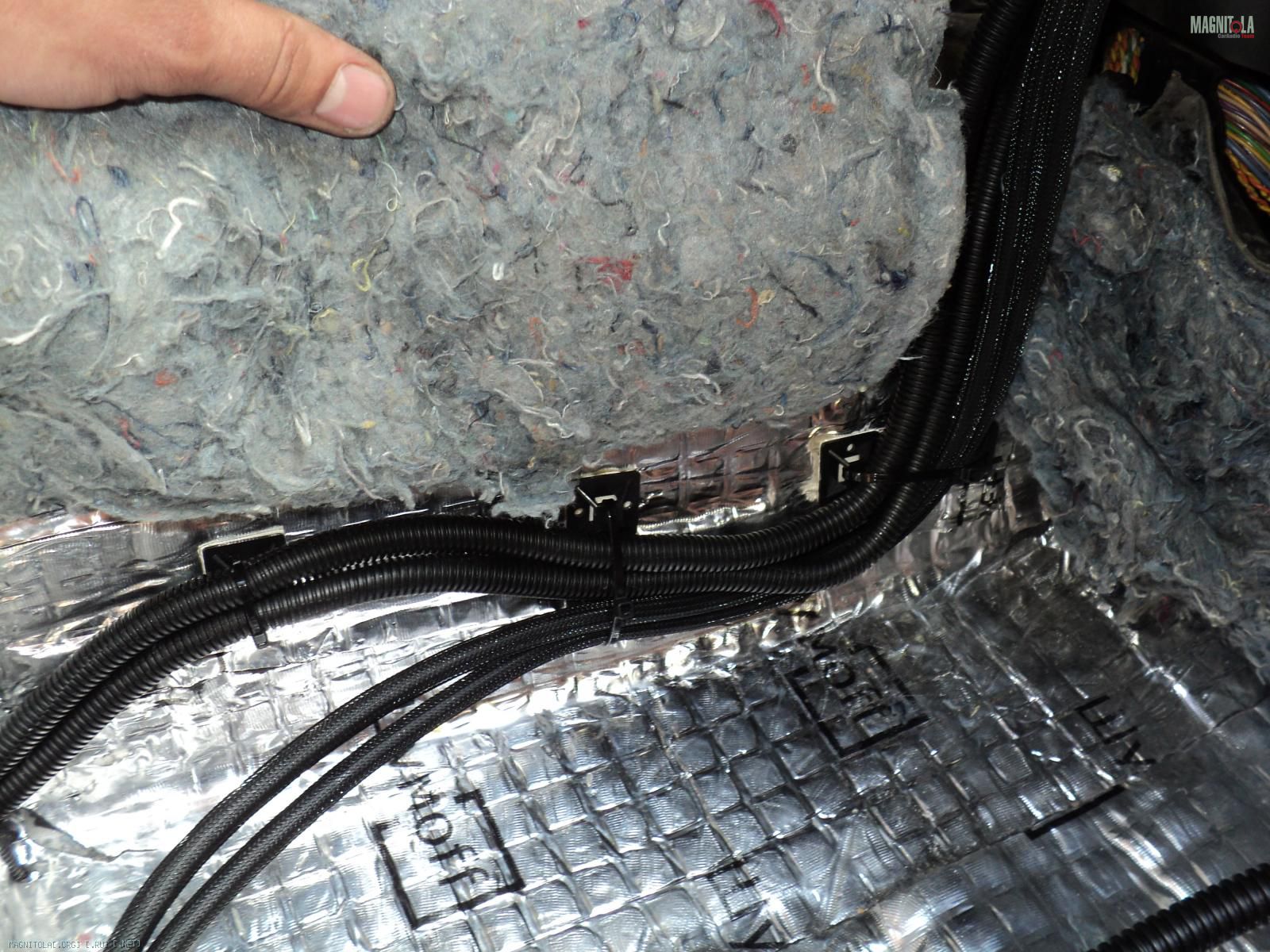 Силовые провода и ремоут прокладывал по левому борту, межблоки по центру, а кустические по правому. Все провода уложены в гофру и закреплены с помощью площадок и хомутов