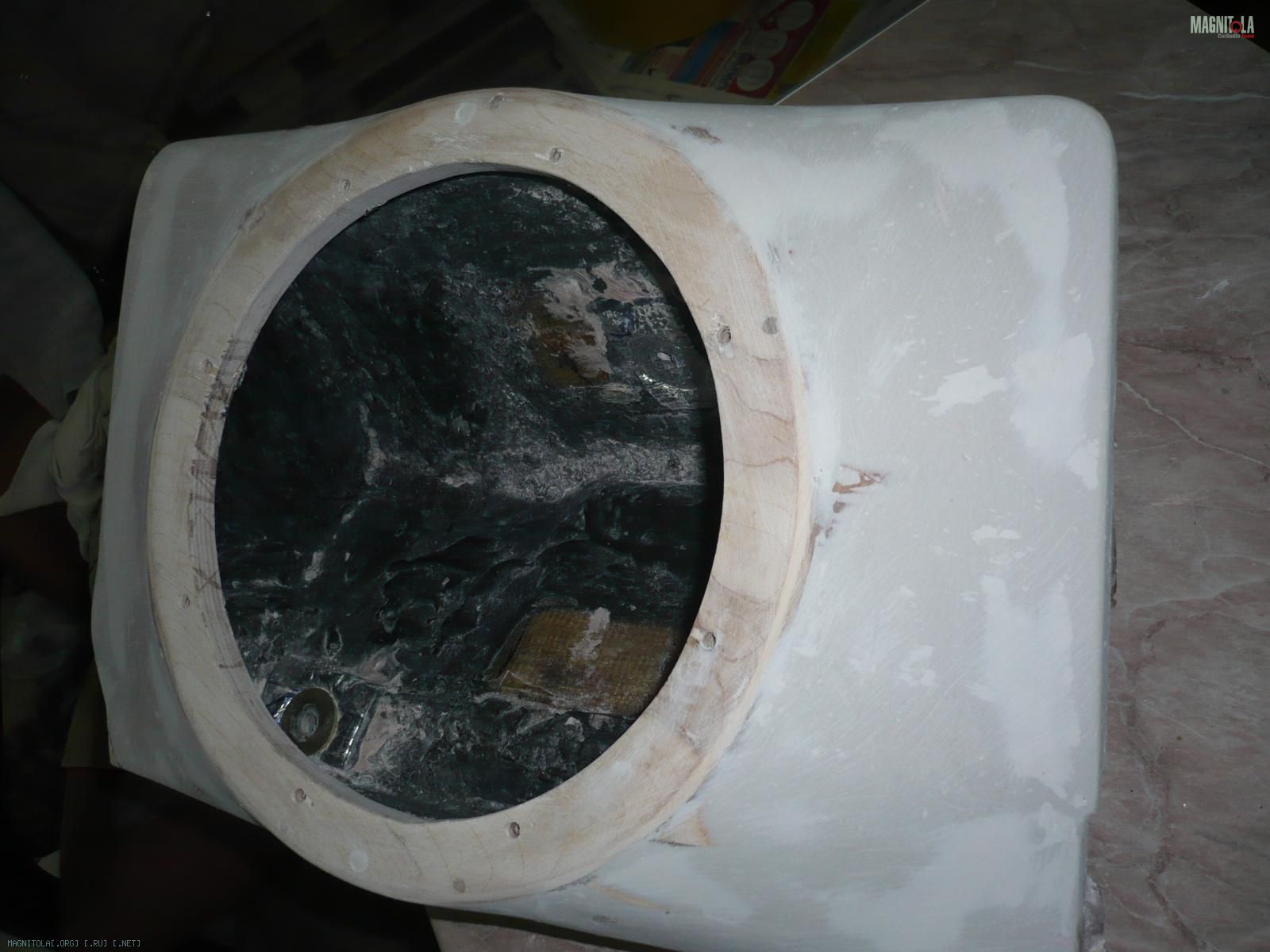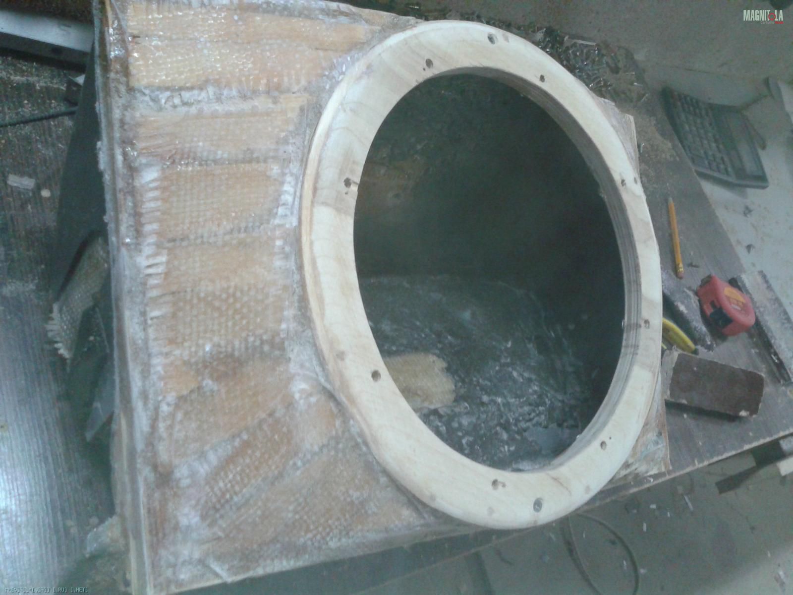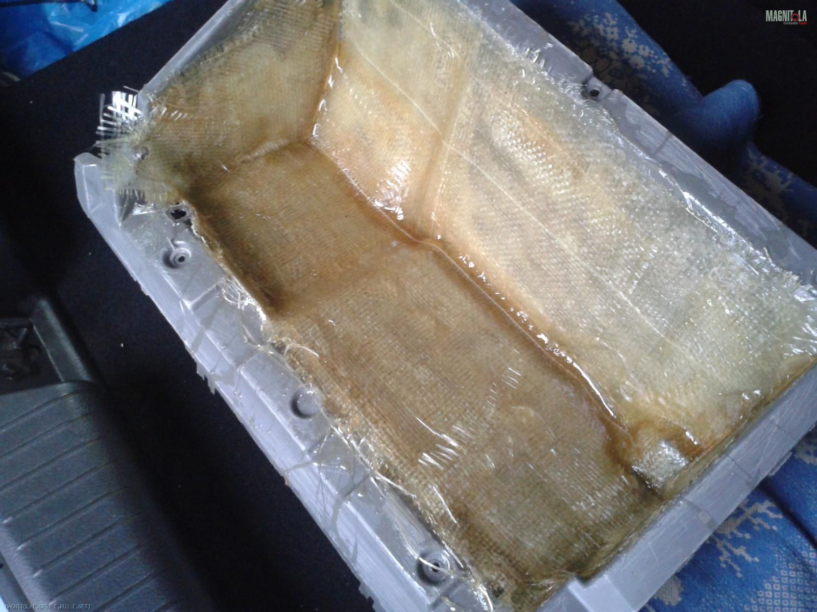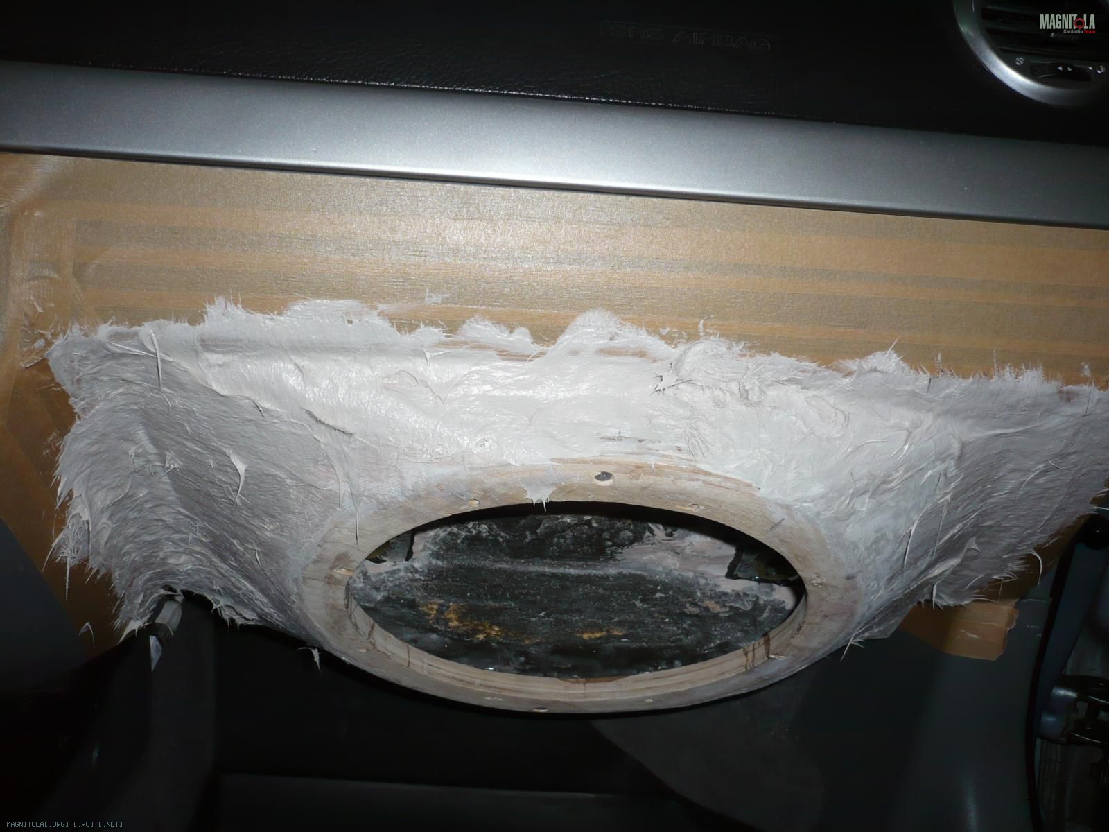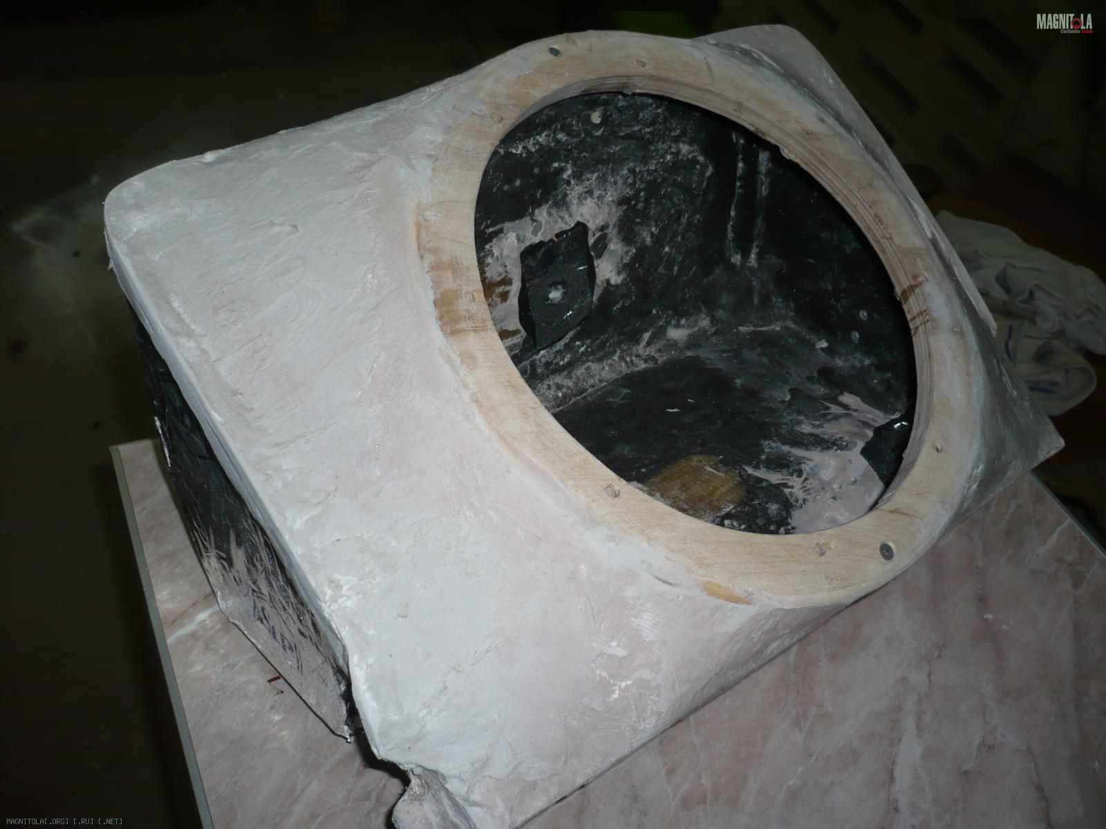 Внутри ящик промазал смесью полеэфирки с цементом. Получилось просто камень! Примерял постоянно в авто! По периметру ящика и торпедо оставил зазор(около 2 мм),что бы полностью исключить соприкосновение саба и торпедо. Крепление саба только на каркасе кузова(ну об этом чуть позже)
