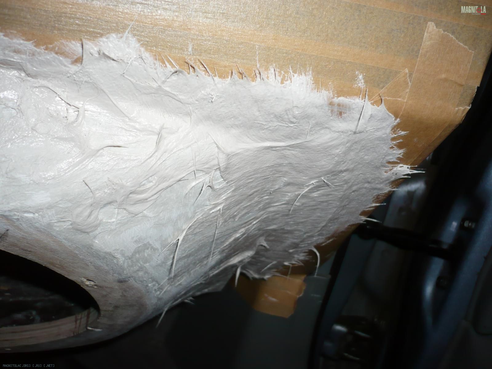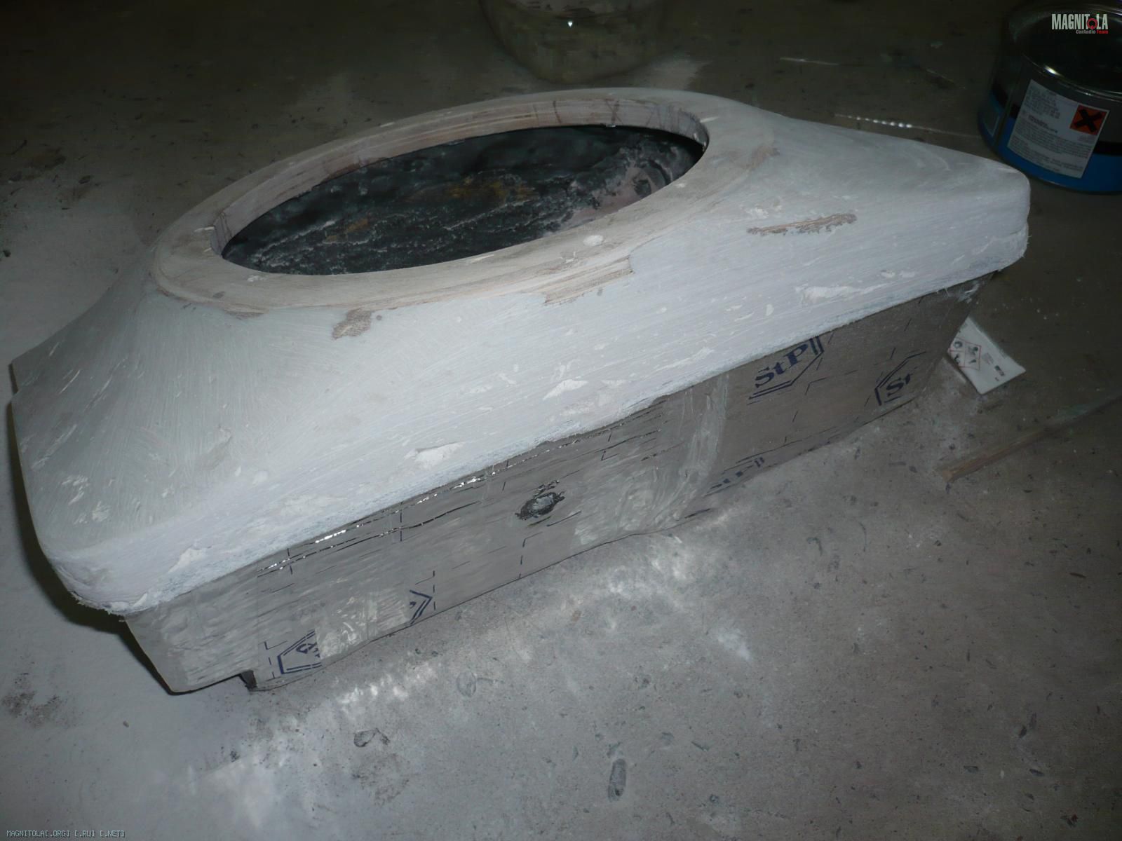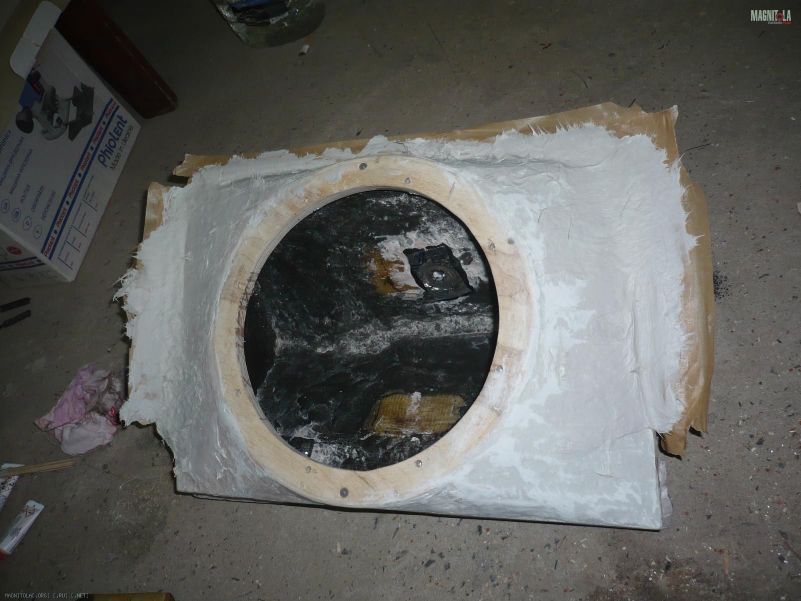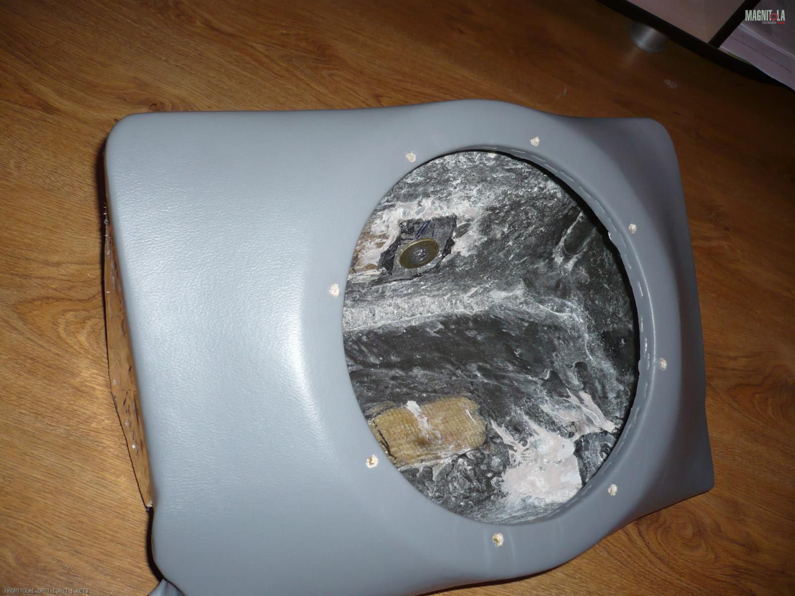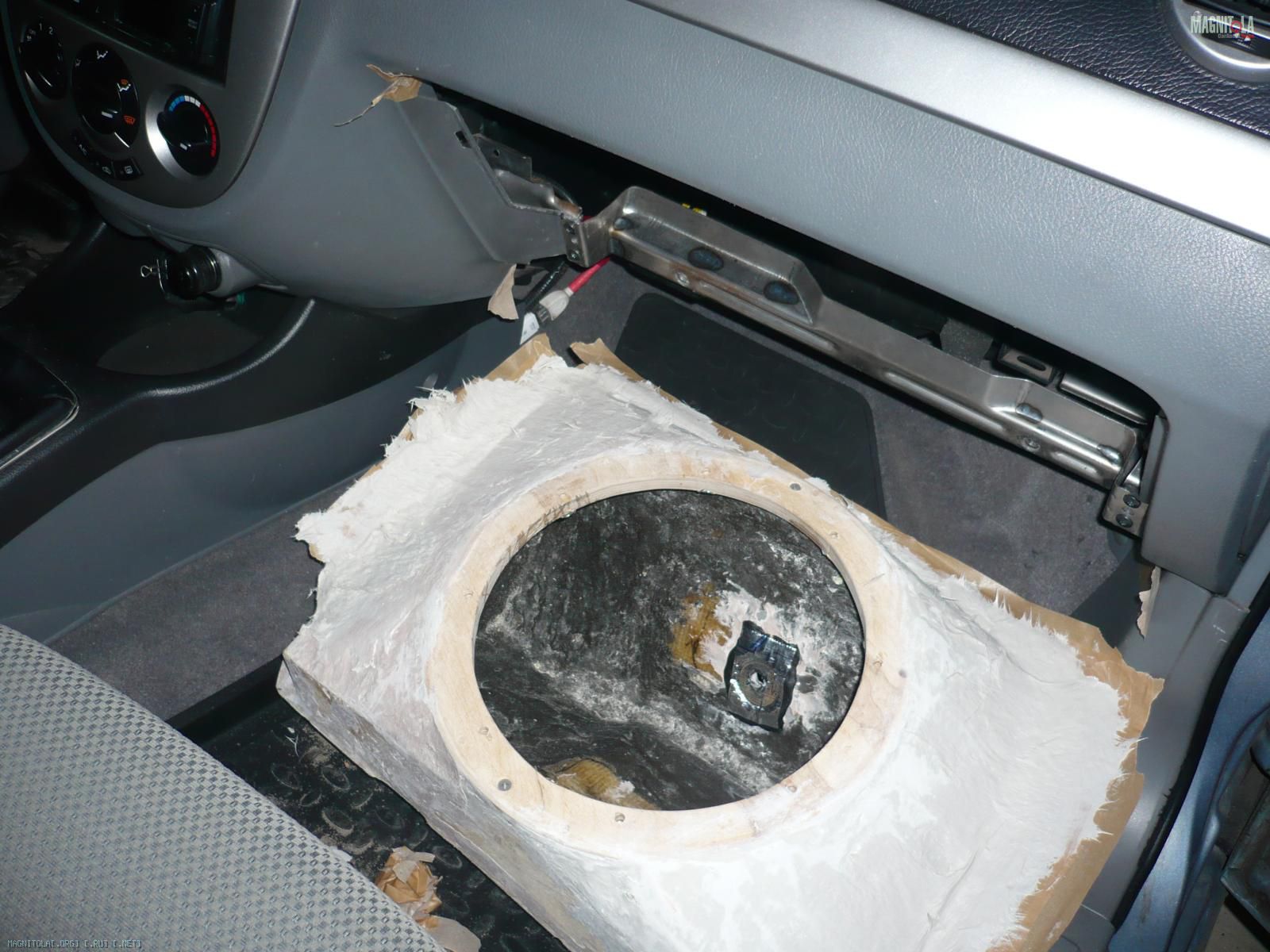 Внутри ящик промазал смесью полеэфирки с цементом. Получилось просто камень! Примерял постоянно в авто! По периметру ящика и торпедо оставил зазор(около 2 мм),что бы полностью исключить соприкосновение саба и торпедо. Крепление саба только на каркасе кузова(ну об этом чуть позже)