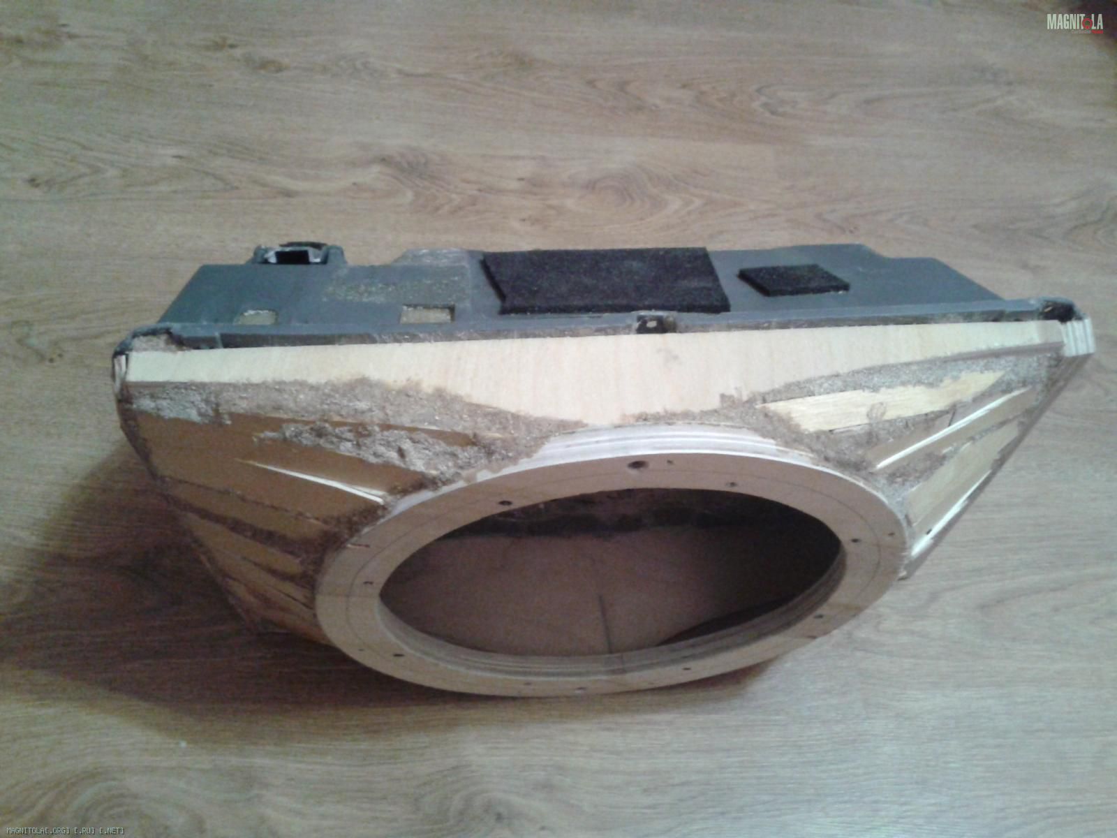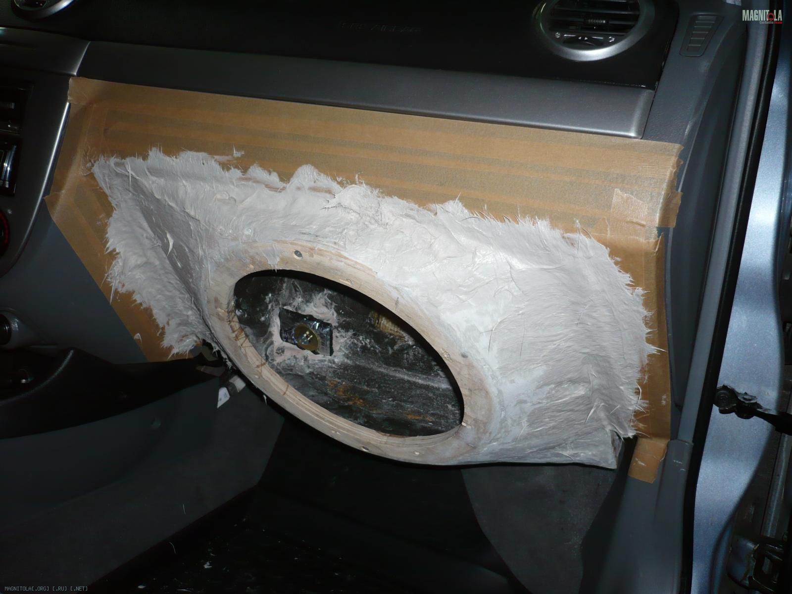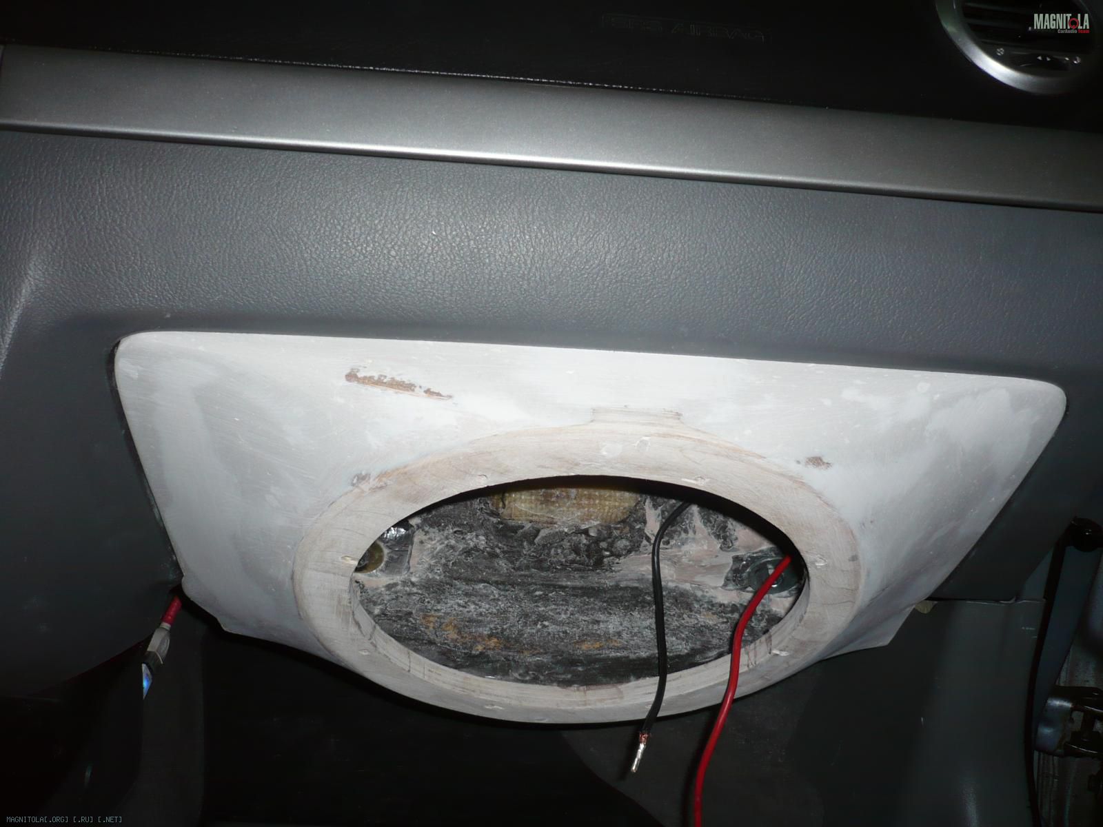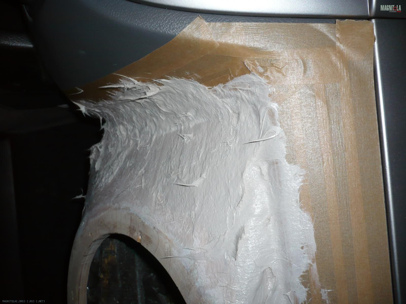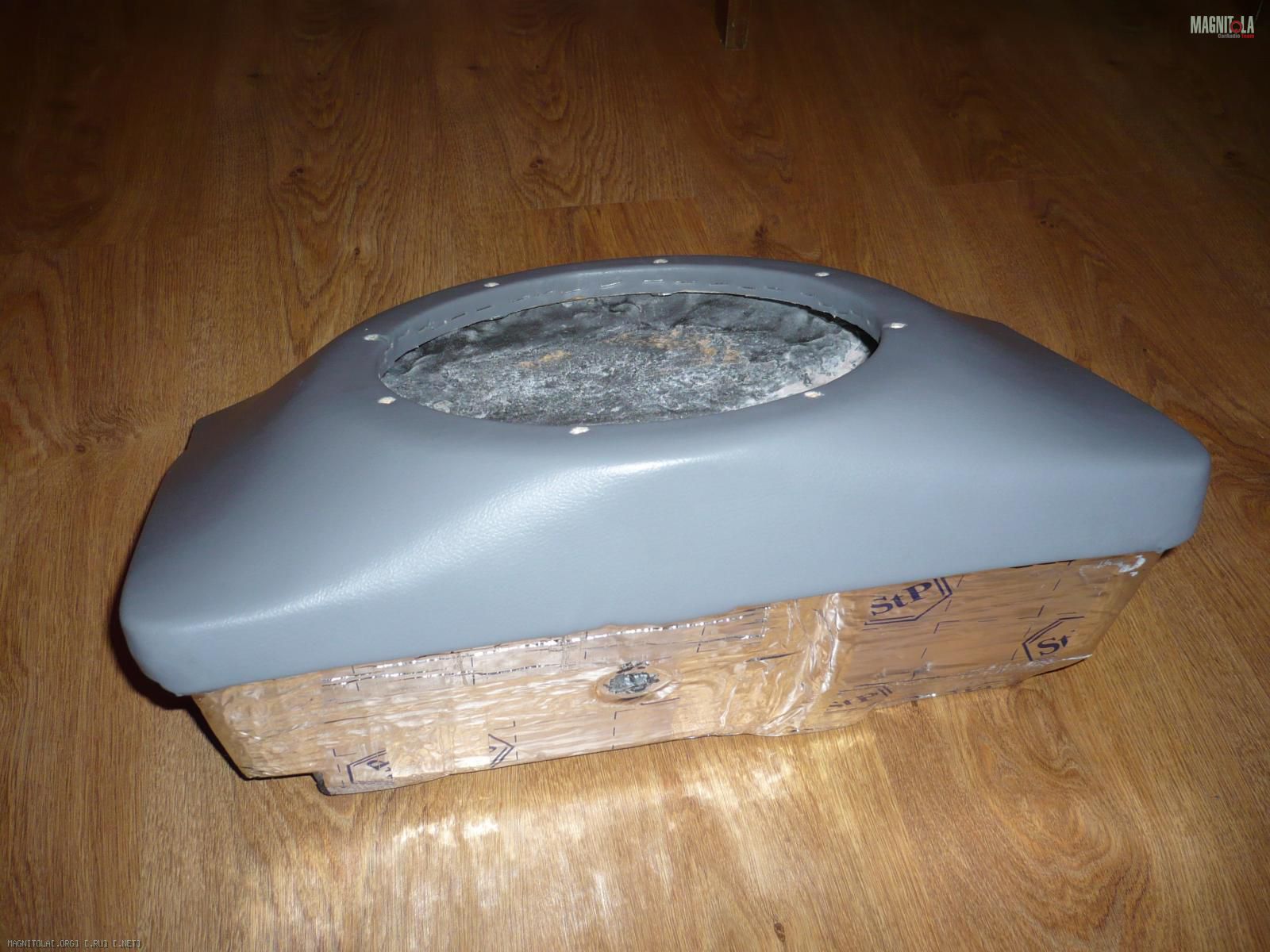 Внутри ящик промазал смесью полеэфирки с цементом. Получилось просто камень! Примерял постоянно в авто! По периметру ящика и торпедо оставил зазор(около 2 мм),что бы полностью исключить соприкосновение саба и торпедо. Крепление саба только на каркасе кузова(ну об этом чуть позже)