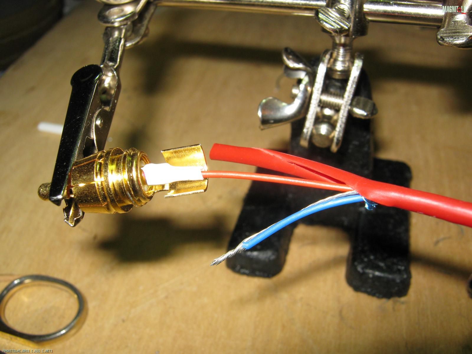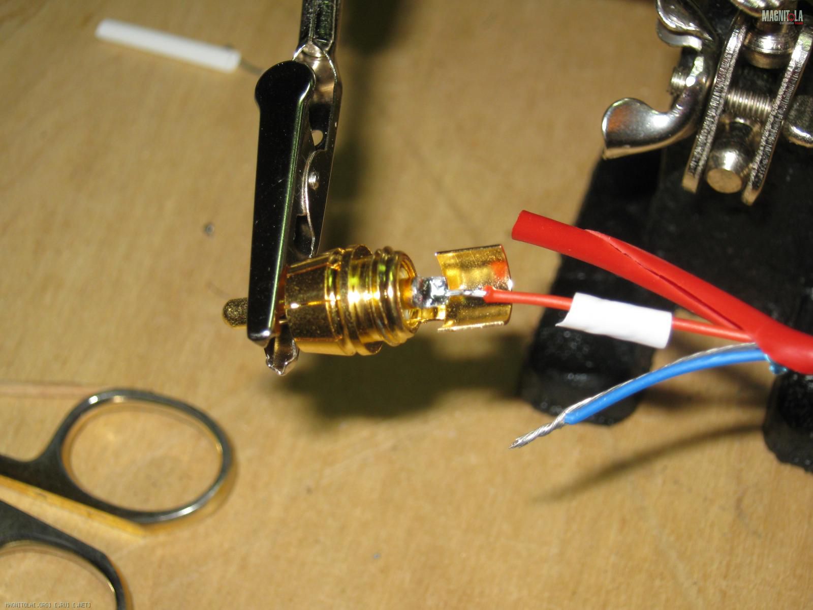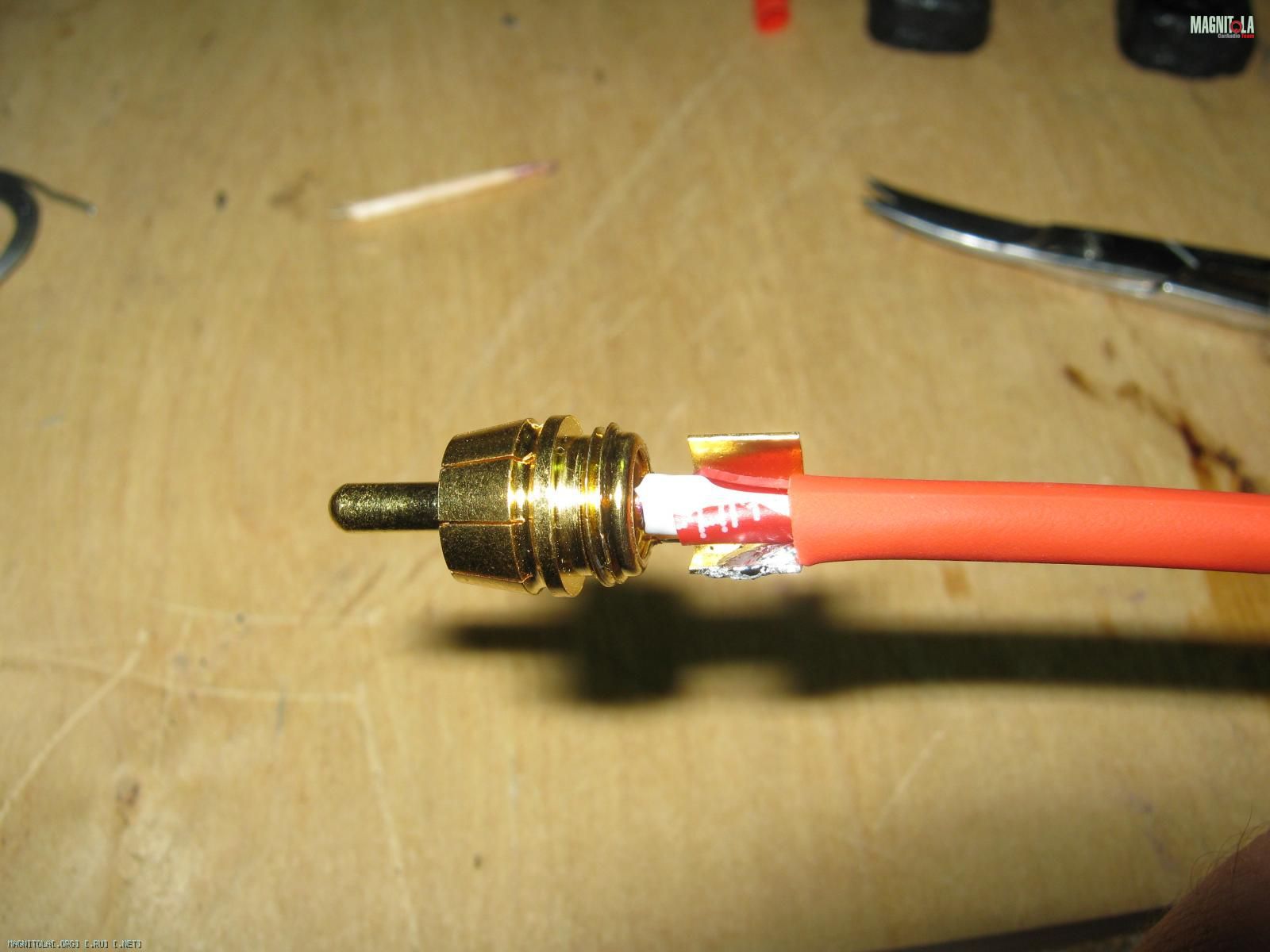 Паял вообще первый раз. Поэтому не всё так ловко как могло бы быть. Фотки делал с первым проводом, потом я стал припаивать сначала на массу, потом центральный. Так удобней. И на центральный натягивал термоусадку. Её видно, белая.