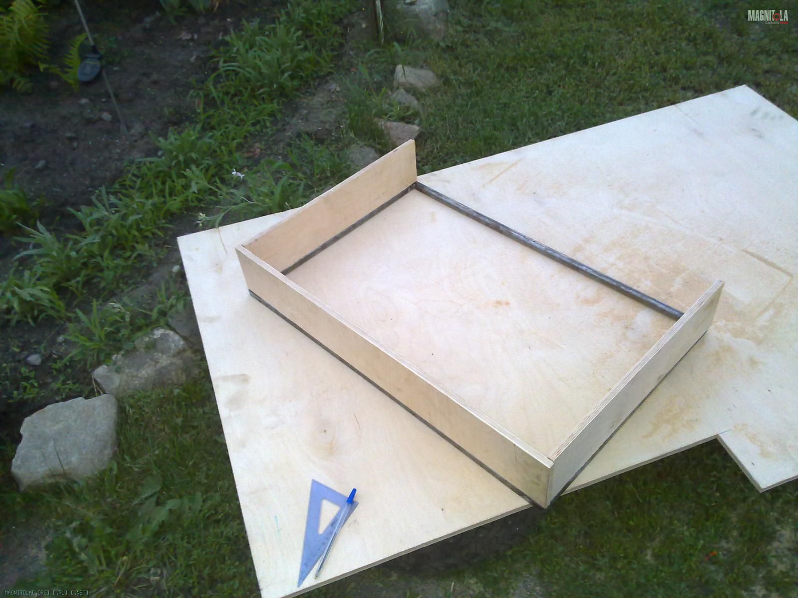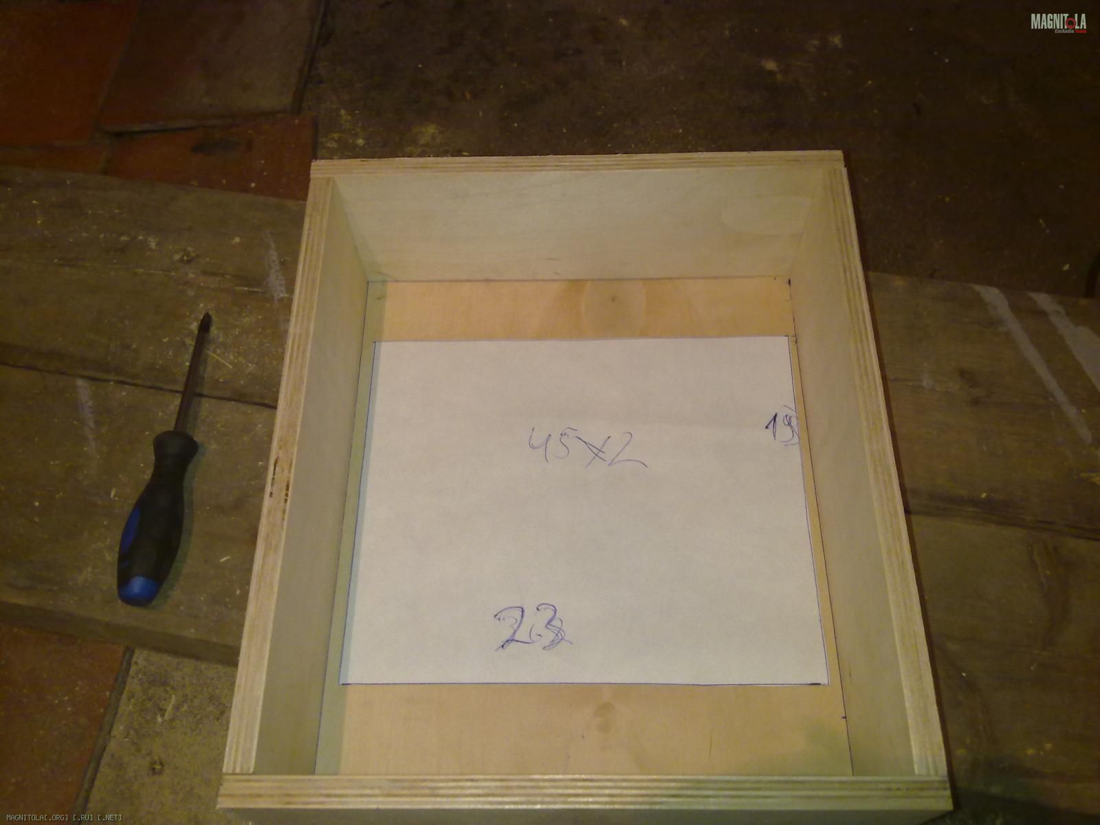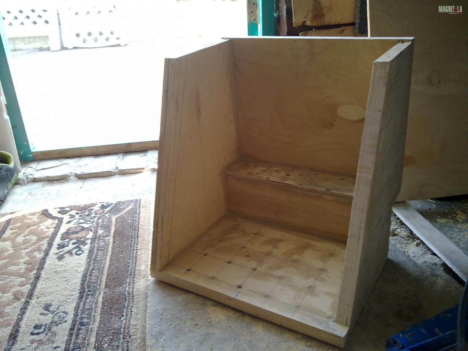 Вот замутил каркас и корпус саба. Вот что получилось. Использовал фанеру 11 мм. соединял все на жидкие гвозди и саморезы,толщина всех стенок стала больше 20 мм.Обьем ящика 27 литров.Еще заказал токорю металлическое кольцо.Поставлю его внутри ящика нарежу резьбу и прикреплю динамик на болты. Каркас из 25 профиля.