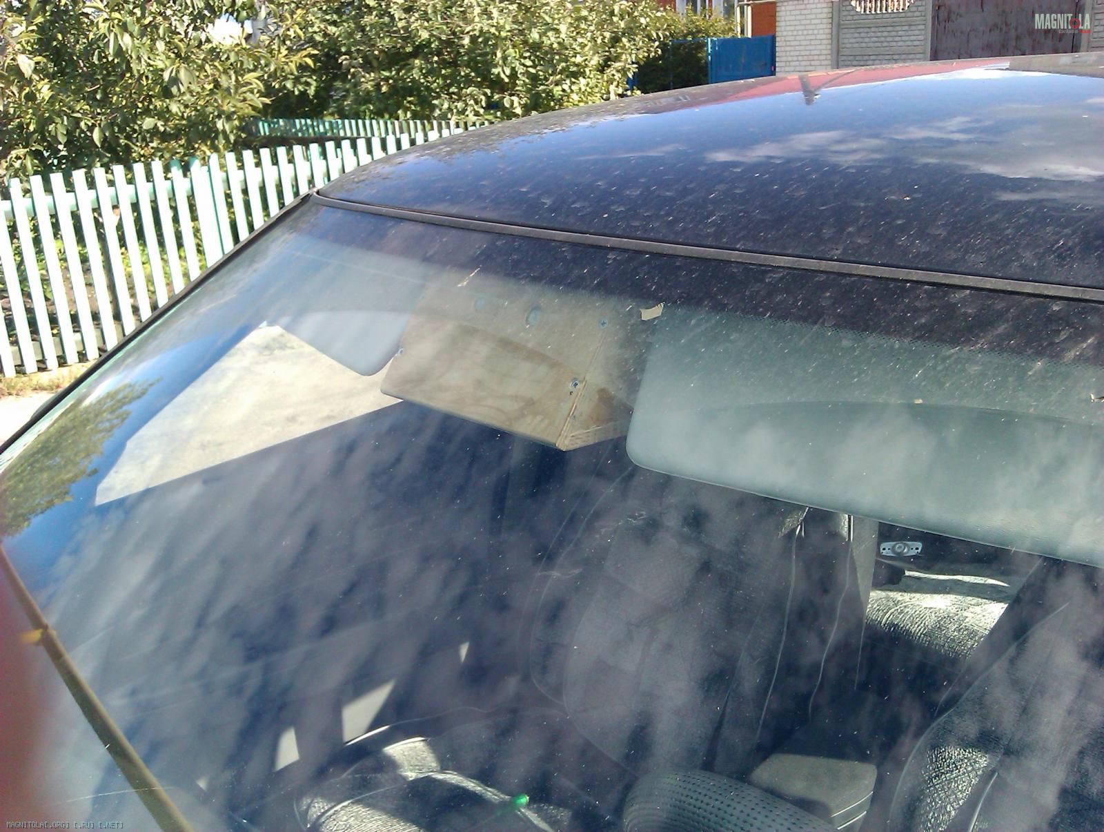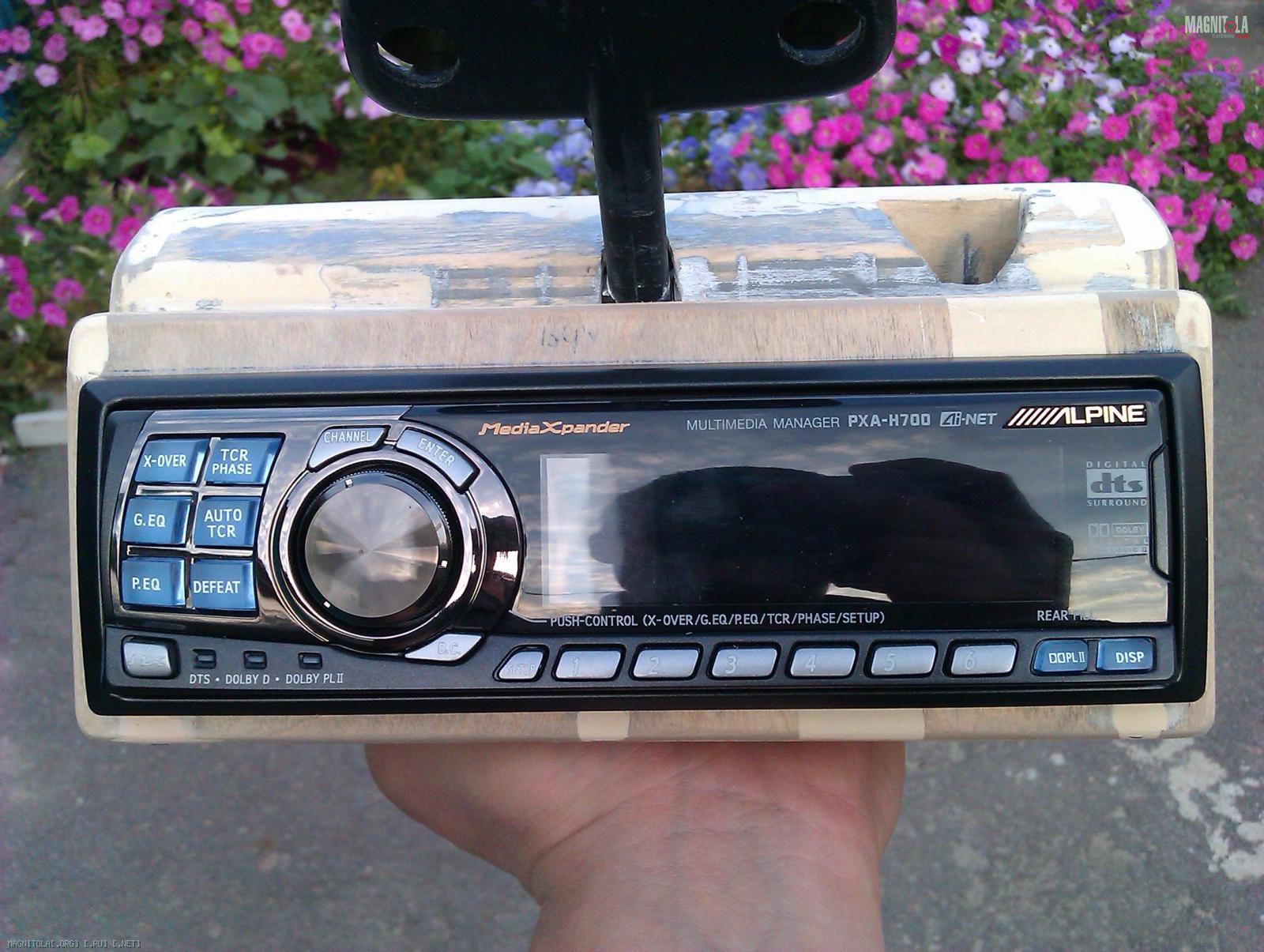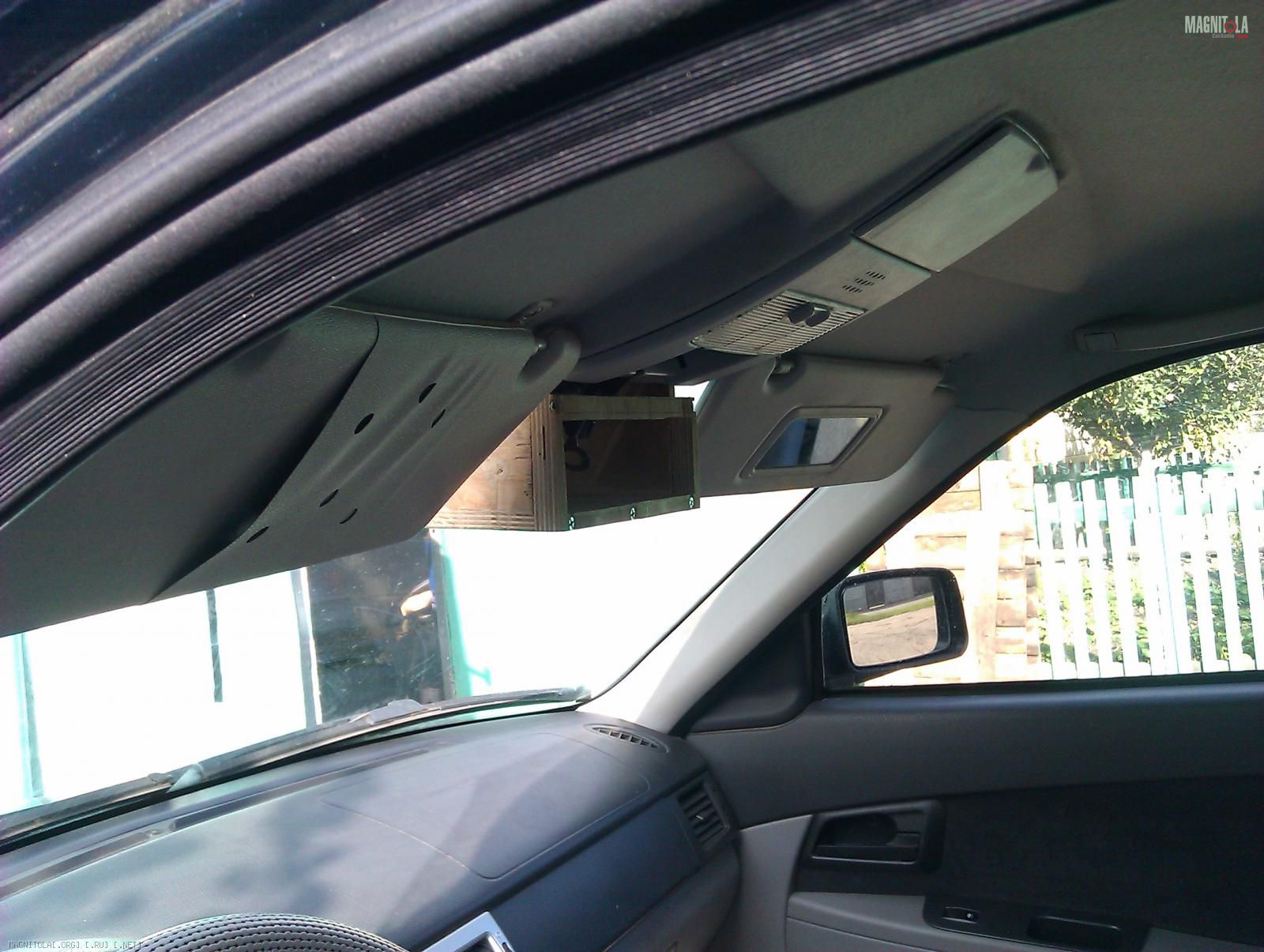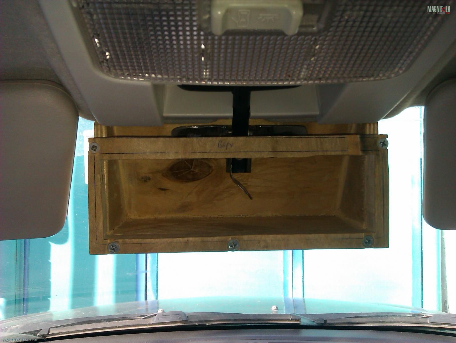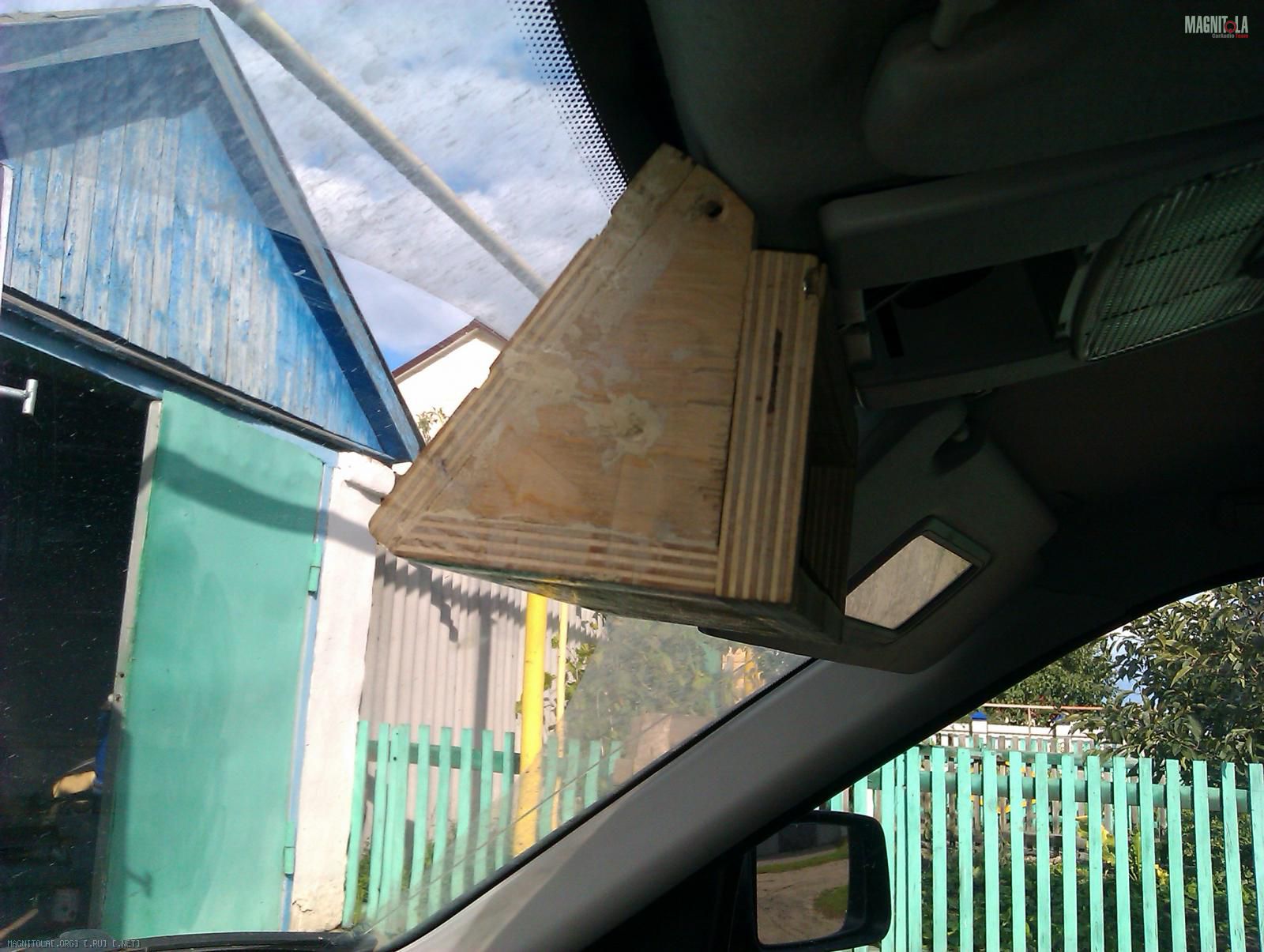 А в планах 3-х полосный фронт и саб. Все на 700-м процессоре и по возможности поконально. Вот он уже куплен и очень долго был в коробке в шкафу! Первое что я сделал, так это определил его панель.Долго думал куда ее поставить. Сильно хотел вмонтировать ее в потолочную консоль но места для нее не нашлось.Вот и решил убрать зеркало заднего вида,а ее поставить вместо него.Заводское зеркало отложил не стал ломать а купил другое и позаимствовал у него ножку! потом с металла дополнил еще креплением которое все держит ( плохо,что ножка не металлическая). Долго выравнивал! но когда все получилось скрепил их болтиком.С фанеры соорудил коробку и покрасил антигравием.