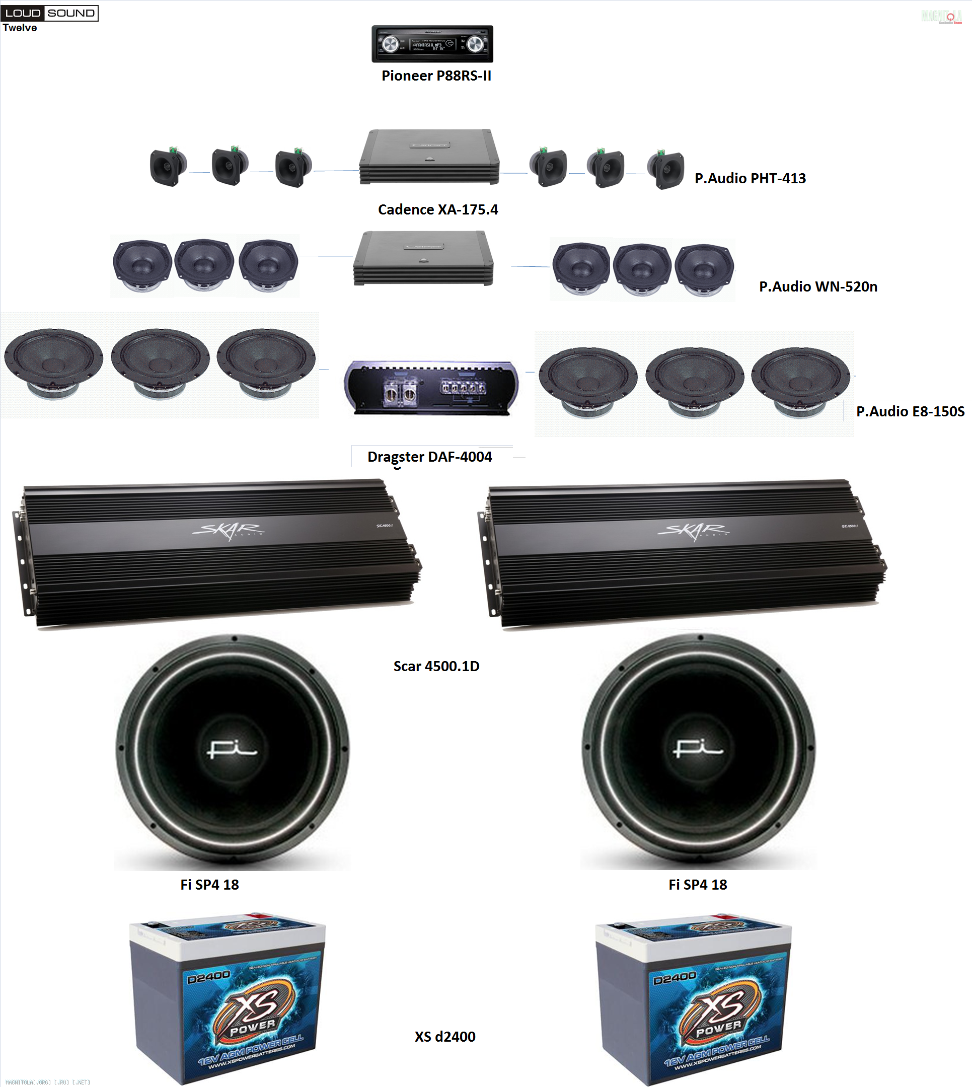 Усилителями для мидбасов выступил мощнейший двухканальник Dragster DAF 4002.