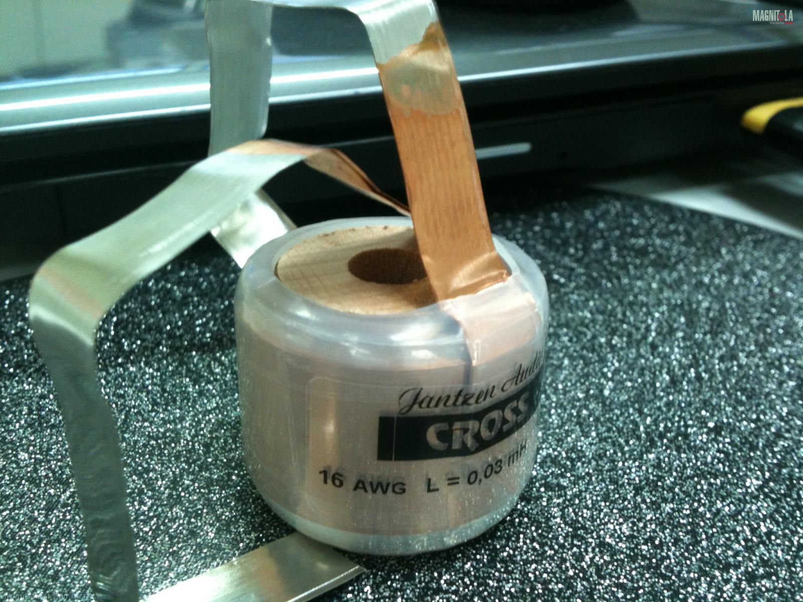 Для 8Ом кросс должен выглядеть так: Катушка 3,33mH, конденсатор 26mF. Чтоб набрать необходимую индуктивность, поскольку кросс временный использую несколько катушек соединенных последовательно, а для конденсаторы нужно соединять параллельно для получения необходимой емкости. "Режем" динамик только сверху, частота среза 540 Hz. Желательно показатели индуктивности и емкости подогнать как можно точнее, чтоб было меньше горбов. И конечно же перемерить показатели на уже готовом кроссовере!