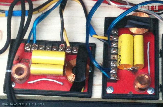 Ну и нужно основание, как правило это хороший б/у кроссовер, который полностью безжалостно распаиваем (здесь резисторы на 5Вт и конденсатор-электролит, катушки из тонкой проволки - все это будет сказываться на звуке в худшую сторону)!