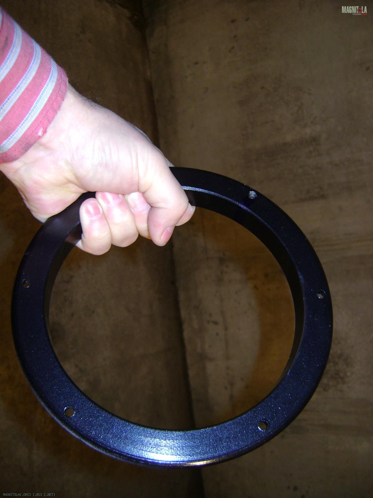 Первая примерка динамика. Хотел чтобы динамик прикручивался к наружному металлическому фланцу подиума болтиками М4. Разметил по фланцу динамика, высверлил, нарезал резьбу в отверстиях... приложил динамик - а 4 из 8 отверстий чуть-чуть не совпадают... болтики не вкручиваются. Убил на это часа два. Обидно. Пришлось рассверливать чуть больше, и крепить придется на саморезы.