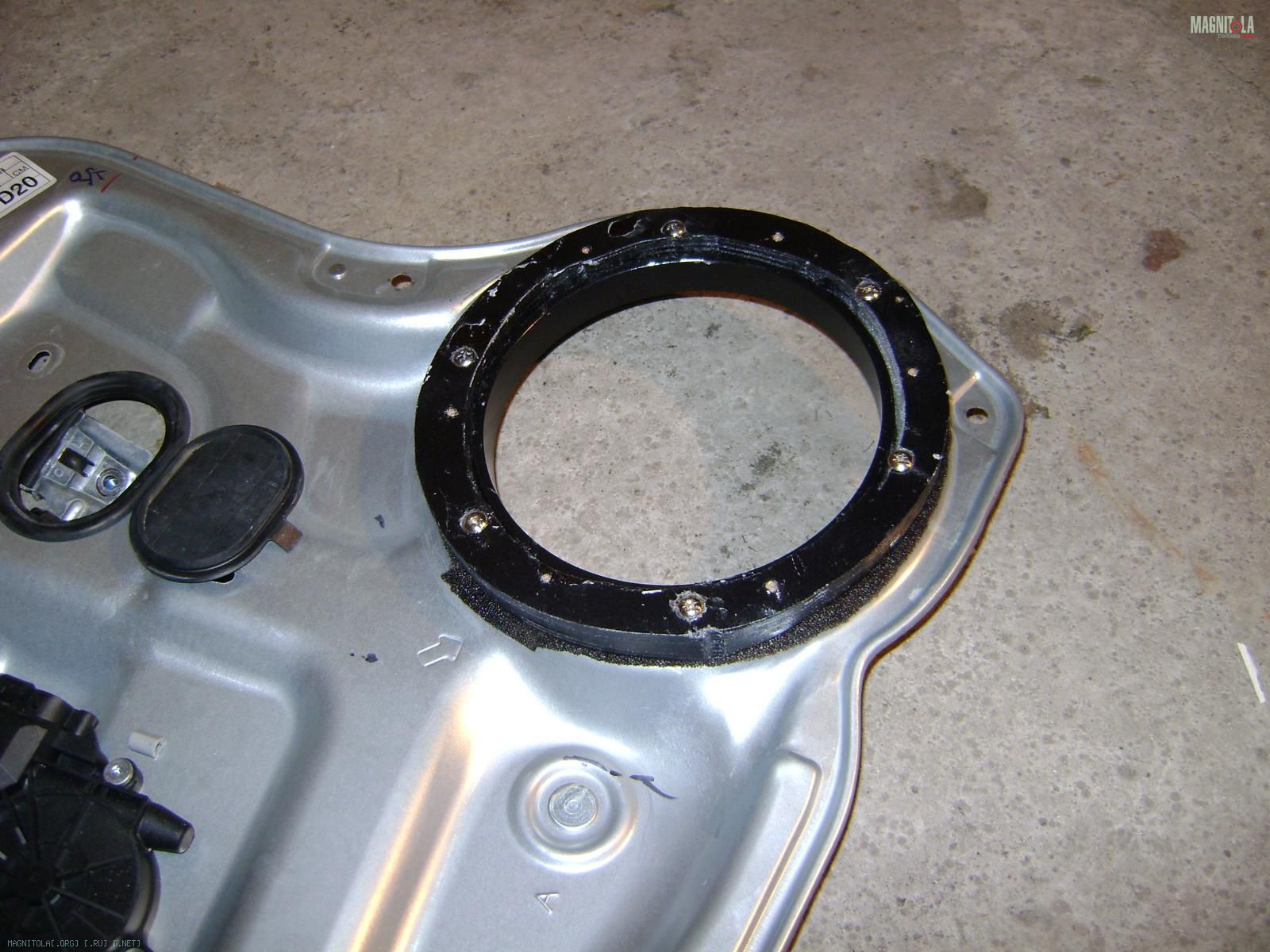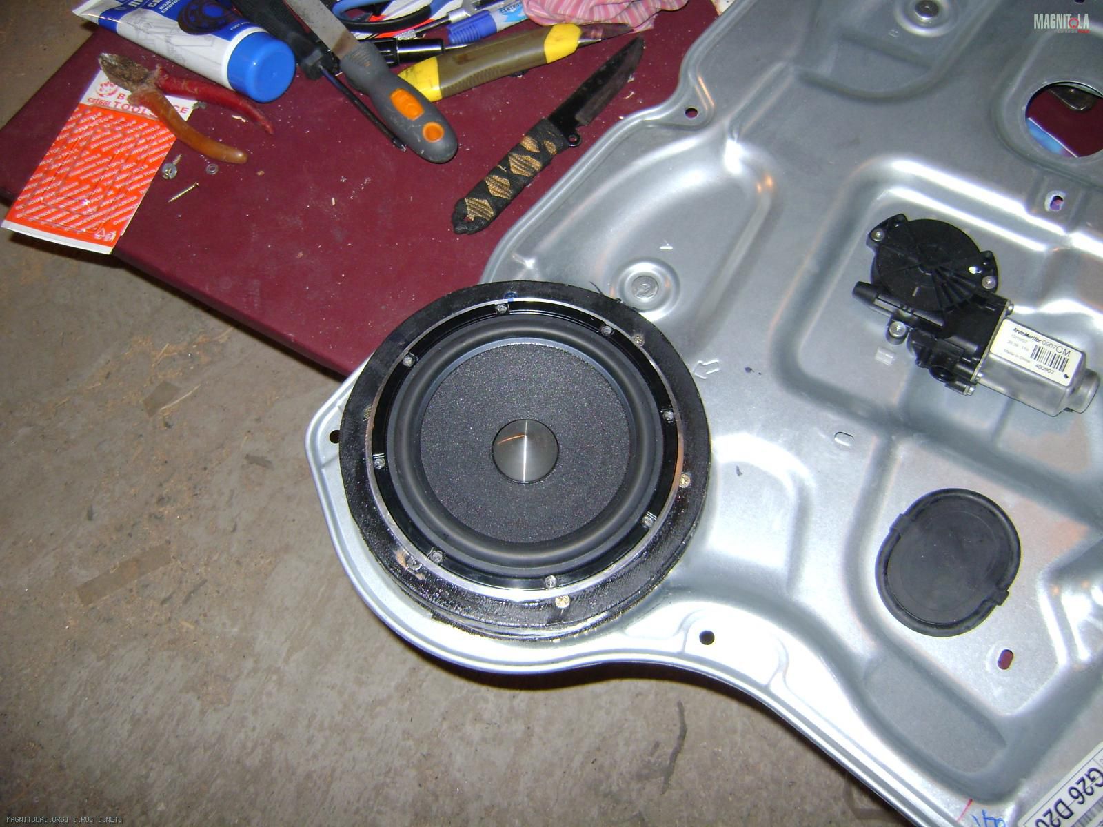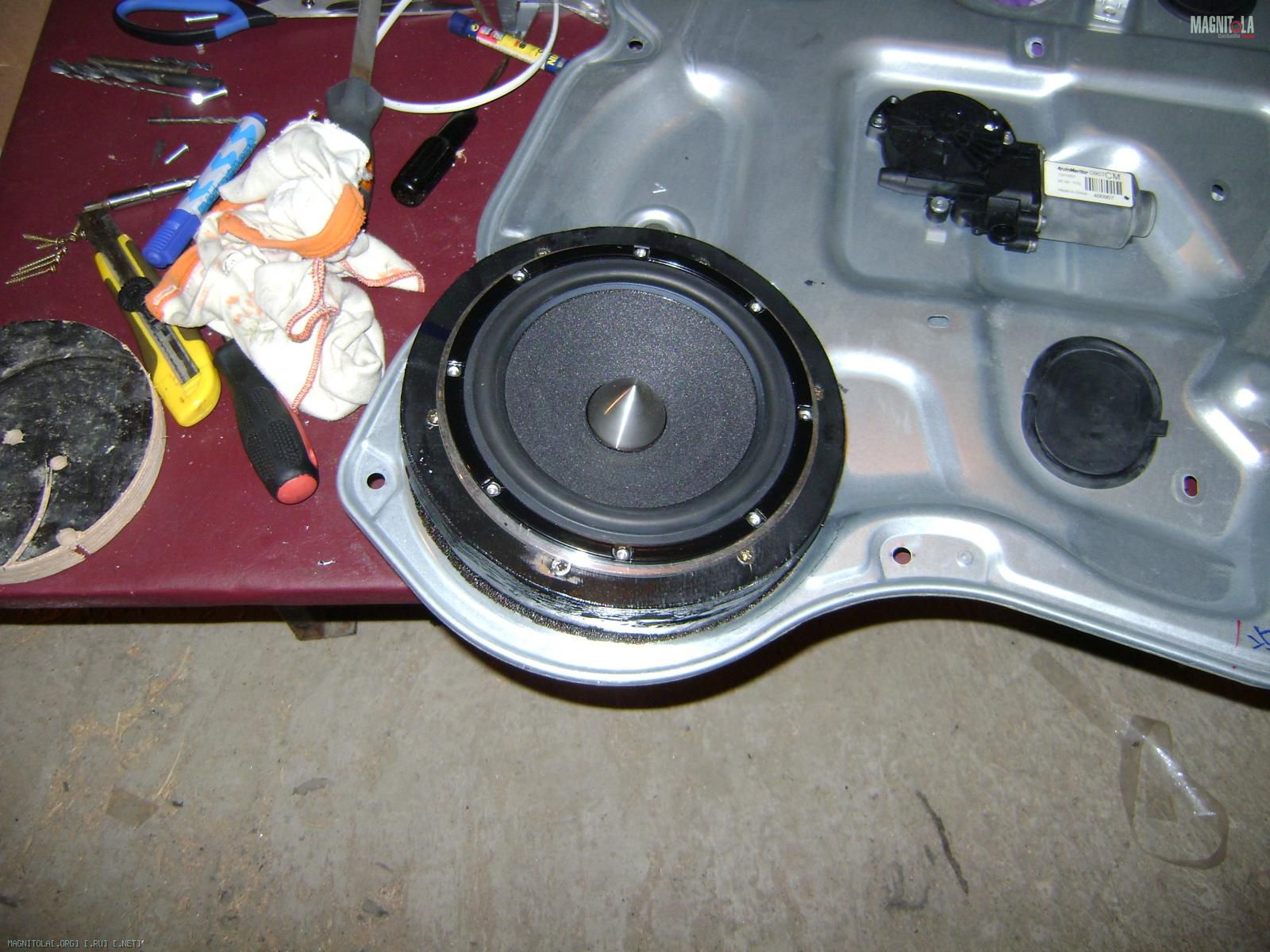 Да-да, я тоже про это читал. Просто я не вижу в этом смысла:) Нижний торец двери сам по себе достаточно жесткий. Если прикрепиться только к нему (а это можно сделать прямо насквозь снизу, хоть саморезами:), но лучше болтами) и к стенке, на которую садится динамик, то тоже будет результат. А чтобы крепиться к усилителю - его надо либо сверлить, либо варить. Вот я бы не стал варить и, тем более, сверлить элемент двери, который отвечает за мою безопасность. Но это лично моя заморочка;)