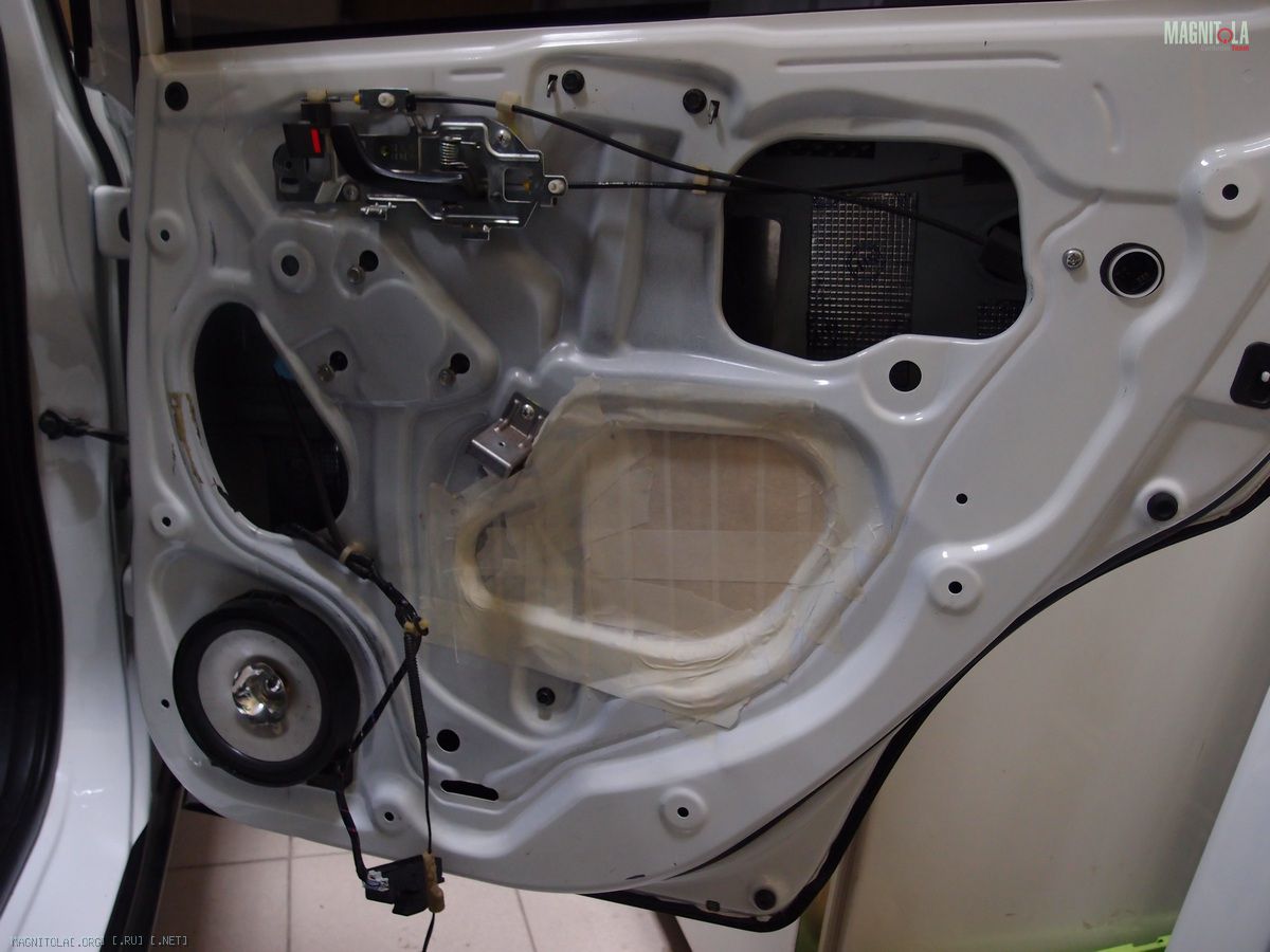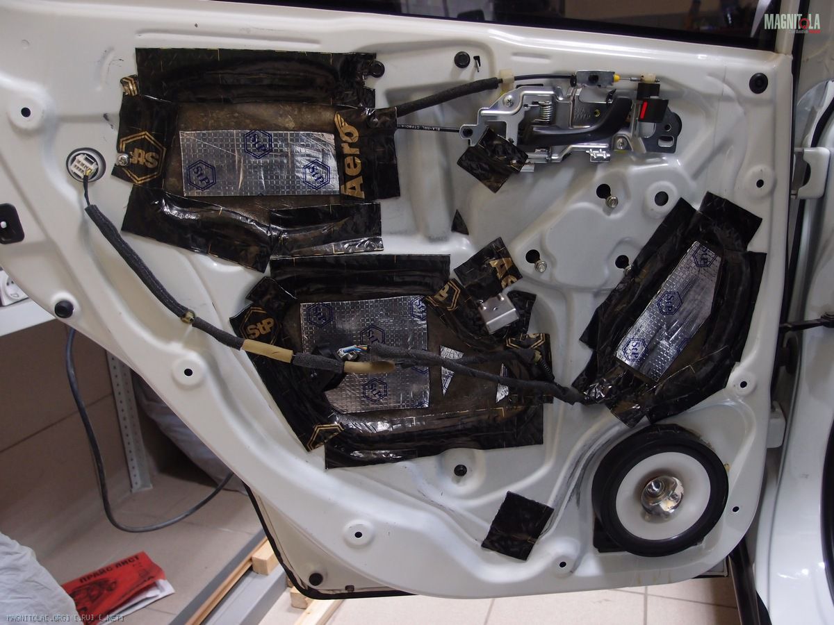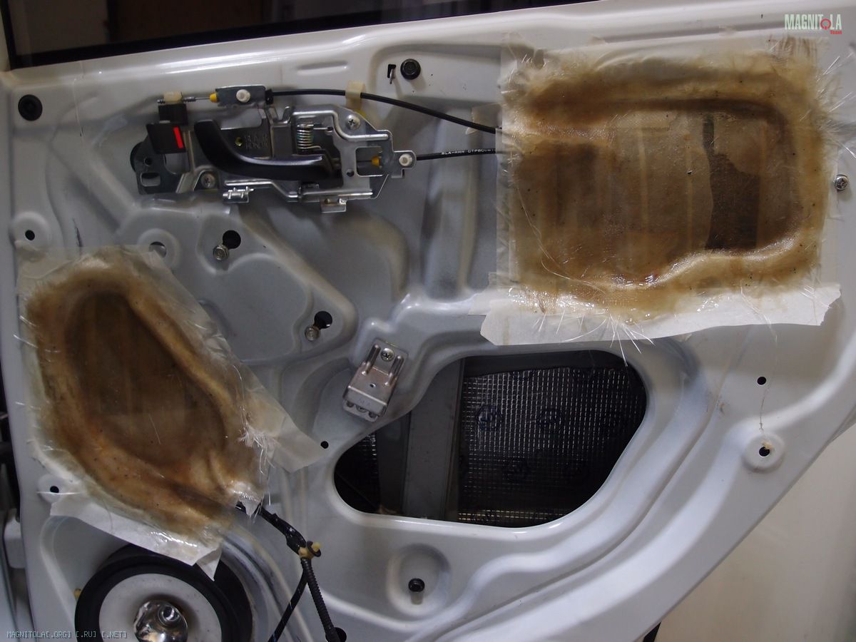 Поэкспериментировал на задних дверях со стеклопластиком. Динамики в них стоят просто так, чтоб дырки были закрыты. Шумил по минимуму около 60-70% металла. Для акустического комфорта.