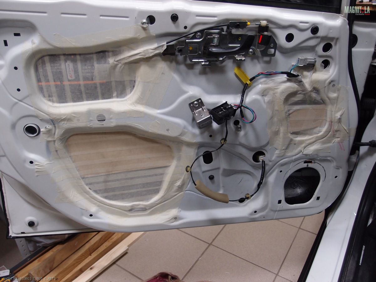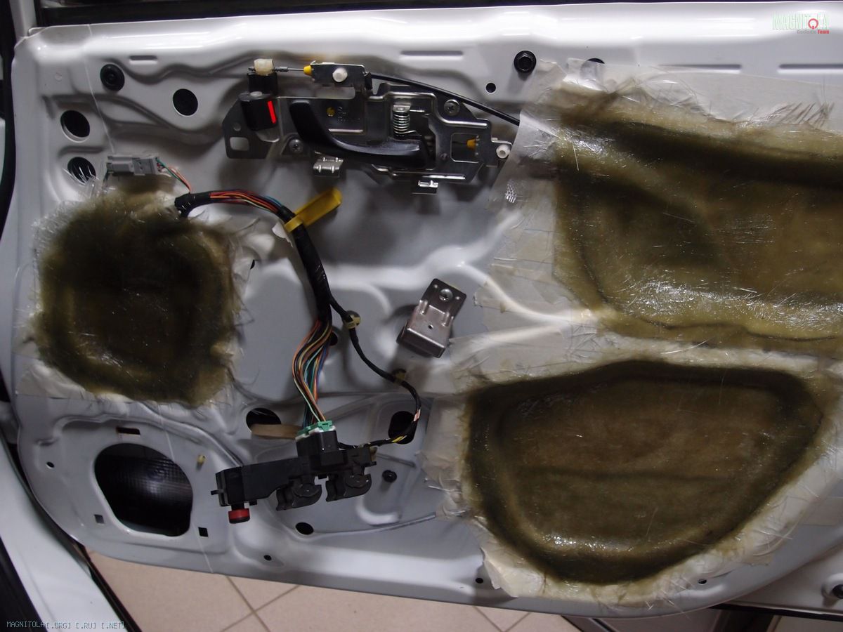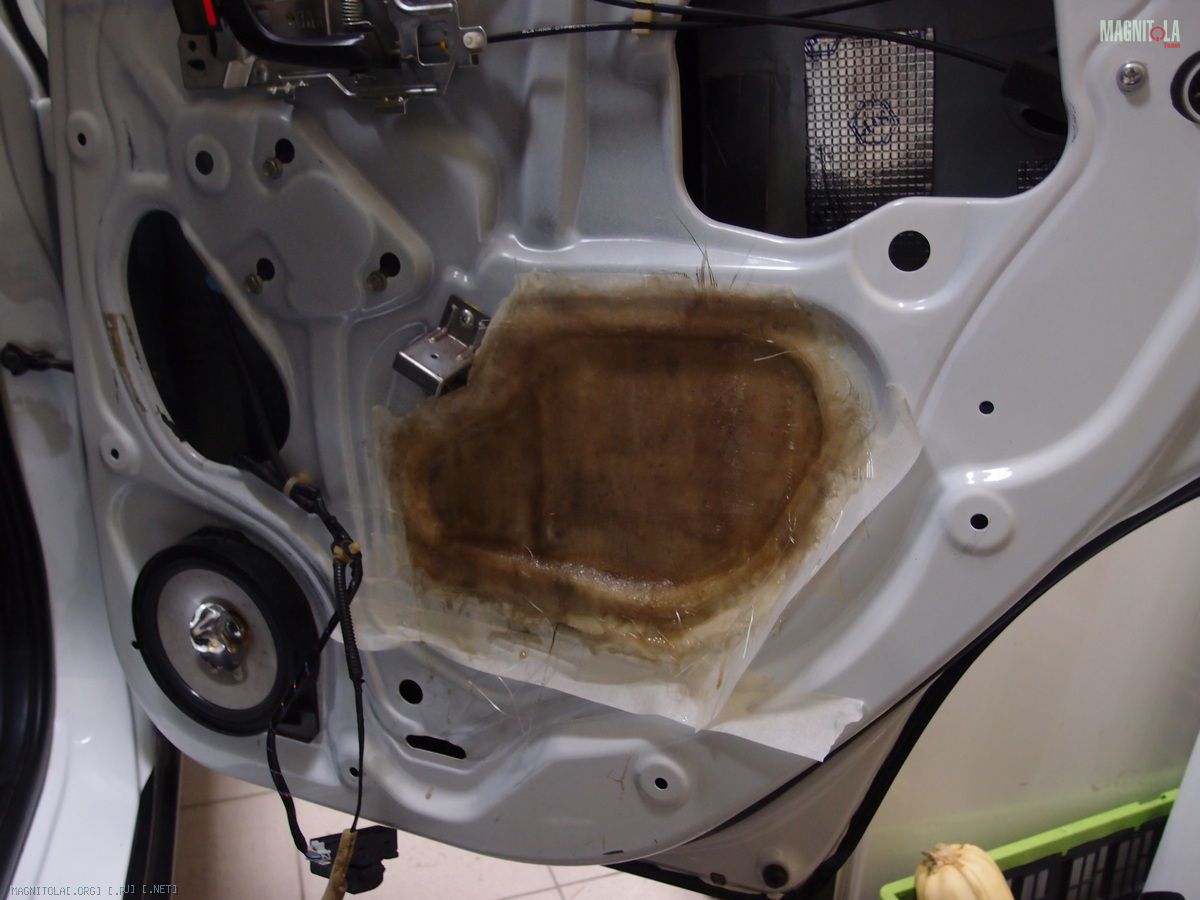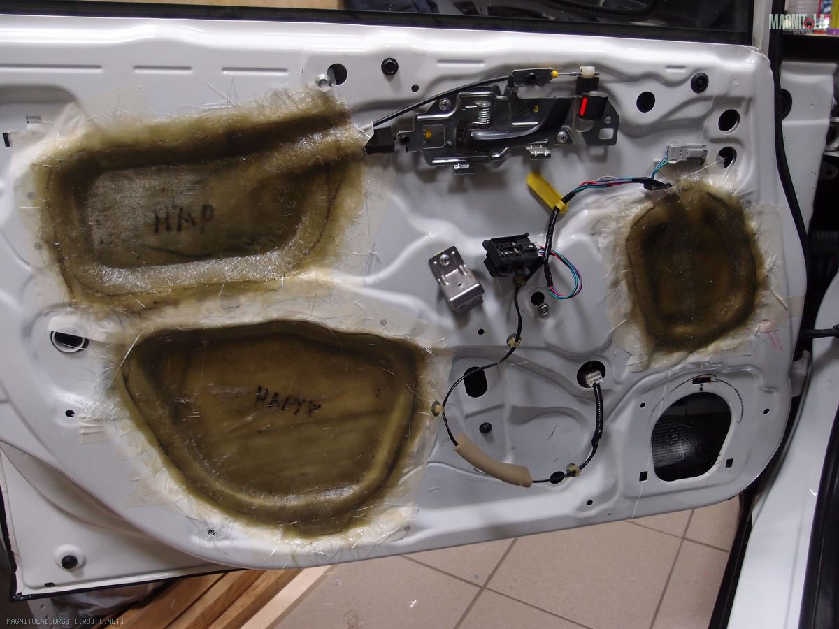 Поэкспериментировал на задних дверях со стеклопластиком. Динамики в них стоят просто так, чтоб дырки были закрыты. Шумил по минимуму около 60-70% металла. Для акустического комфорта.