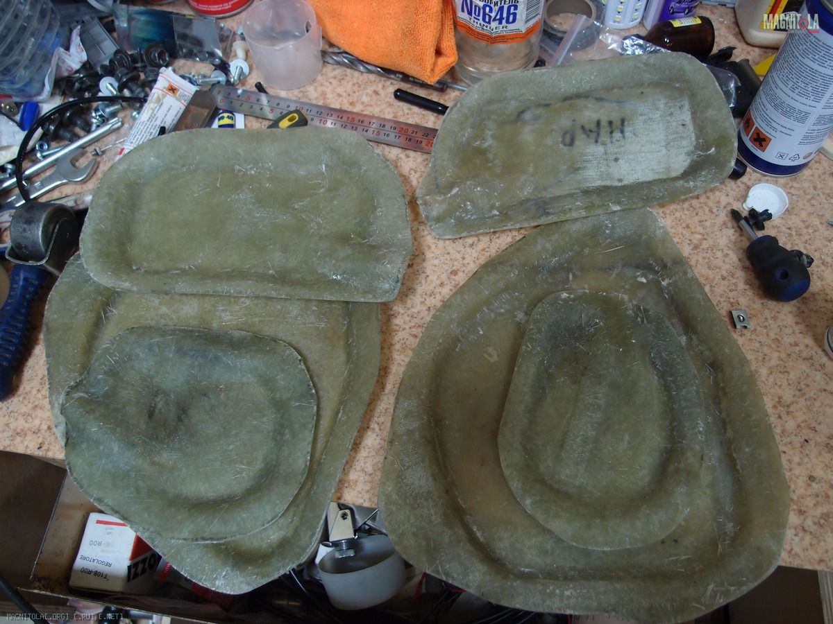 В передних дверях ситуация иная: Полтора слоя вибры (99% металла укрыто Визоматом МП2 и половина сверху покрыта СТП Аэро) и скорлупки сделал из 2х слоев 300го мата + слой 600го + кромка где буду приклепывать еще один слой 600го...