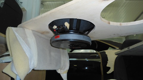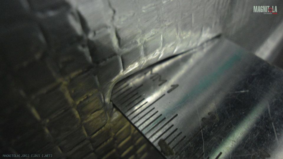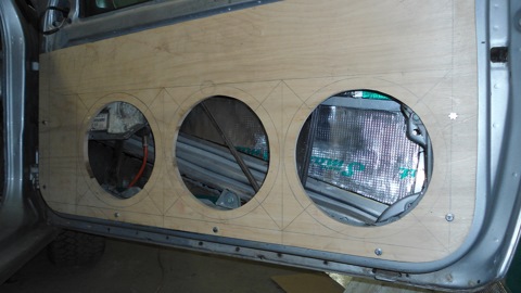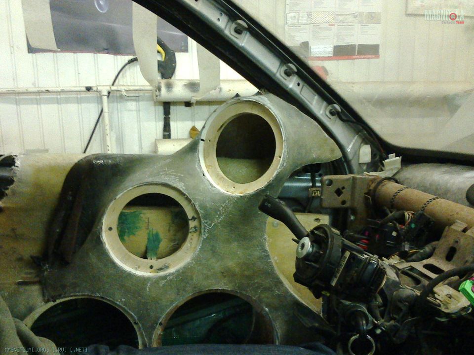 После вырезания, расчерчиваем расположение динамиков, не забывая о тонкостях установки, крепежа и зазоров между обшивкой и панелью и сидушками. вырезаем отверстия и примеряем монстрика… (про 16см. динамики расскажем в следующей части)