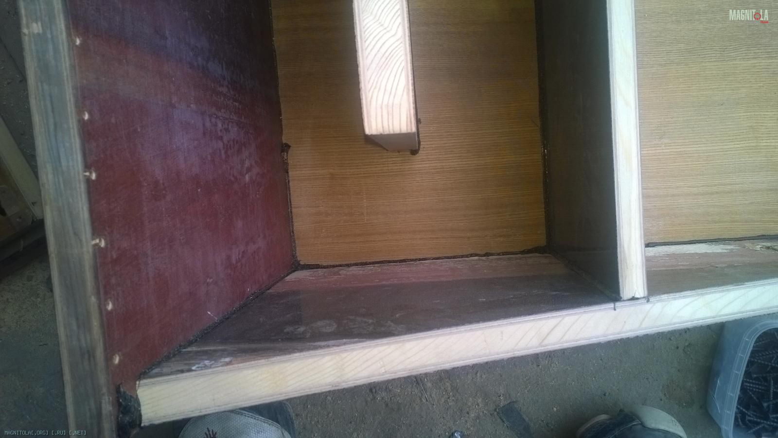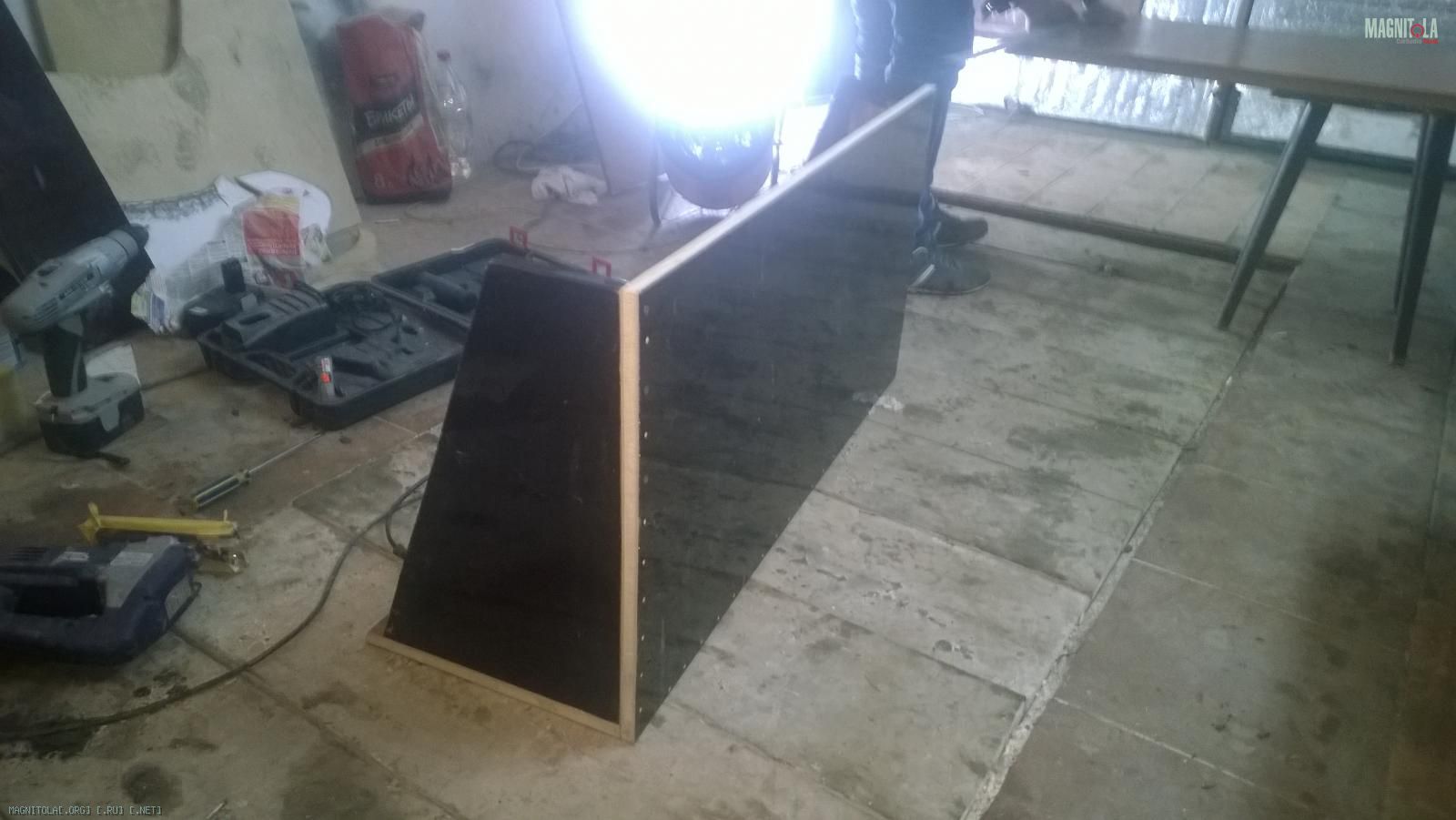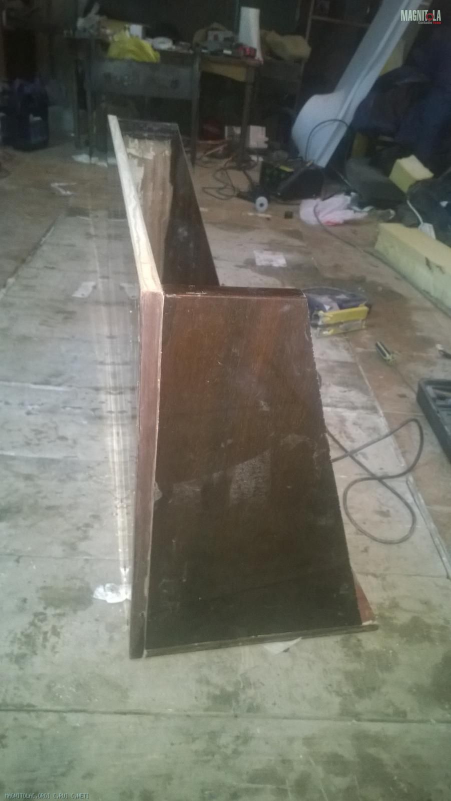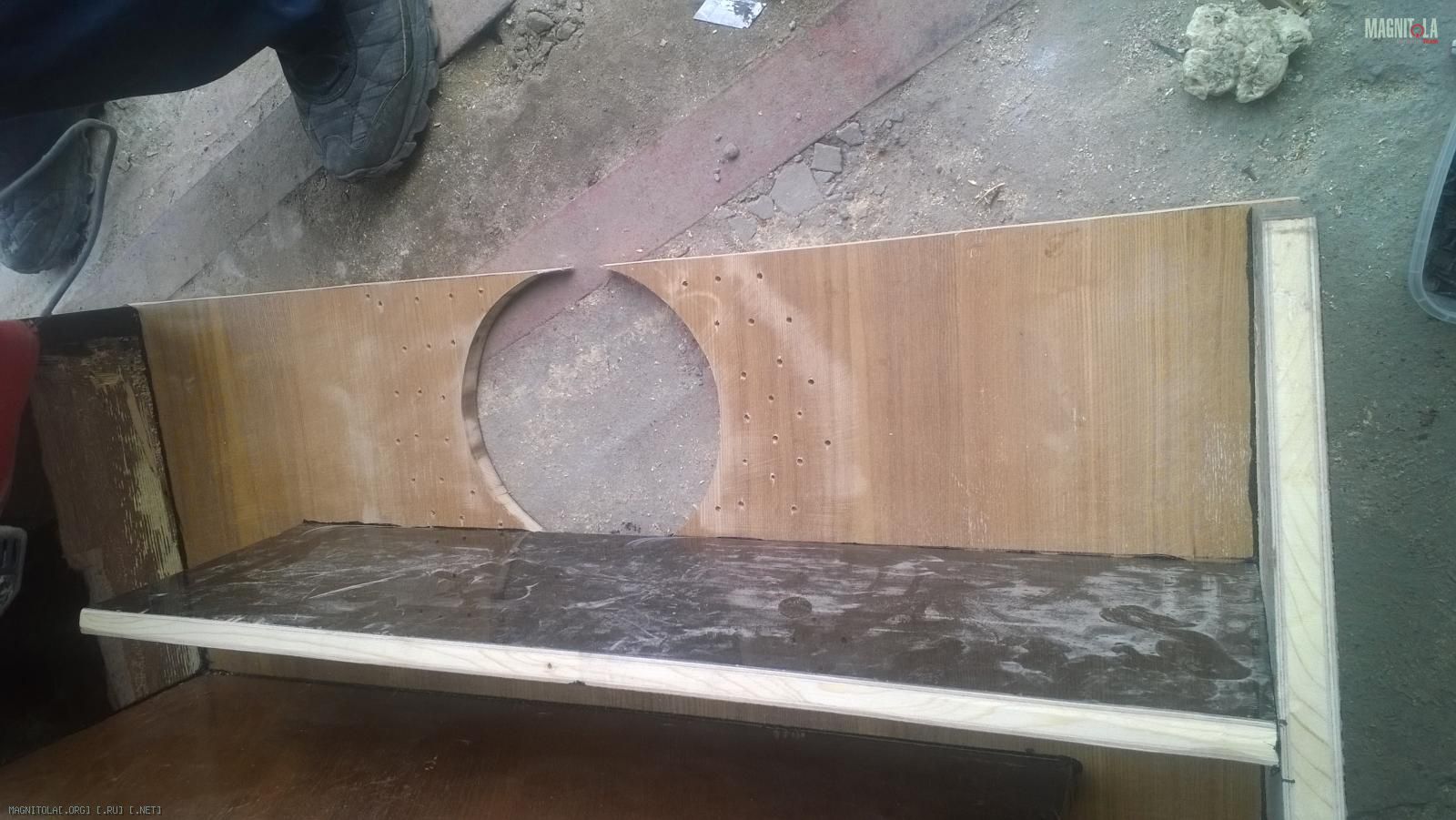 наклон трапеции соответствует наклону задней спинки, перегородкой слева от динамика можно регулировать настройку от 34 до 41Гц. Площадь порта получилась немножко сужающейся от 320см^2 до 270см^2