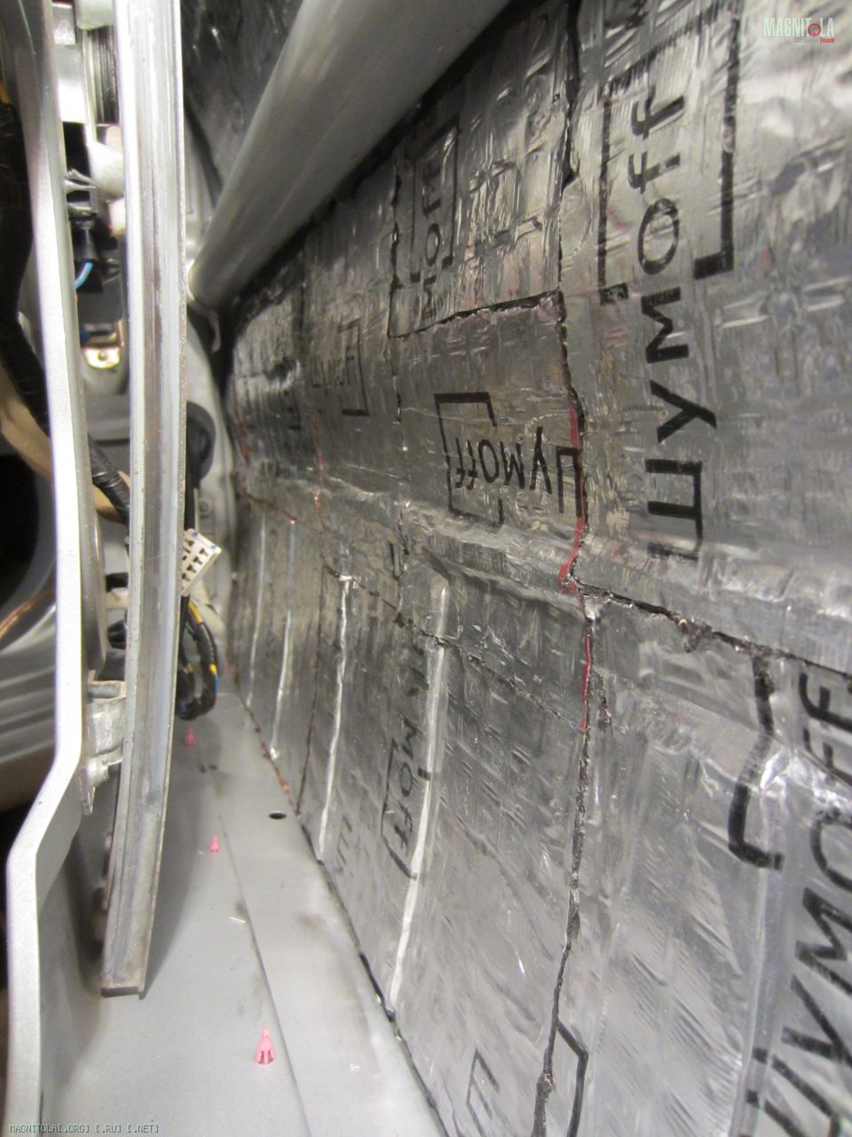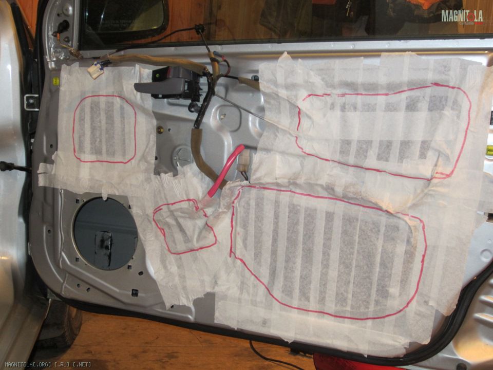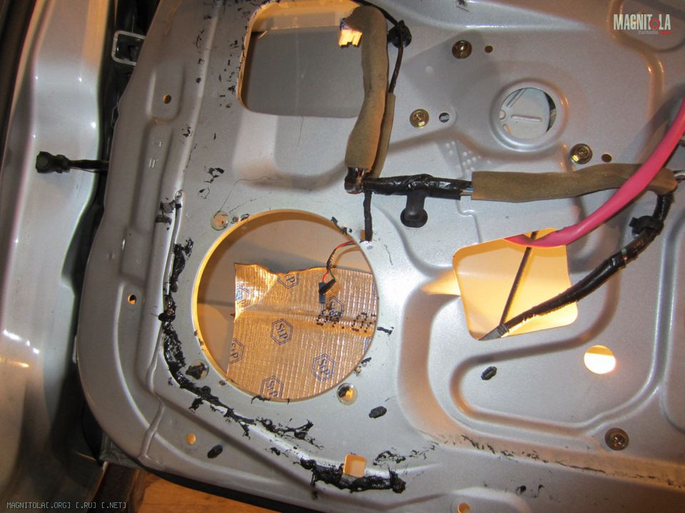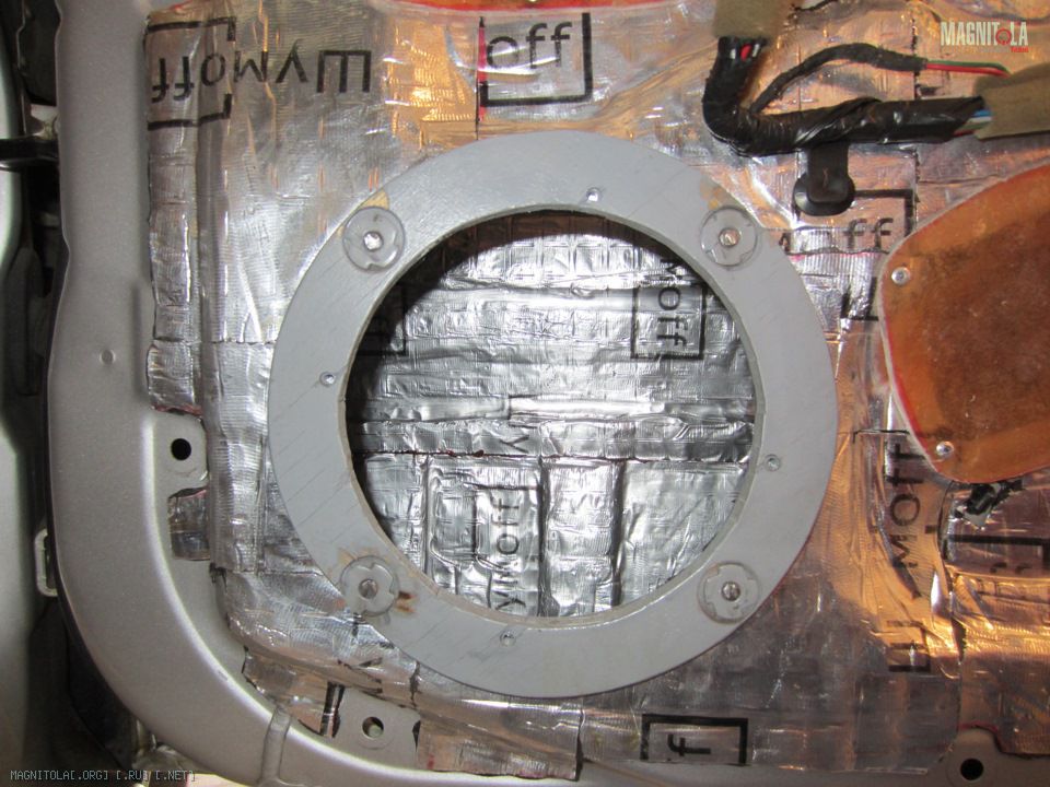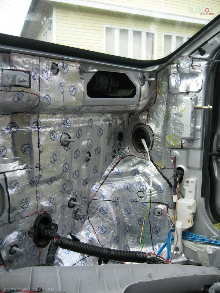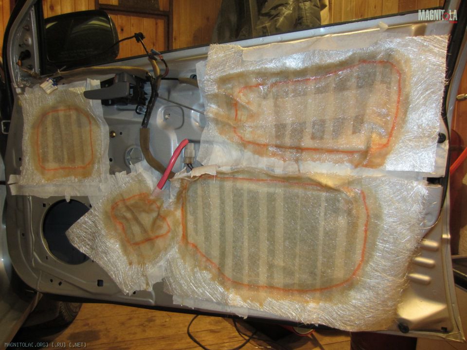 Шумофф М4, в районе динамика МиксФ. За динамиком расположилась Шумоффская "акустическая линза"...но ненадолго, несмотря на уверения продавцов, она оказалась отличной губкой впитывающей воду! Внешний металл- та же вибра M4. Заглушки технологических отверстий было решено лепить из стеклопластика, заодно научиться работать с полиэфиркой:secret: Дверь получилась достаточно капитальная.