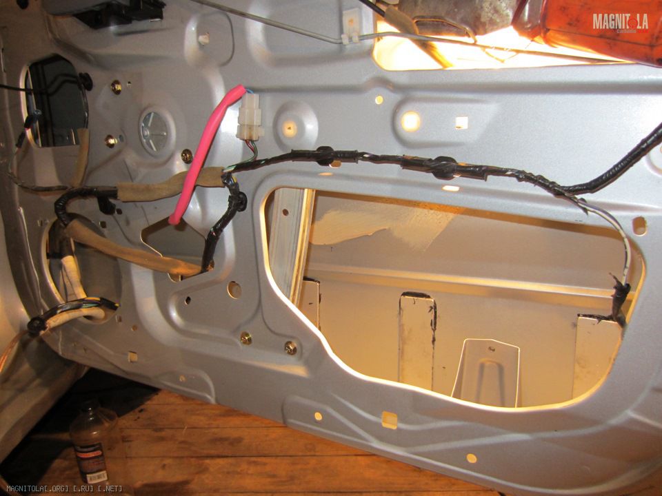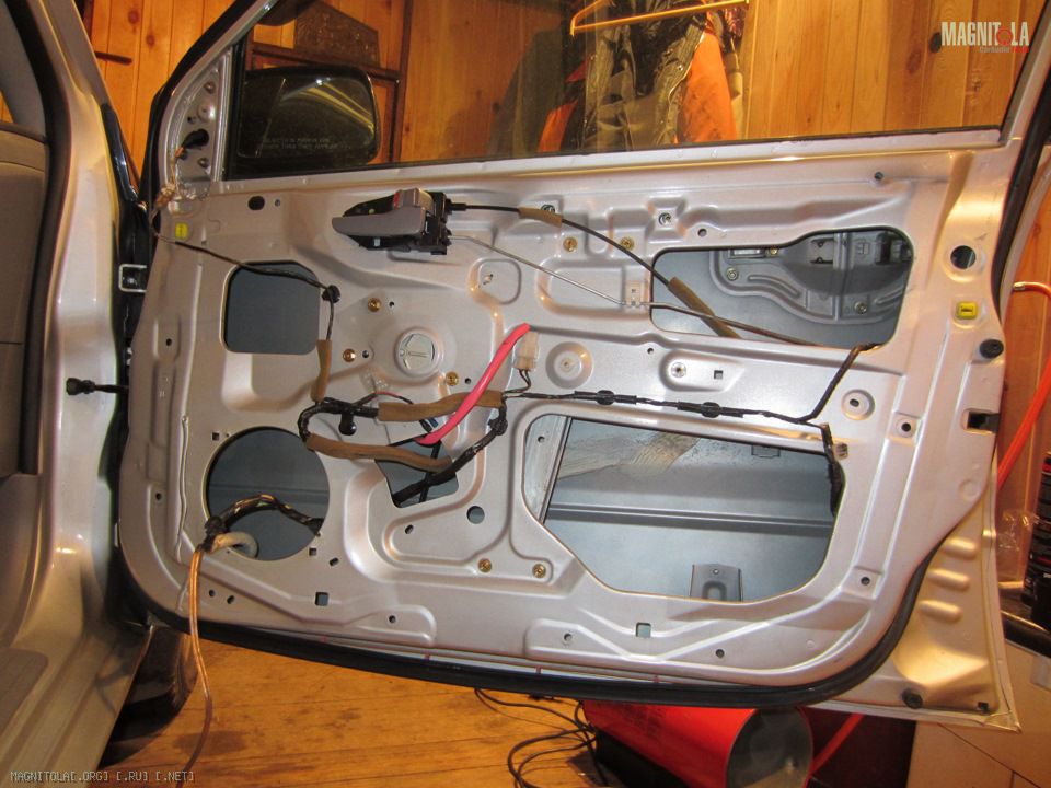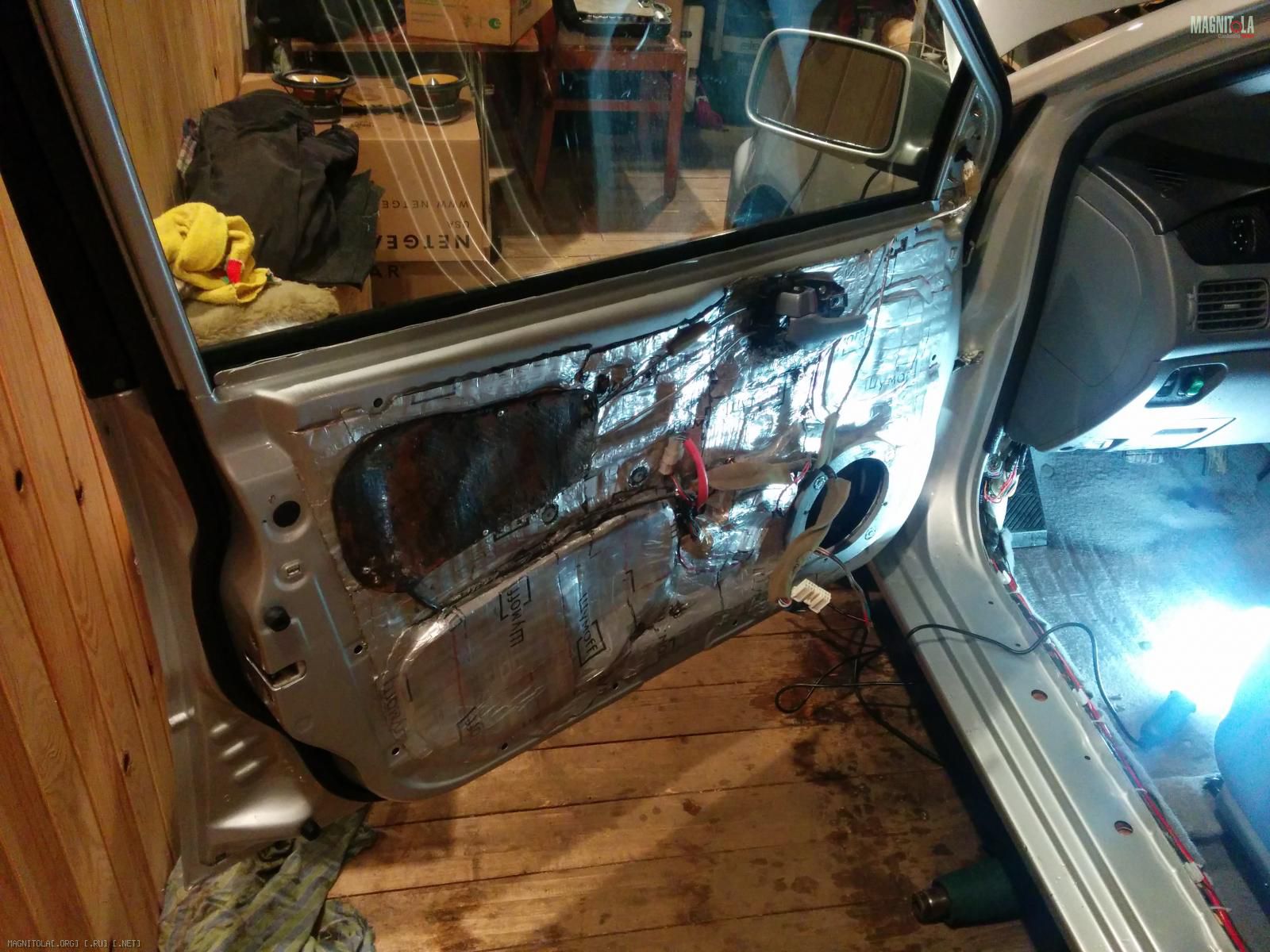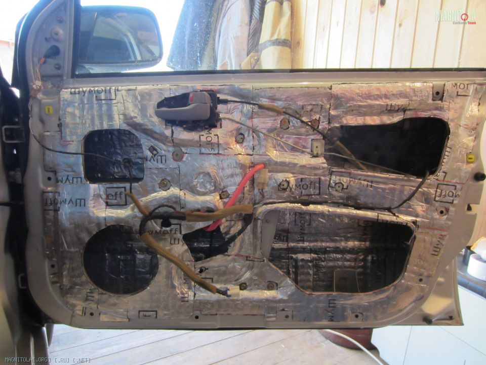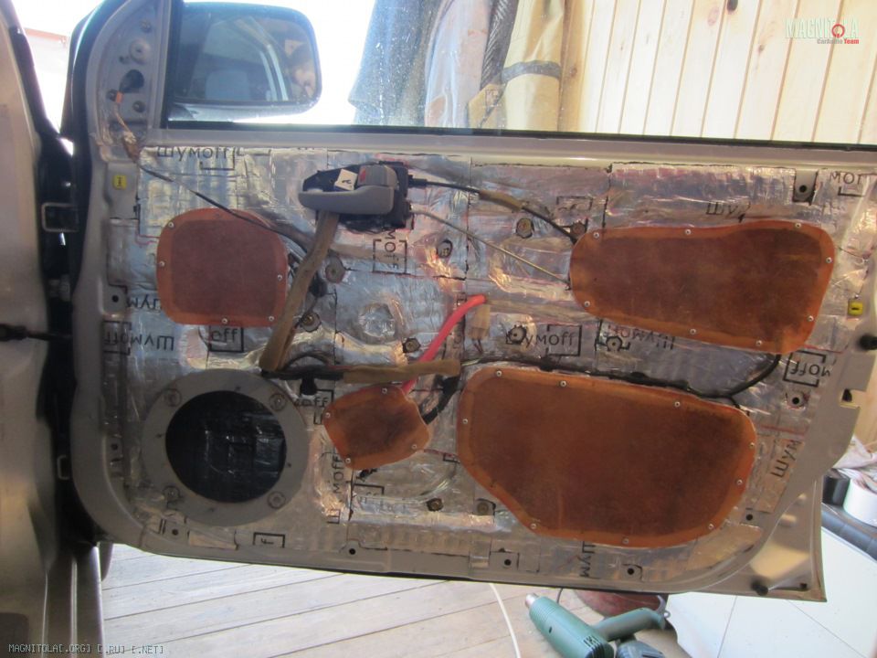 Затем я занялся подготовкой дверей под мидбасы. Тут уже решил опробовать материалы Шумофф. Для усиления металла крепил на стекольный герметик силуминовые полосы толщиной 4мм+ полностью приклеил усилитель двери к металлу. Внутрянка была закатана виброй