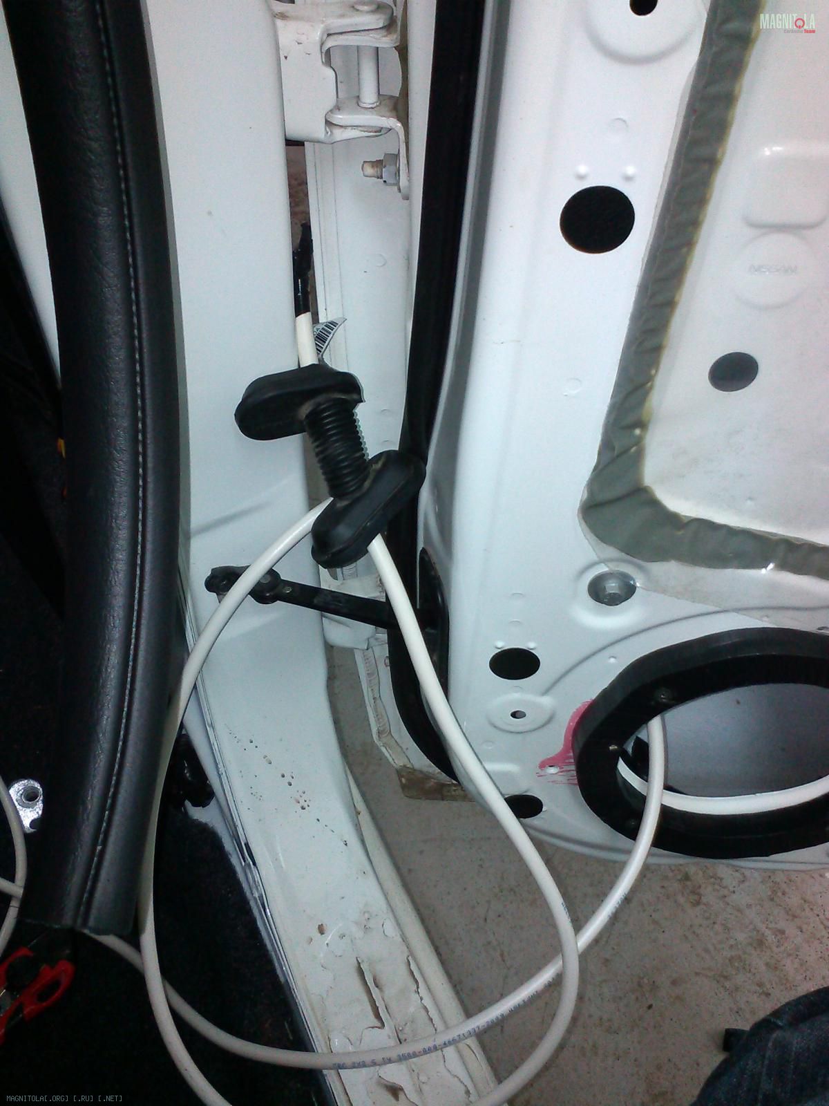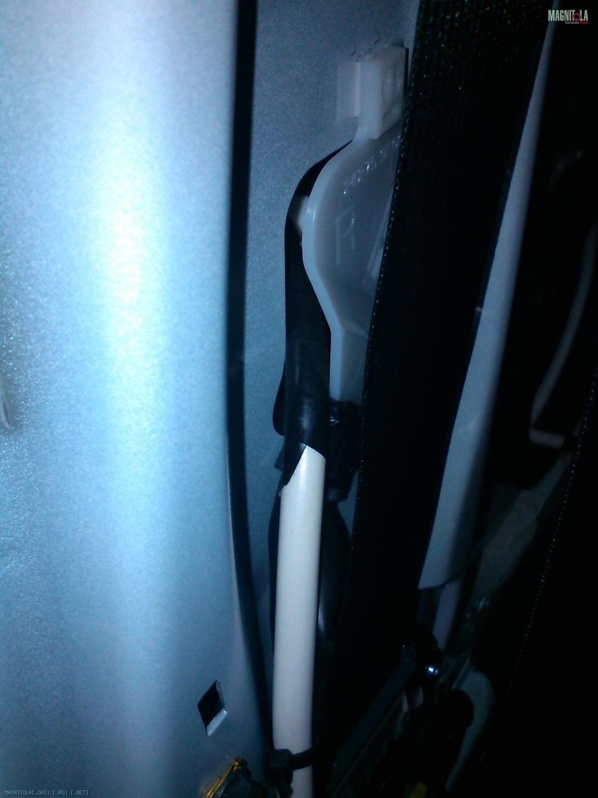 Тыл левый - всё просто он самый ближний, просто увел к двери и прошел вместе со штатными проводами в гофре в дверь. Для прохождения гофры её снимаем, сжимаем и обильно вливаем в неё силиконовую смазку.(фото см.ниже, где фронт)