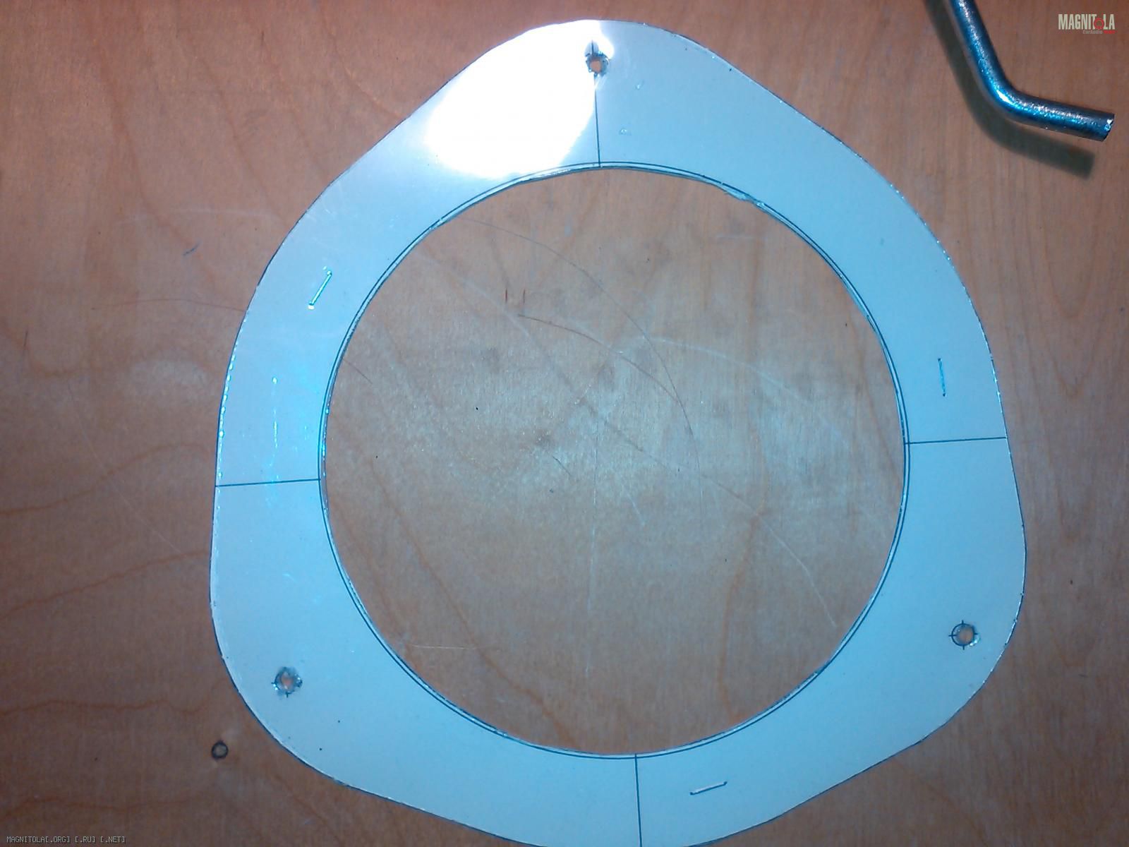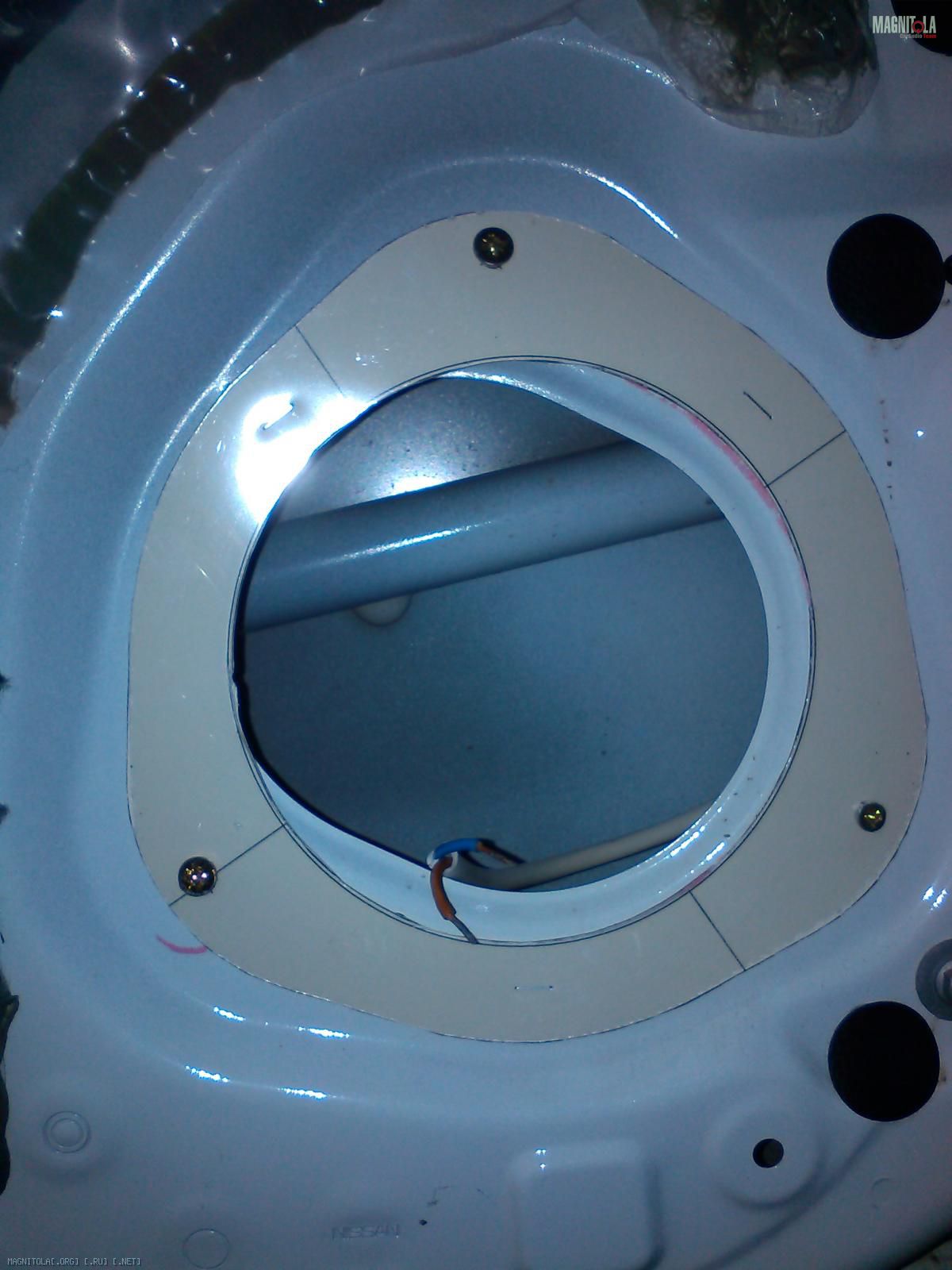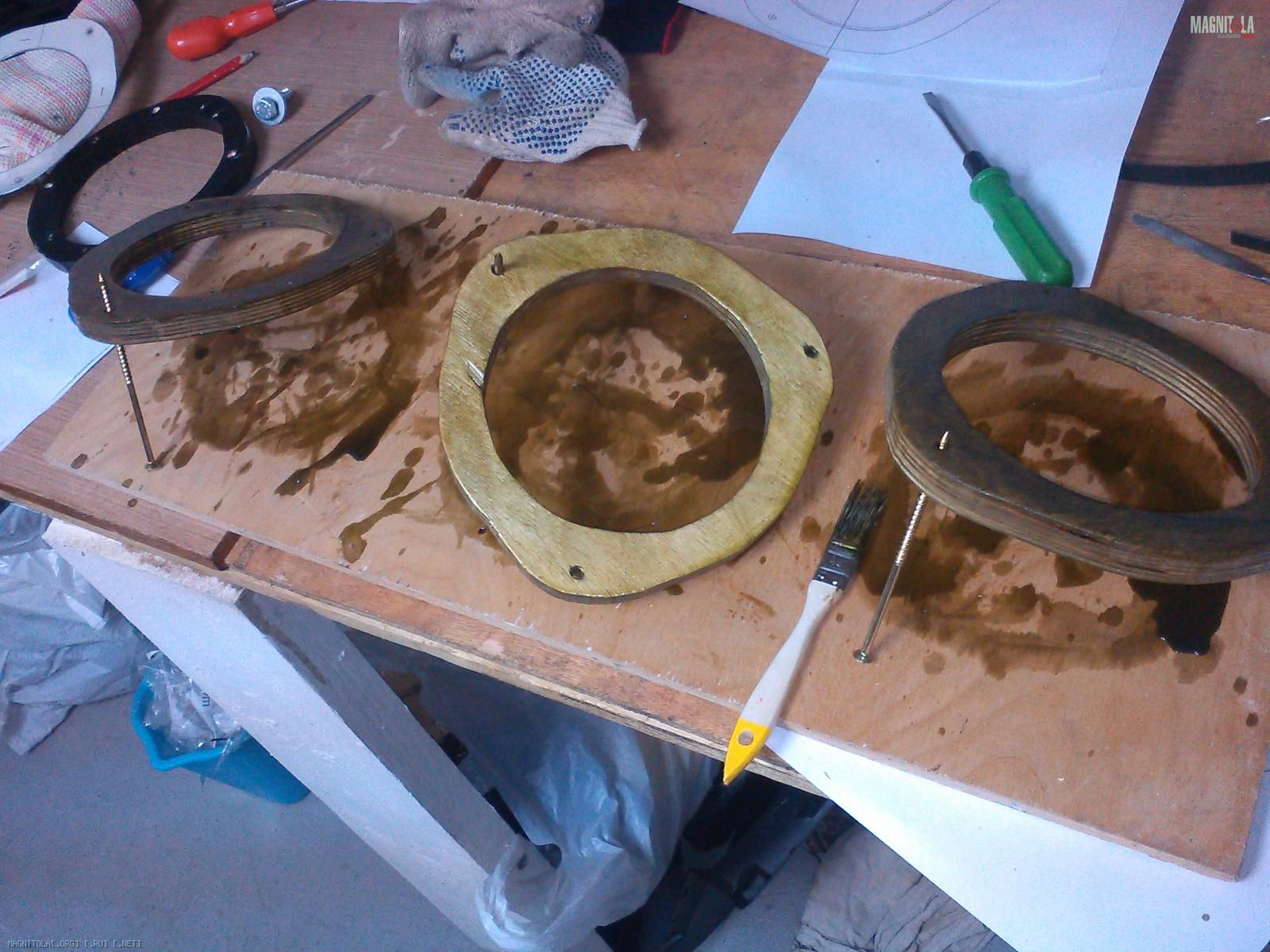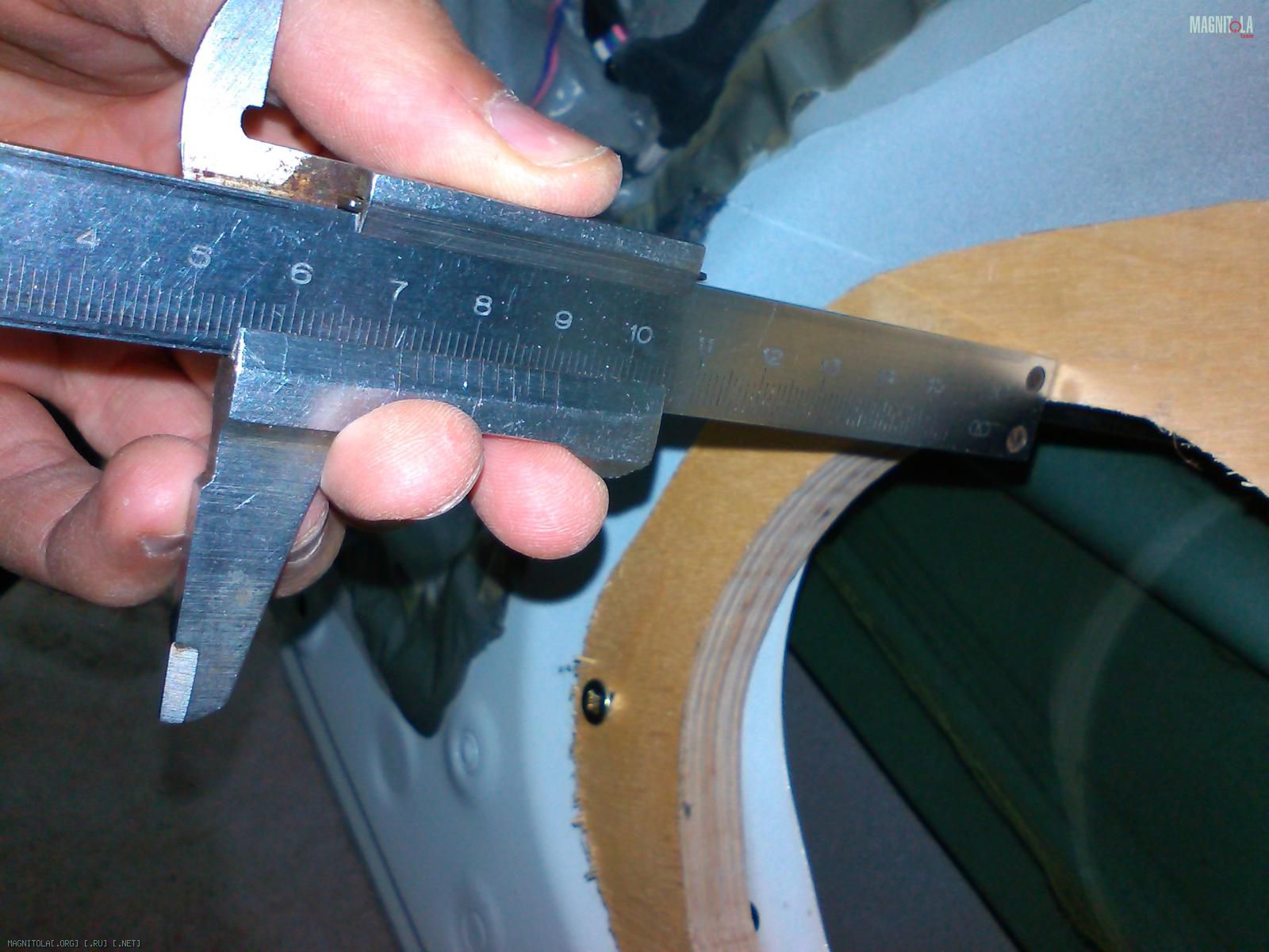 Отверстия под динамик определял опытным путем. Просто вырезал дырку в листе бумаги и замерял её. Крепил (опять-таки по рекомендации RadioMan’а ,с незначитильными отклонениями) следующим набором на каждое отверстие: болт м5х30, шайба м5, с обратной стороны 2 шайбы м8 (чтобы обойти выпуклость), гроверная шайба, шайба м5, гайка. Сами динамики к кольцам крепил саморезами по дереву, 16 и 21 мм в зависимости от толщины самой корзины динамика из расчета максимально возможной длинны, чтобы только-только не пройти насквозь кольца. По идее желательно конечно сделать двойное кольцо (общей толщиной 30 мм), а то и тройное, чтобы динамик не играл под обшивку, которая кстати позволяет туда запихивать много колец (30 мм у ребят в енотов лезет, больше никто не пробовал пока), но во первых мои фронтальные дины со штырями быстрозажимными не позволяют этого сделать, а во вторых я просто поленился. У фронтальных динов контакты торчат так, что толщину более 15 мм просто не «пропустят».