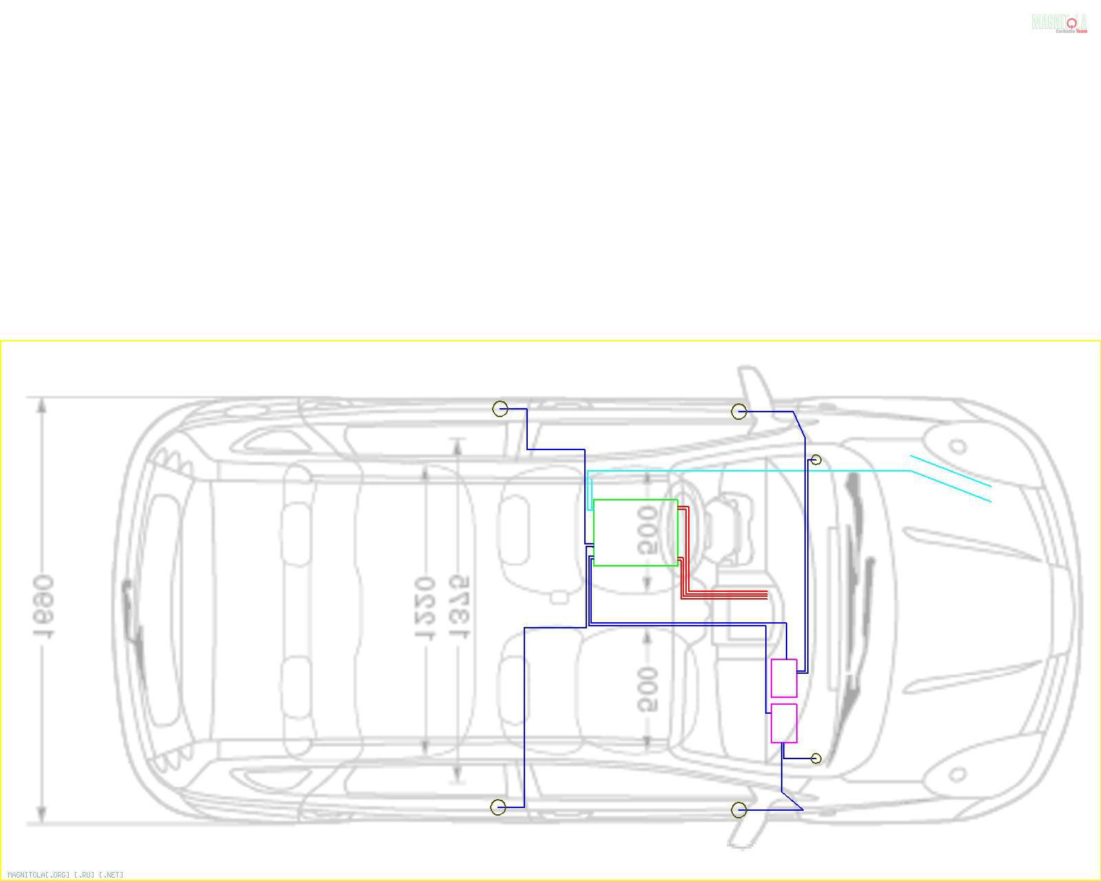 Схема прокладки проводов родилась не сразу. Почему то большинство «енотоводов» ставят усь под пассажирское кресло, однако мне показалось разумнее поставить его под водительское, т.к. за водителем реже садятся пассажиры и тем самым уменьшается вероятность пинания проводов, а так же тот факт, что водительское кресло куда реже двигается, что уменьшает износ проводов на излом. Третий фактор тот, что от водительского кресла ближе до аккума и соответственно меньше силового провода, что безопаснее и дешевле. В общем сплошные плюсы. Кросы решил расположить под бардачком. В принципе не на виду и в случае чего относительно легко доступны. Таким образом определился с расстановкой ключевых компонентов. Вариантов прокладки кабелей было не много и порисовав в автокаде остановился на таком (см.схему).