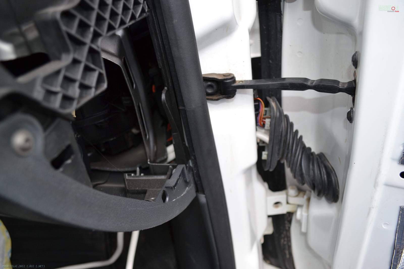Следующий раз, когда будете разбирать дверь, упритесь рукой в край приставки под один с той стороны, которая ближе к центру двери и понажимайте на неё. Вот это место, по хорошему, продавливаться не должно.