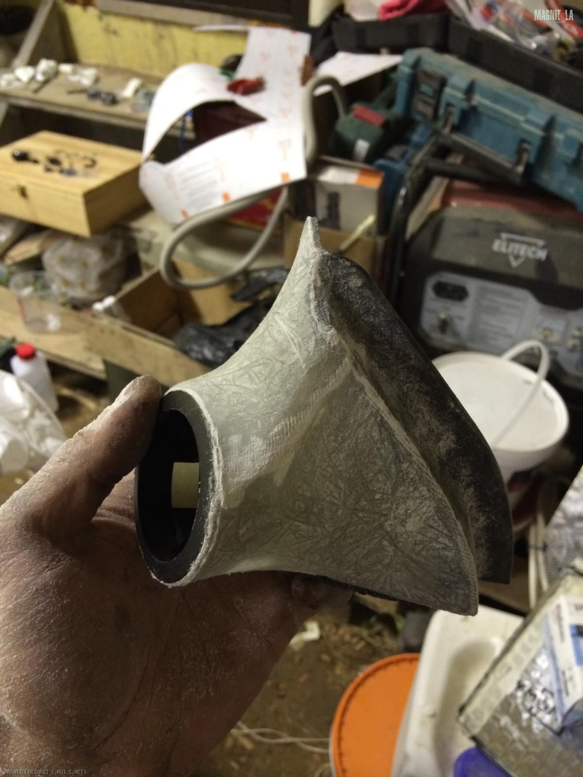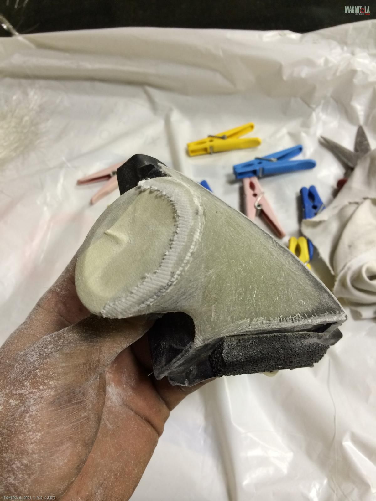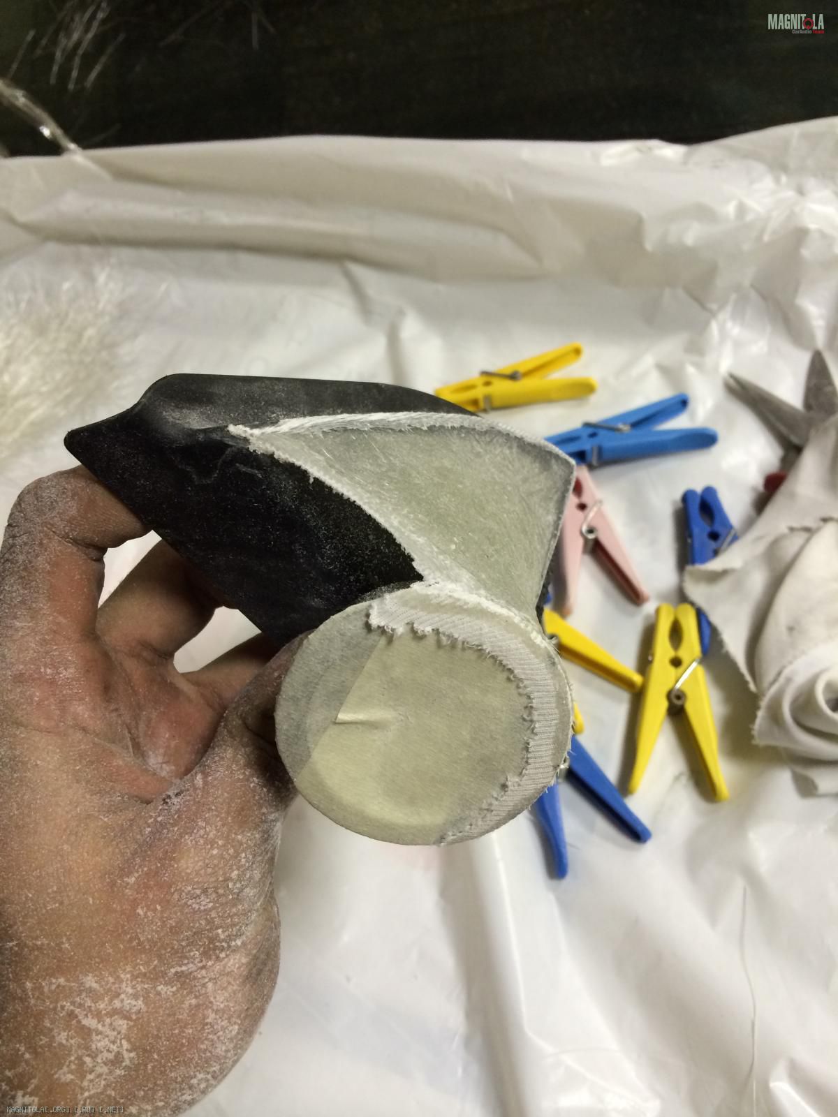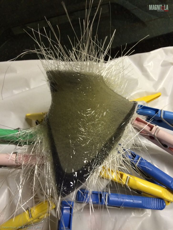 3.1 Взял старую футболку и натянул сначала на одну сторону, пропитал смолой, накидал стекломату, отрезал лишнее, выполнил черновую обработку дремелем.