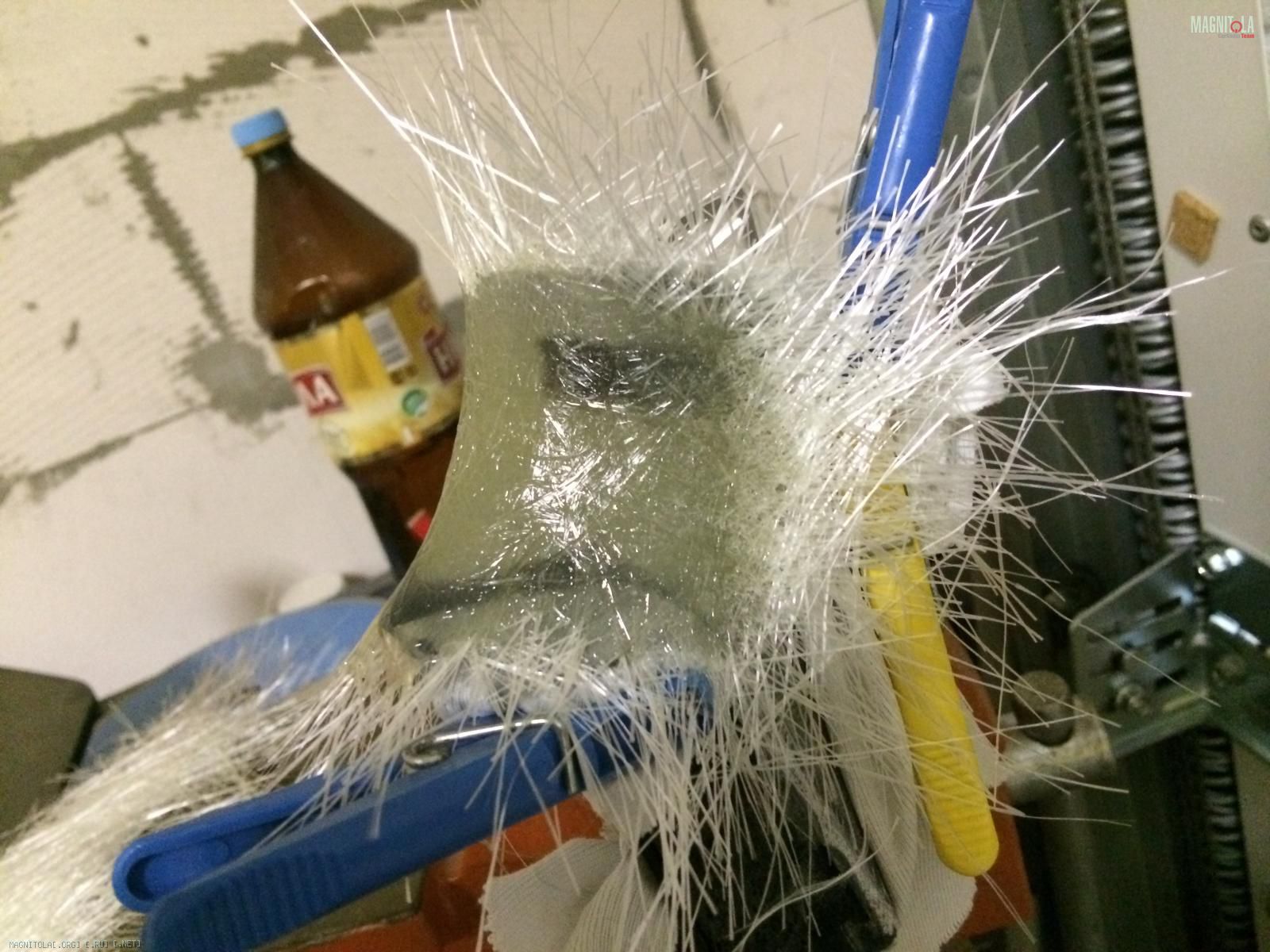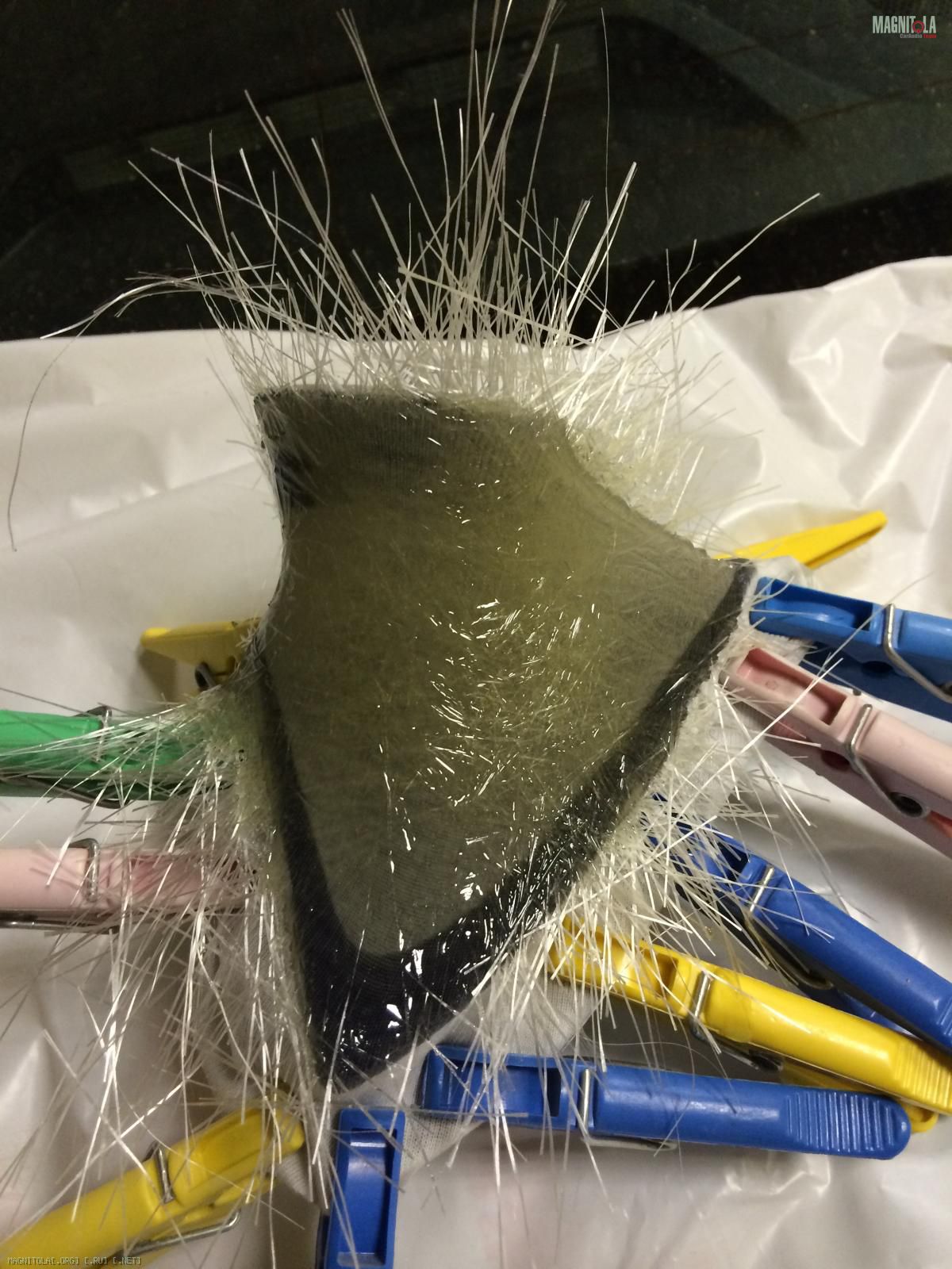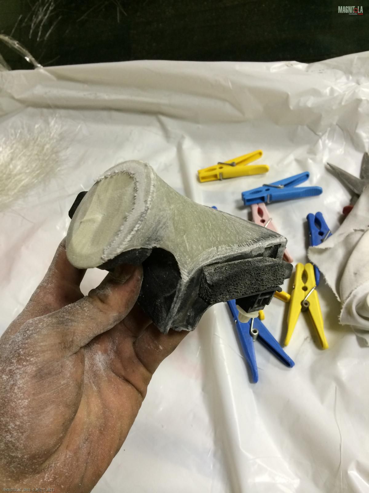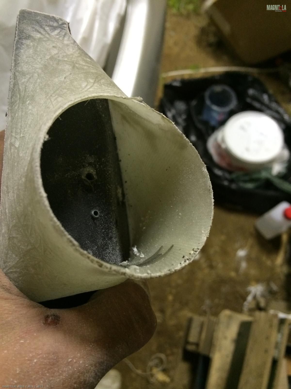 3.1 Взял старую футболку и натянул сначала на одну сторону, пропитал смолой, накидал стекломату, отрезал лишнее, выполнил черновую обработку дремелем.