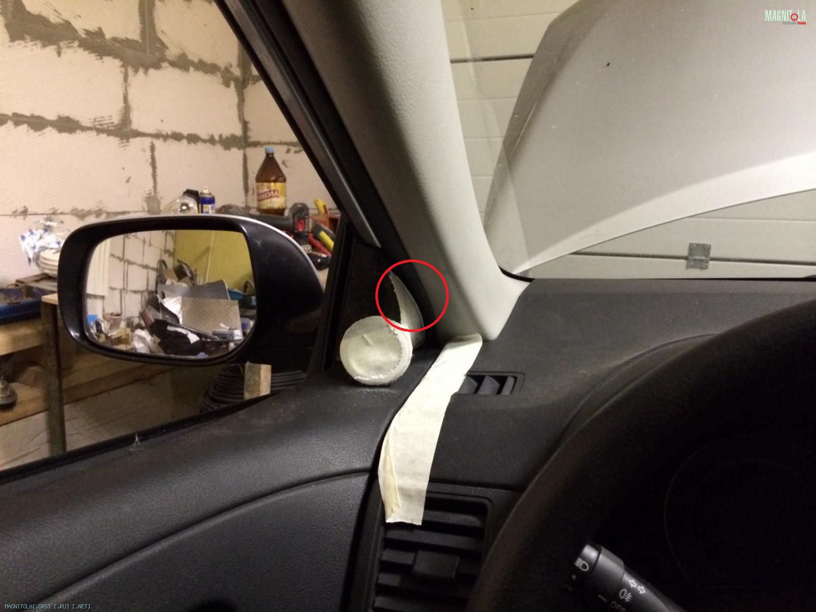 3. И совершил первую попытку сделать уголки под твиттер. Решил направить "в лоб", взял, идущую в комплекте с твиттерами стандартную пластиковую "хрень", прицелился, зафиксировал.