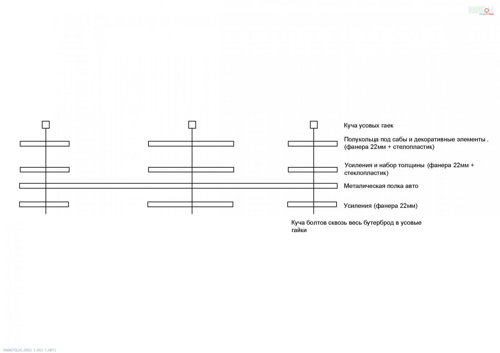Что то всё не так. ))) Основную, несущую, полку делай снизу. К ней приклеивай, прикручивай кольца. Кольца такой высоты что бы сабы поднялись в салон на нужную высоту. А сверху уже из смолы декоративную часть полки. Крепишь сначала нижнюю полку к металлу, затем верхнюю. Болты верхней части прячешь в недрах полки, так что бы они не крутились. И отверстия в ней делаешь чуть меньше диаметра саба. Тогда вандалы не скрутят через салон. Ну, в теории всё просто )))