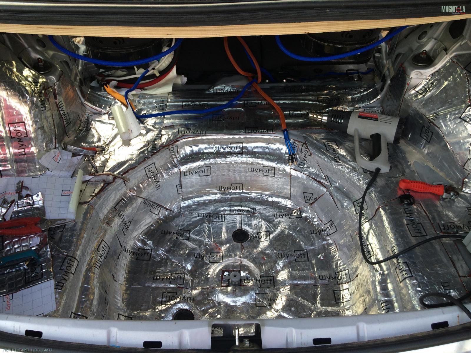 Позвал на выходных друга в помощь и начали "шумить" багажник. Вообще думал что будет проще. Начали часов в 14-15, закончили в 3:30 ночи) Пришпарил руку феном... Фоток опять маловато вышло(