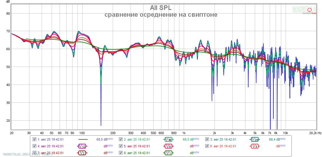 Для начала, вот АЧХ (то есть, зависимость амплитуды сигнала от частоты) из авто с разным сглаживанием: