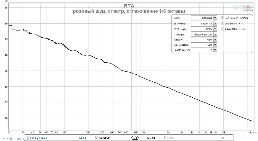 Естественно, анализатор на розовом шуме выдает горизонтальную прямую, но от количества диапазонов (1/48, 1/6, 1/3) наклон прямой не зависит.