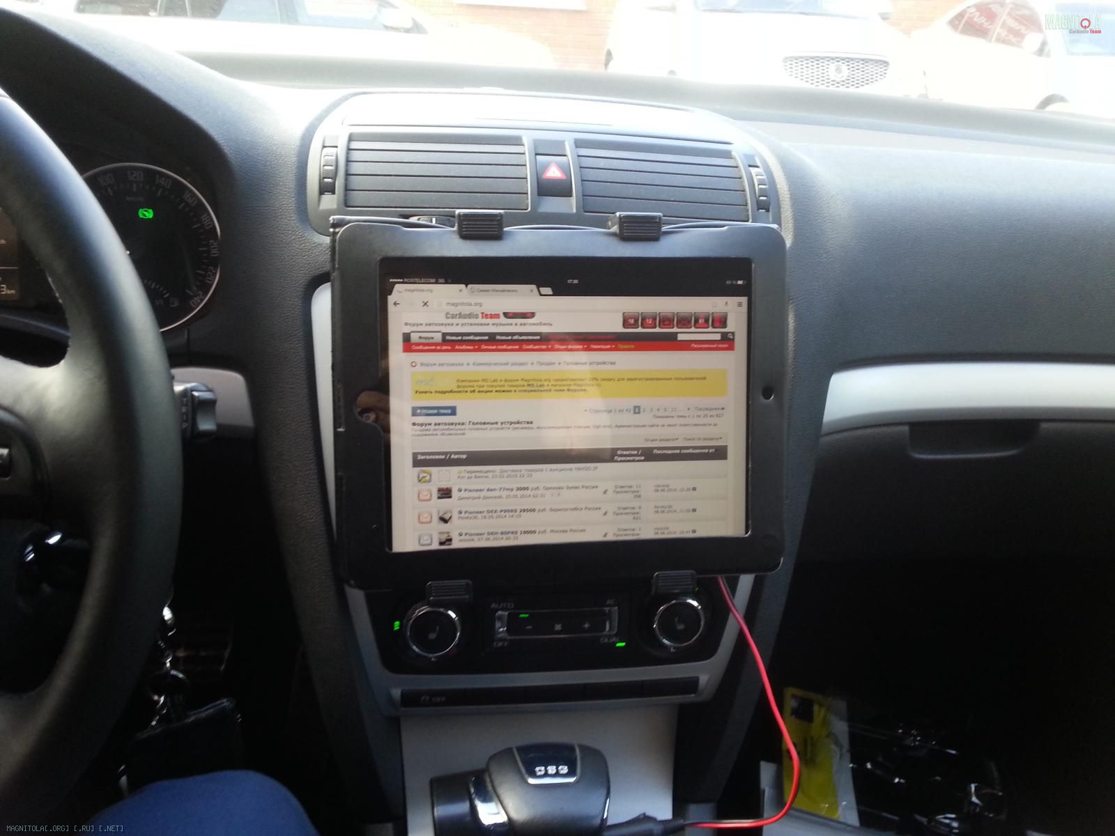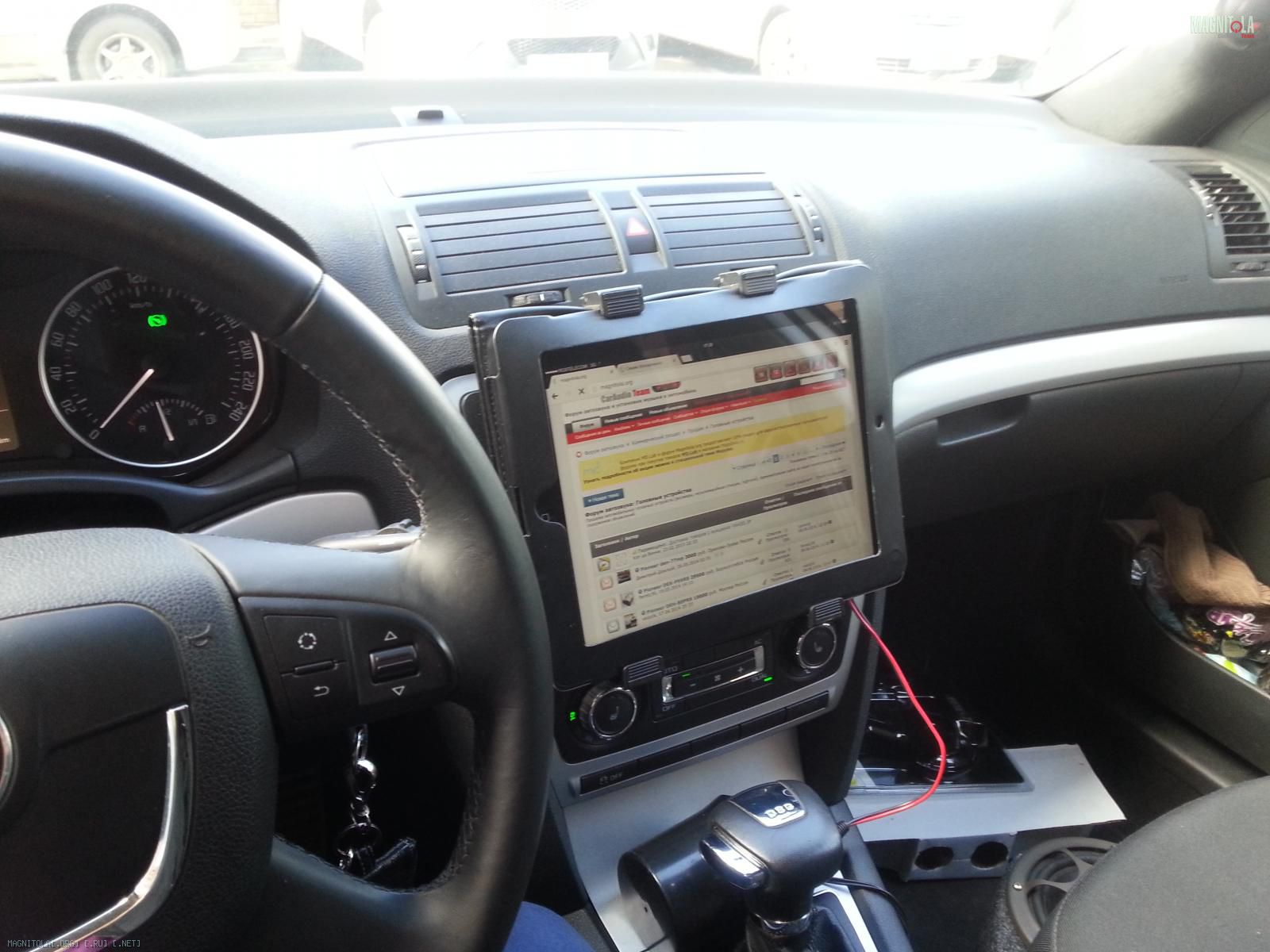 В Октавии же сверху, по центру торпедо есть кармашек, правильно. Можно туда приклеить кругляшок для присоски. На присоску наклеивать держатель для ipad. В этот же кармашек вывести зарядку для ipad. Получится удобное решение, легко управлять, легко смотреть, удобно смотреть.