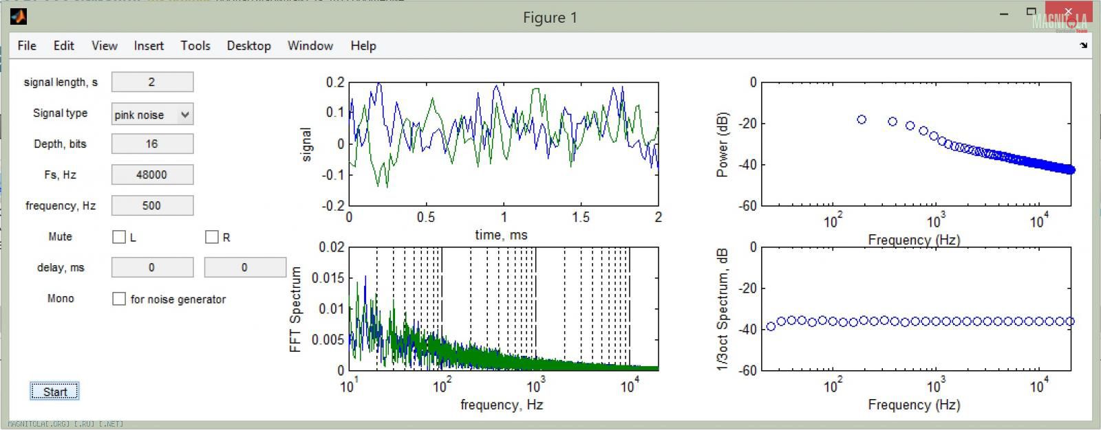 Пока был на конференции в Кракове, не только яблок наелся (никому не назло, а потому что вкусные), но и написал программку-генератор сигналов. В ней, в частности, помимо полярных прямоугольных импульсов, банальных синусов со сдвигом фаз в левом и правом каналах, теперь есть генераторы белого и настоящего розового шума =).