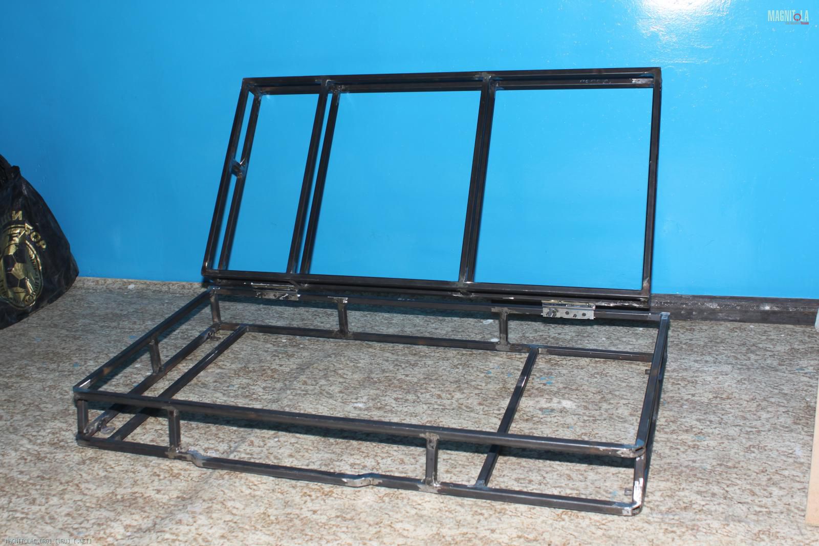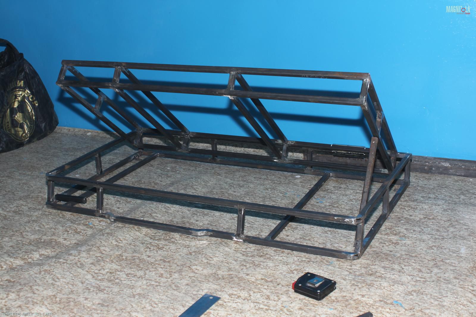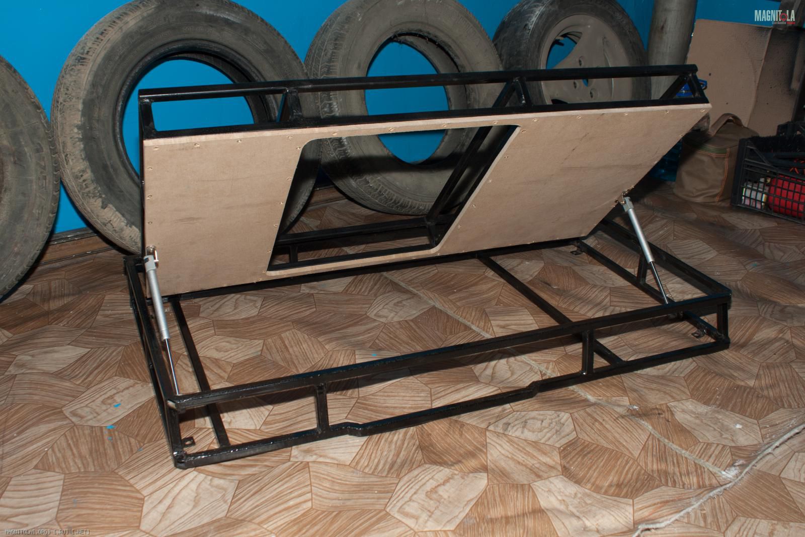 Система будет состоять из внешней рамы, которая будет жестко закреплена на кузов, и внутренней рамы, в которой будет усилитель и саб, конструкция будет открываться для доступа к сапаске.