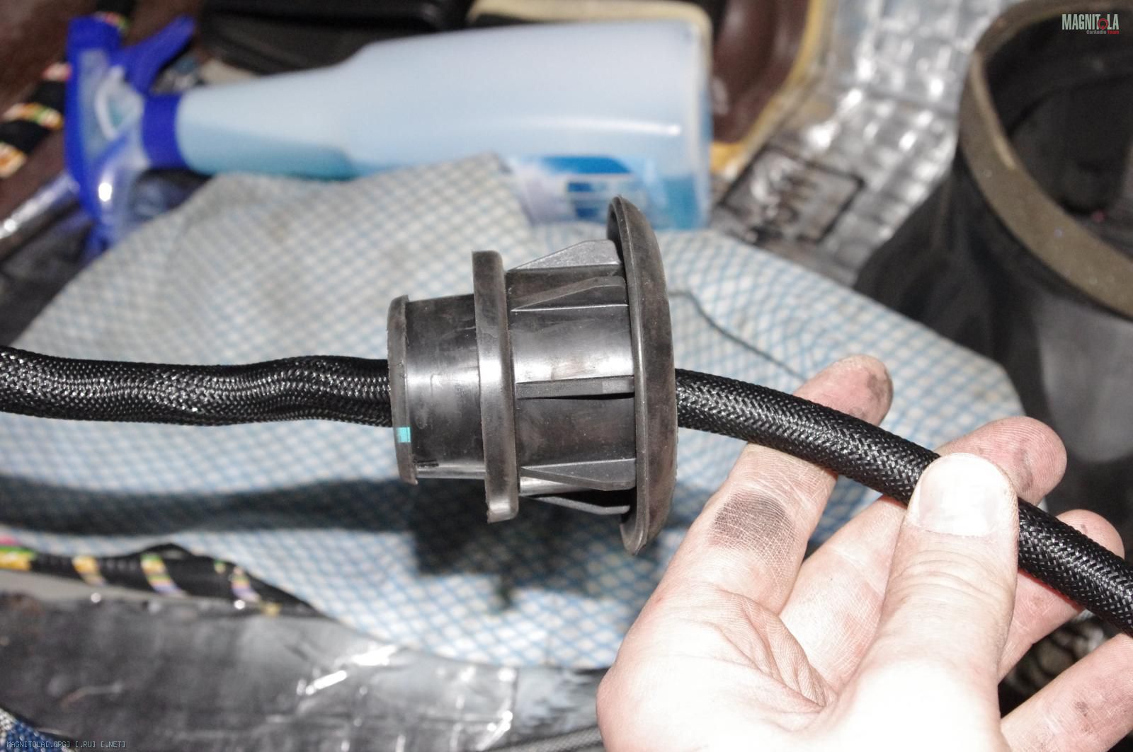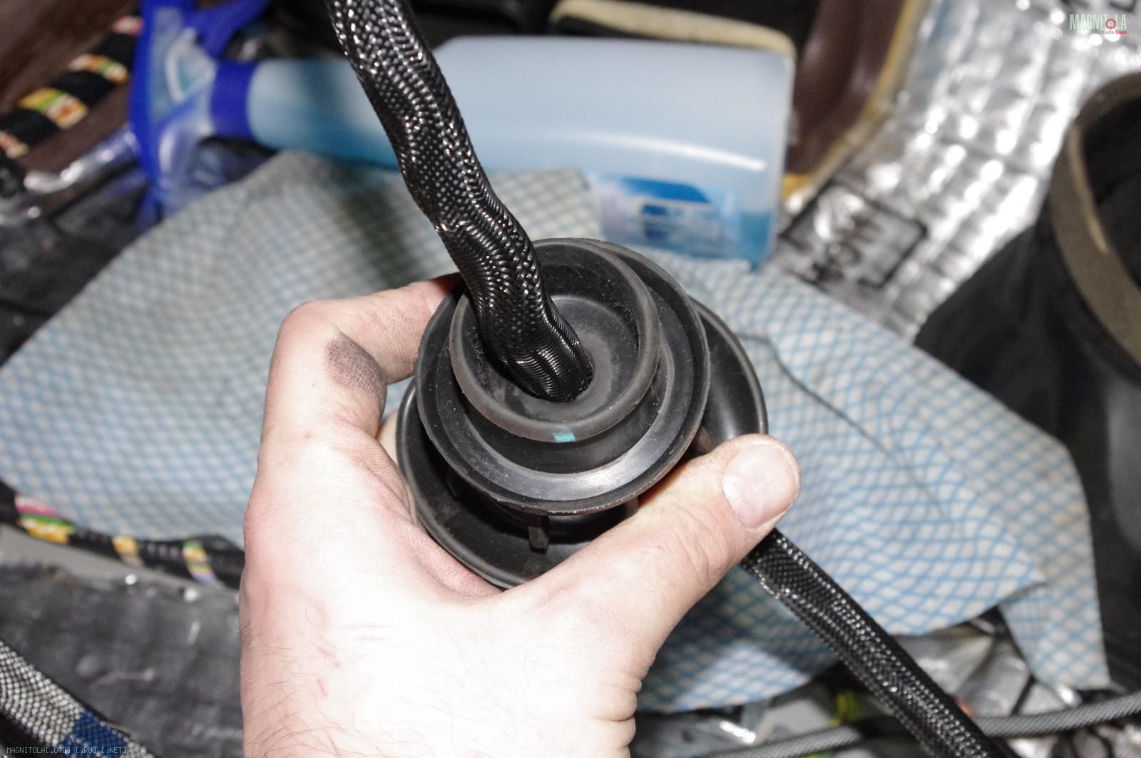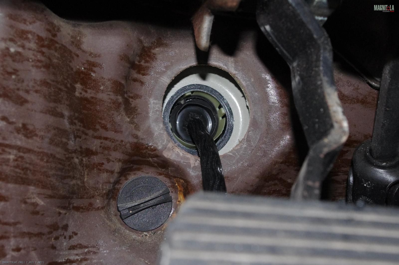 Параллельно я занимался облагораживанием прохода кабеля питания в моторный отсек. Под капот я заходил через отверстие под педаль сцепления. Чтобы защитить кабель от контакта с металлическими кромками, используем штатную заглушку