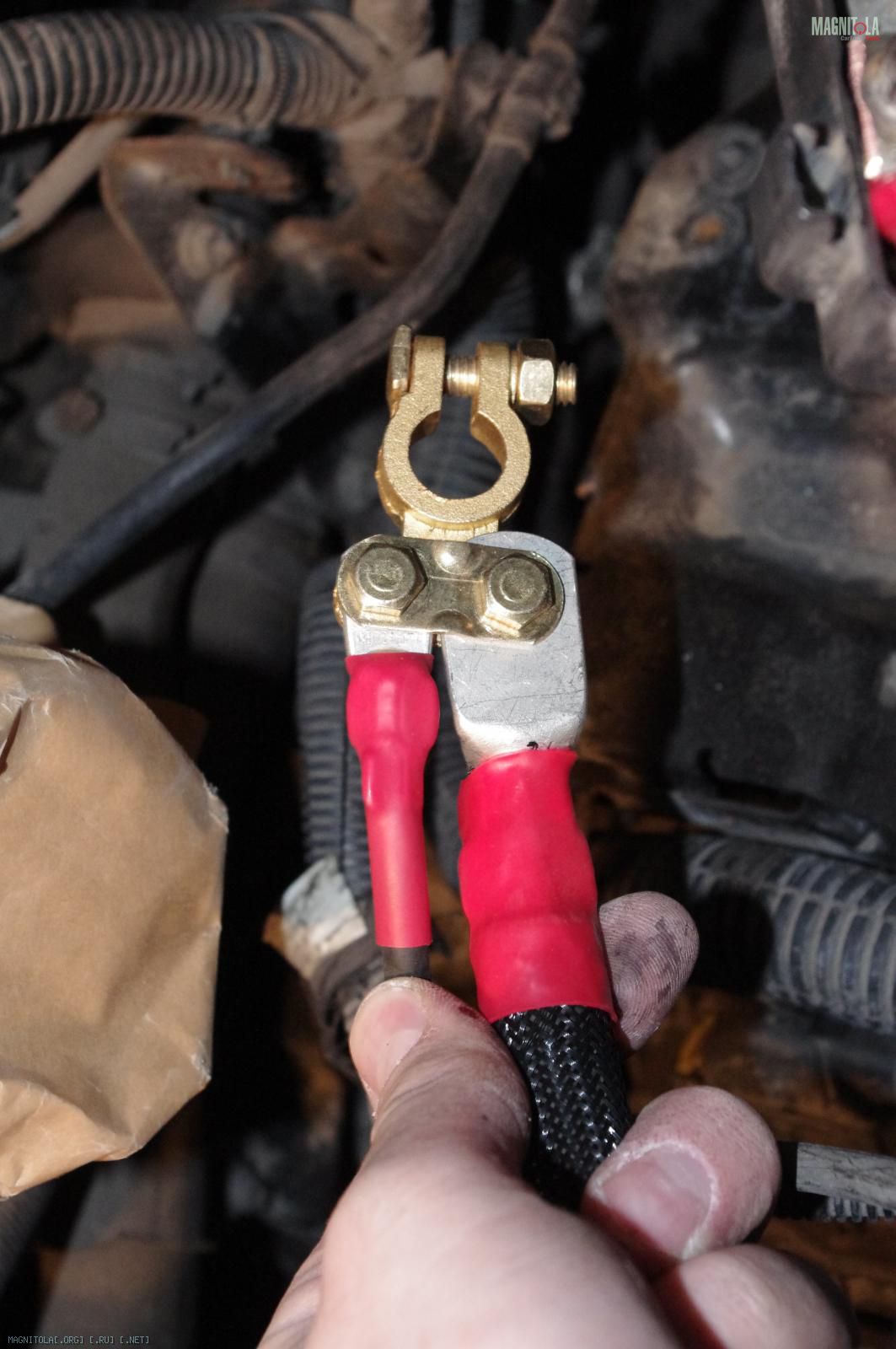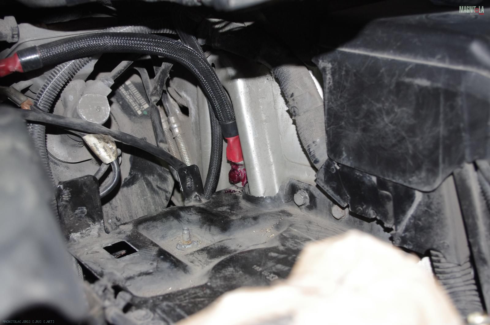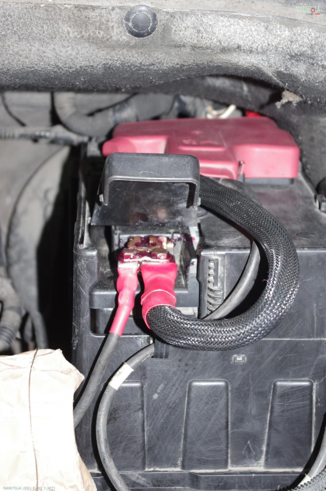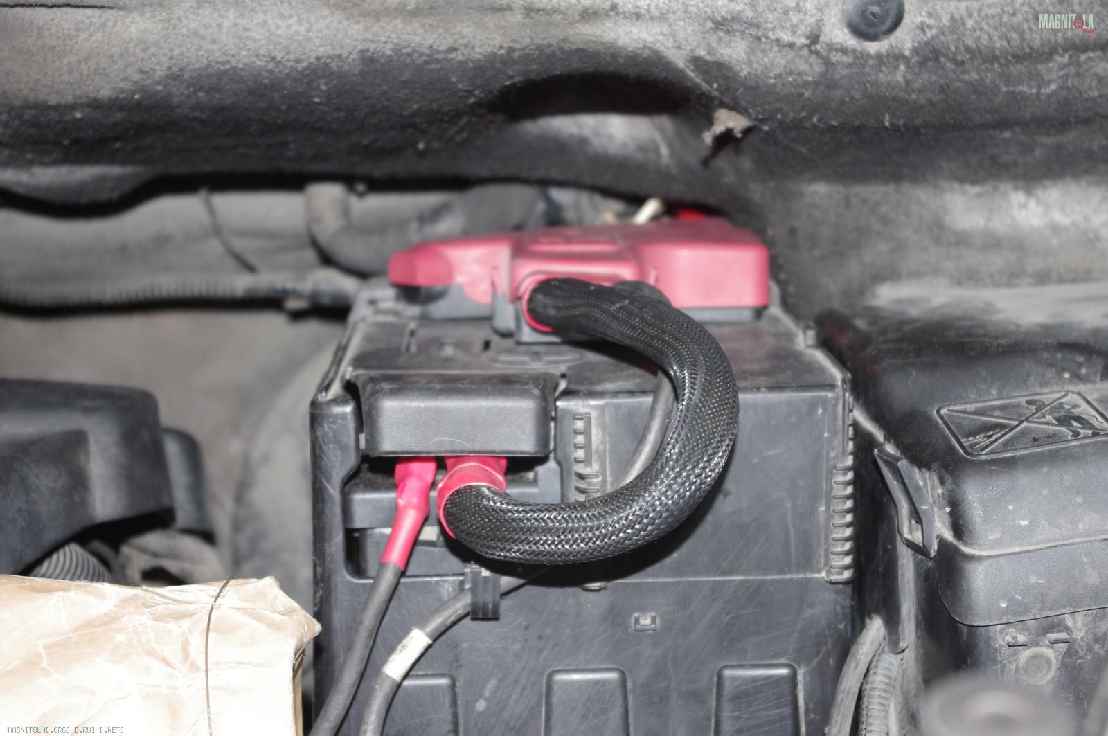 и расстраиваемся:( Ибо при таком расположении дополнительного кабеля массыне защёлкивается крашка аккумуляторного отсека, на которую крепится штатный распределитель питания. Время было уже далеко заполночь, поэтому на этом работы под капотом мы закончили.